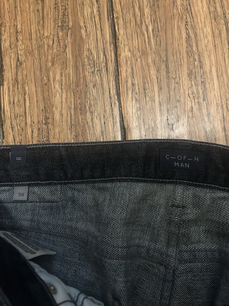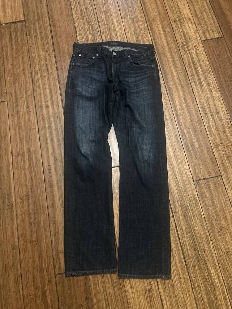These are blue Citizens of Humanity jeans in a solid pattern with a medium fabric wash. They feature a button closure and a low rise fit. Made of cotton, these regular fit jeans are a size 34 for women. The jeans have a straight style with a zipper accent, offering both style and comfort.