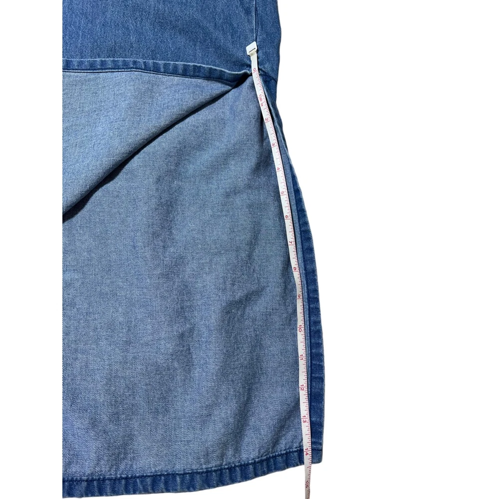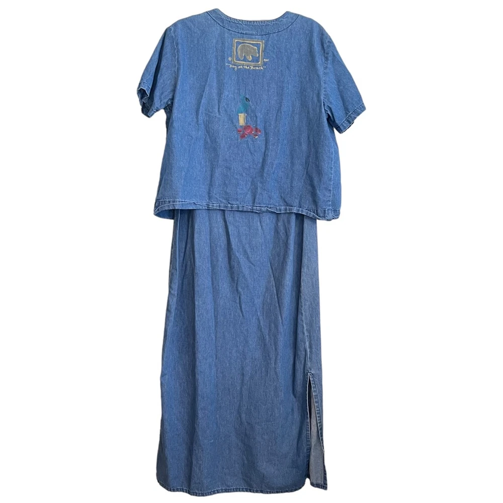 Blue Eyed Bear Denim Dress Set with Short Sleeve Top Womens Medium Chambray 90s Art to Wear Hand Painted Blocked in Naples Florida. Sheath style square neck dress with short sleeve button front top. In good pre-owned condition! No stains, tears or other signs of wear noted. Please see photos for more details and approximate measurements. Sold as pictured. Thanks for looking!