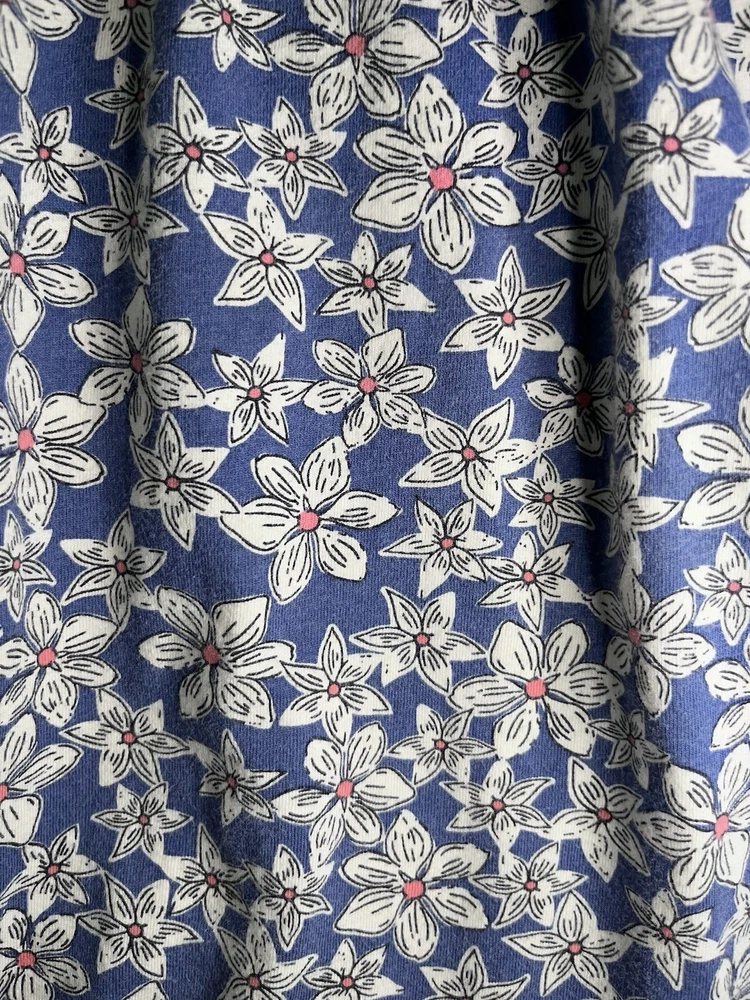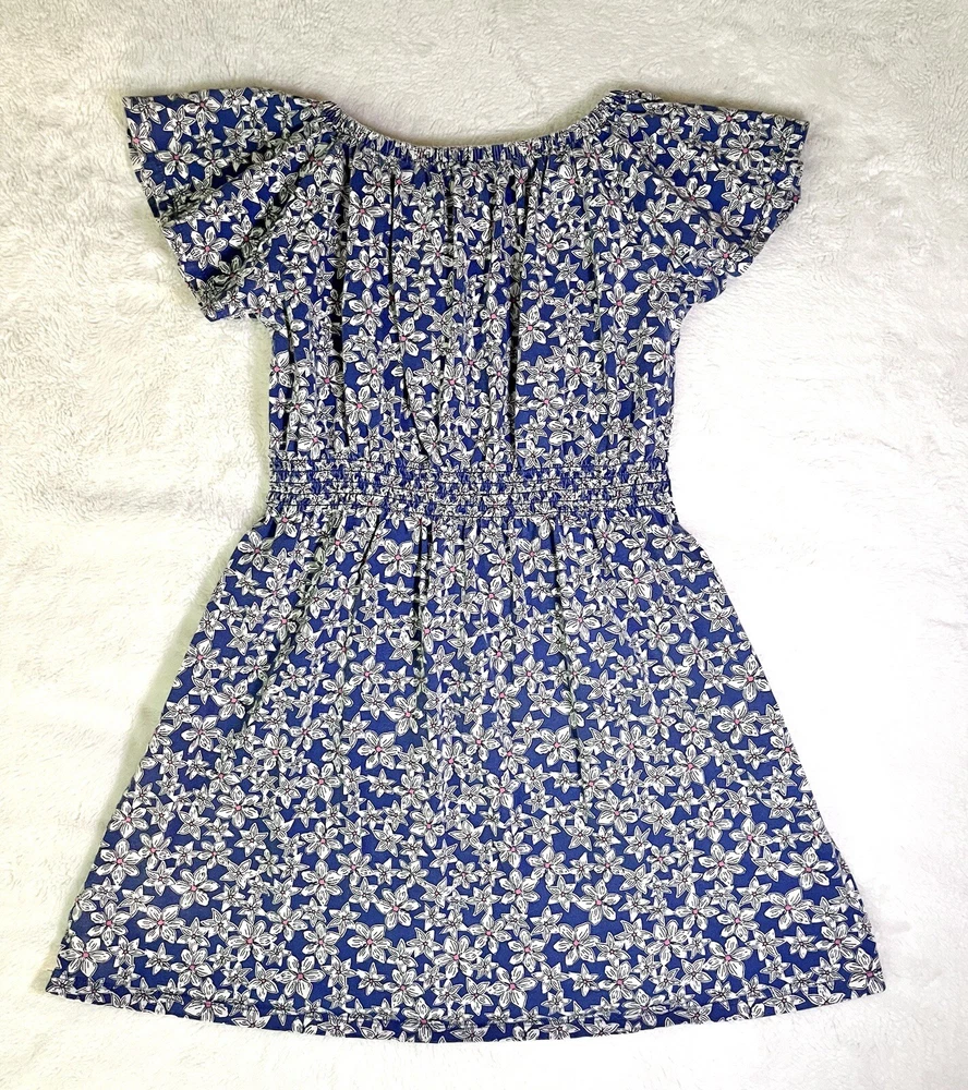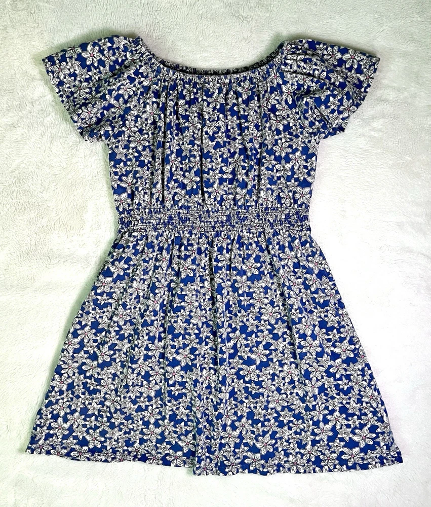 Gap brand blue dress with white floral pattern. The flowers have a pink center. The dress is a girls size Large. The midi length dress has flutter sleeves and the waist is gathered / ruched with 5 lines of elastic thread. Measures 26 1/4” longer from shoulder to hem. The dress is 100% Cotton and is machine washable. The dress is in excellent pre-owned condition. It is clean with no stains, rips, or tears. The size and care tag is still attached. Buying from the original owner. Comes from a smoke free and pet free home.
