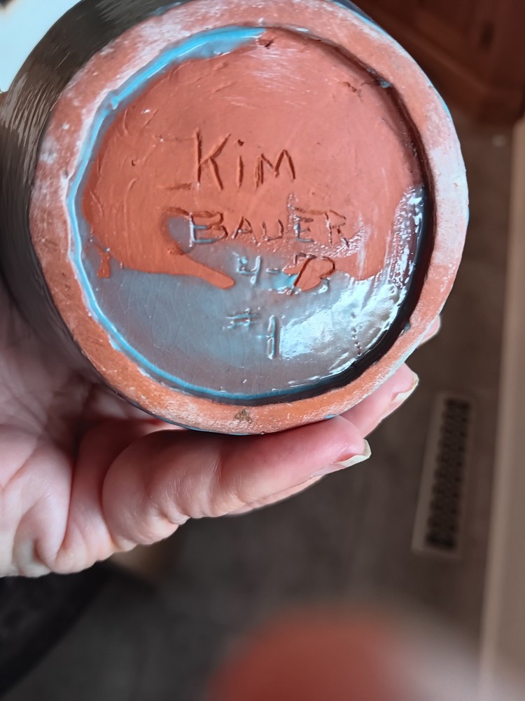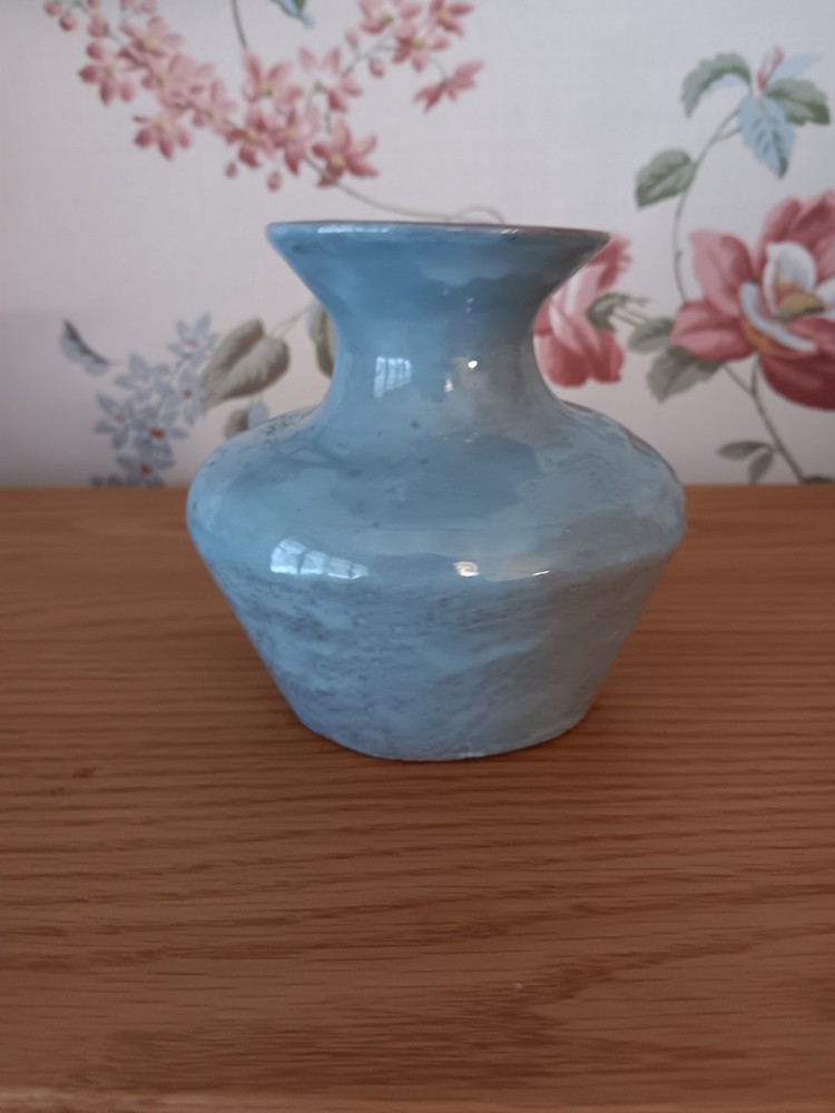 Pretty bright blue vintage pottery vase, handmade, signed, dated and numbered. Measures approximately 4" high, and finished with a gorgeous blue glaze, sure to receive many compliments wherever you choose to display it!