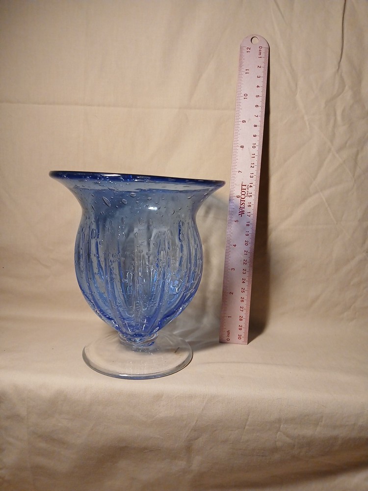 This Blue Hand Blown Glass Hurricane Pedestal Candle Holder stands at 6.5" tall, making it a medium-sized decorative piece perfect for a living room. The elegant blue color and unique pedestal shape add a touch of sophistication to any space. Made of glass, this candle holder is suitable for pillar candles and is a free-standing design that does not require additional parts for use. The Hurricane brand ensures quality and style for a beautifully lit ambiance in your home.