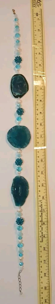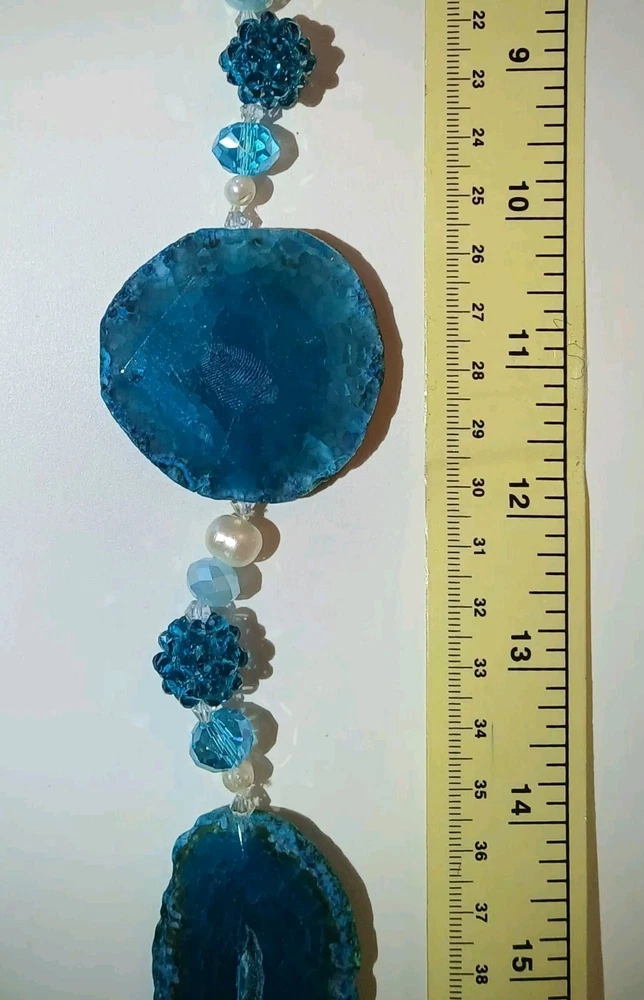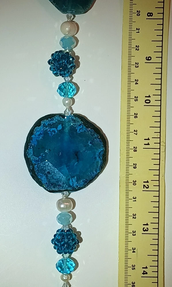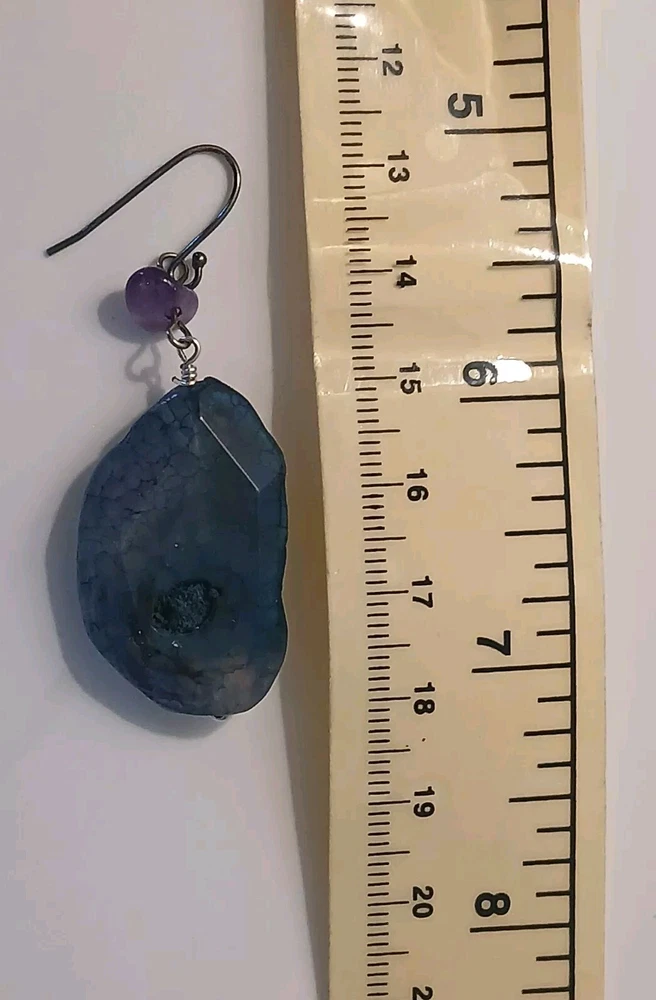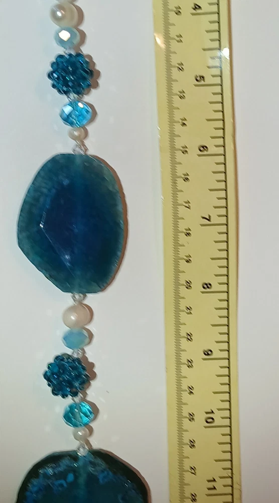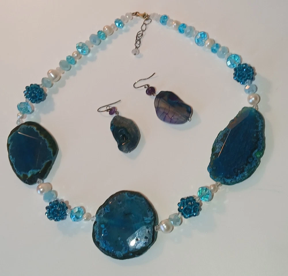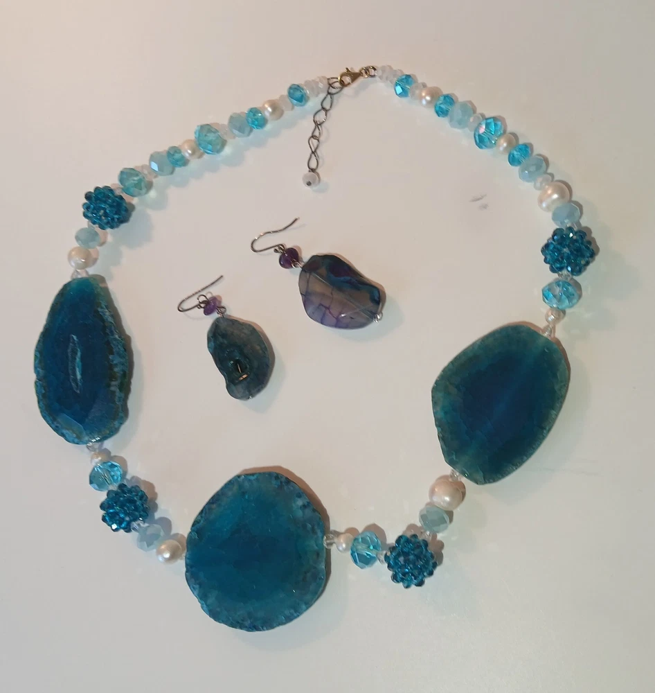 Blue lace agate necklace with earrings Costume jewelry with plastic blue and white adornments and real blue lace agate stone. The necklace is 23" long Earrings: The stones are 1" long on each . With hook 2" long. Earing: The earing with the purple hue, the hook was bent. I straightened it but can't get it perfect. Necklace: I replaced the lobster clasp the original one would not close all the way. I recieved this as a set. After a closer look I'm not 100% sure the earings are blue lace agate. You can see one has light blue marbled in, but, is also translucent. The other earing more of a purple hue and also transluscent. Blue Lace Agate is a type of mineral from the quartz family, characterized by its light blue and white banding that resembles lace. It is known for its calming properties and is often used to promote effective communication and relieve stress as well as assist with work life balance.
