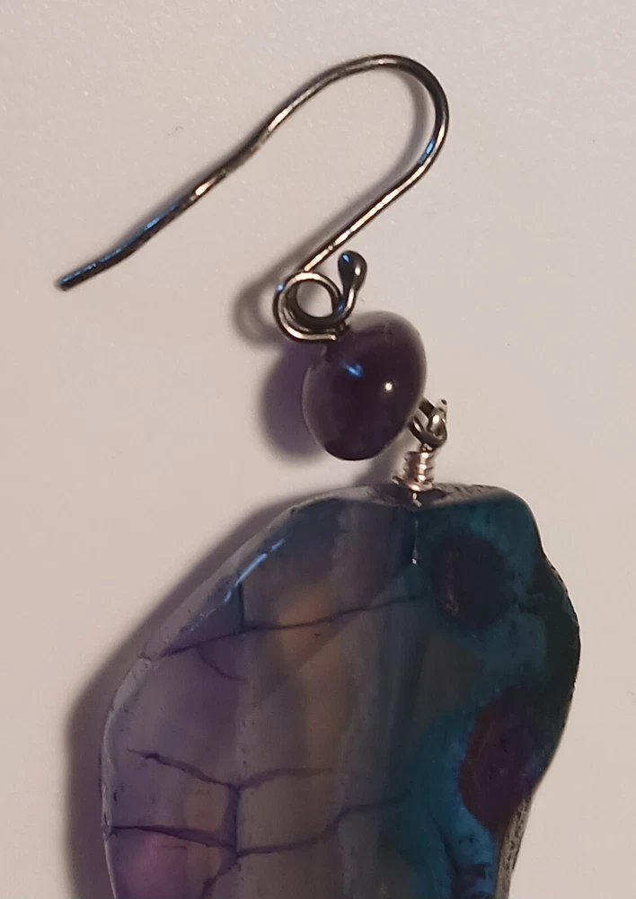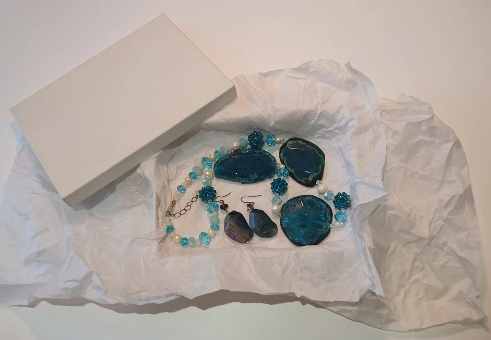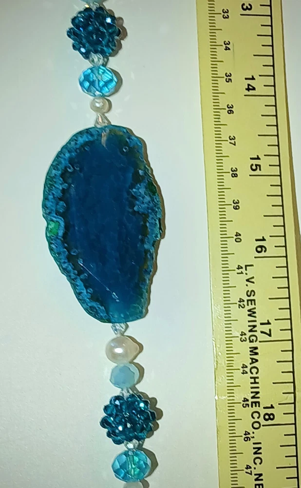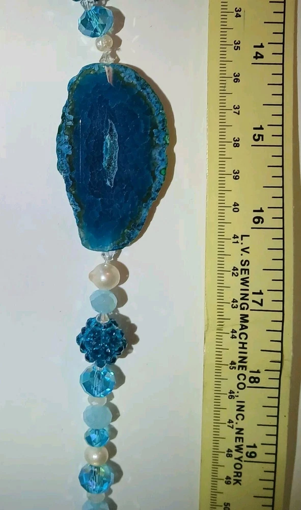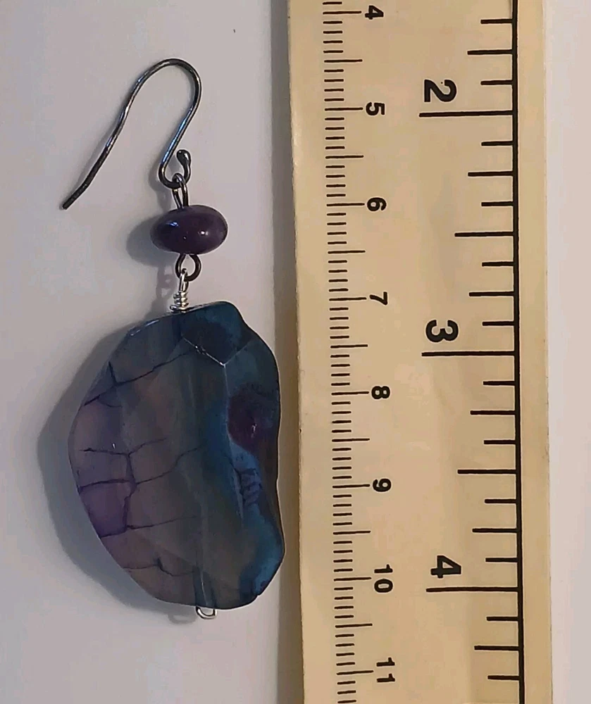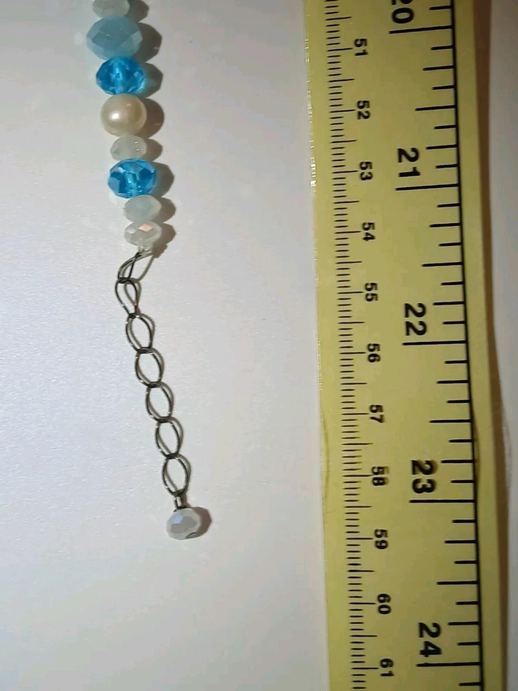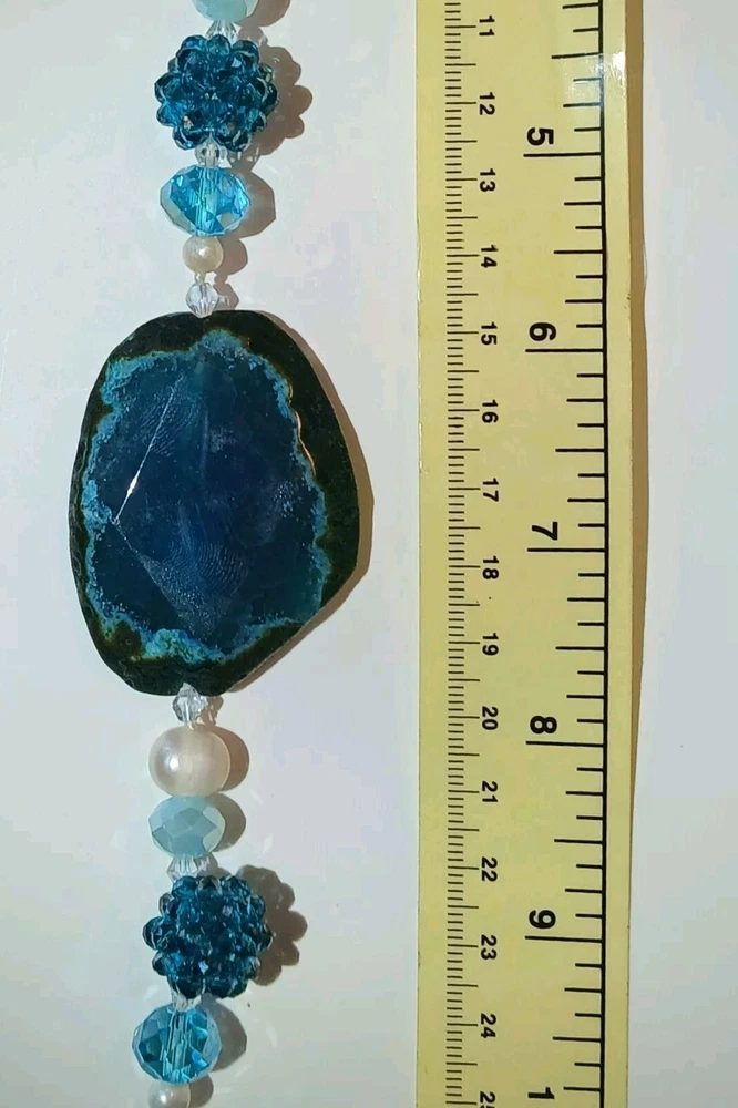 Blue lace agate necklace with earrings Costume jewelry with plastic blue and white adornments and real blue lace agate stone. The necklace is 23" long Earrings: The stones are 1" long on each . With hook 2" long. Earing: The earing with the purple hue, the hook was bent. I straightened it but can't get it perfect. Necklace: I replaced the lobster clasp the original one would not close all the way. I recieved this as a set. After a closer look I'm not 100% sure the earings are blue lace agate. You can see one has light blue marbled in, but, is also translucent. The other earing more of a purple hue and also transluscent. Blue Lace Agate is a type of mineral from the quartz family, characterized by its light blue and white banding that resembles lace. It is known for its calming properties and is often used to promote effective communication and relieve stress as well as assist with work life balance.