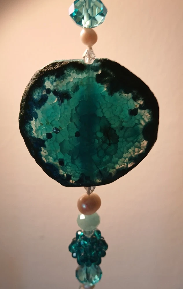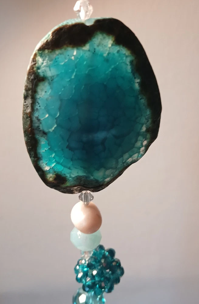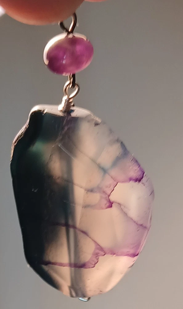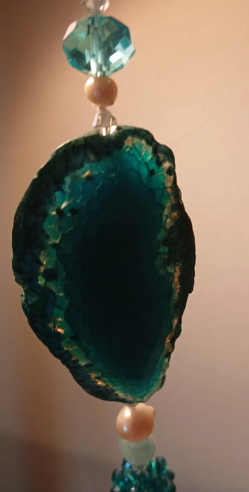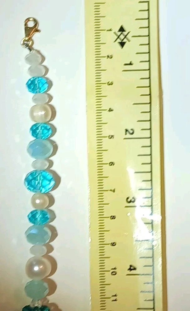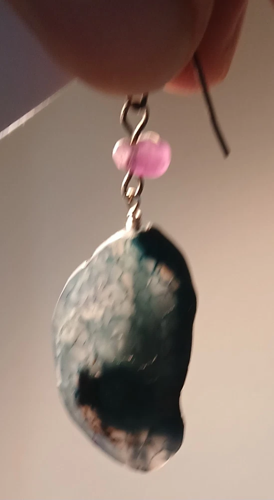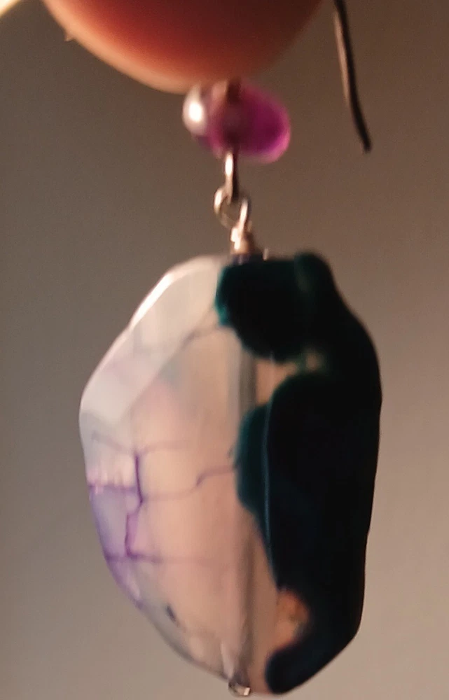 Blue lace agate necklace with earrings Costume jewelry with plastic blue and white adornments and real blue lace agate stone. The necklace is 23" long Earrings: The stones are 1" long on each . With hook 2" long. Earing: The earing with the purple hue, the hook was bent. I straightened it but can't get it perfect. Necklace: I replaced the lobster clasp the original one would not close all the way. I recieved this as a set. After a closer look I'm not 100% sure the earings are blue lace agate. You can see one has light blue marbled in, but, is also translucent. The other earing more of a purple hue and also transluscent. Blue Lace Agate is a type of mineral from the quartz family, characterized by its light blue and white banding that resembles lace. It is known for its calming properties and is often used to promote effective communication and relieve stress as well as assist with work life balance.
