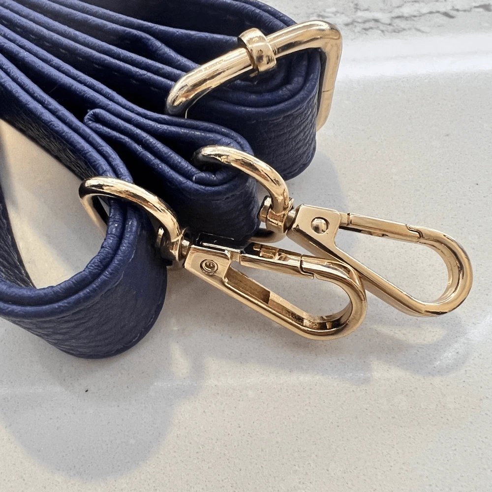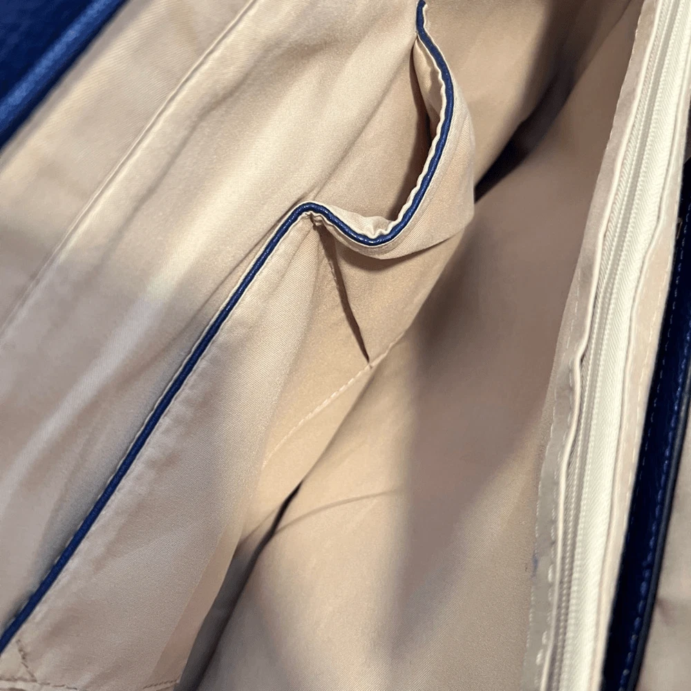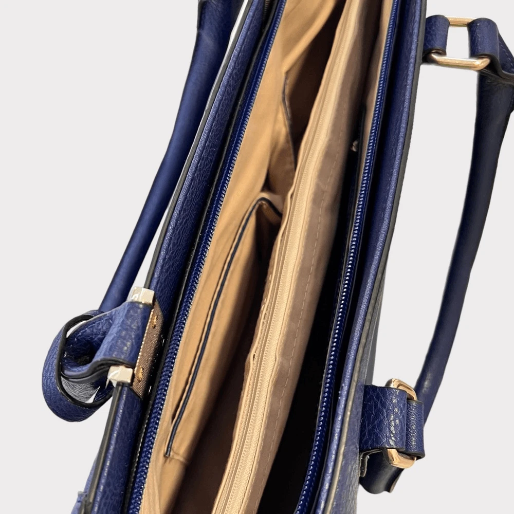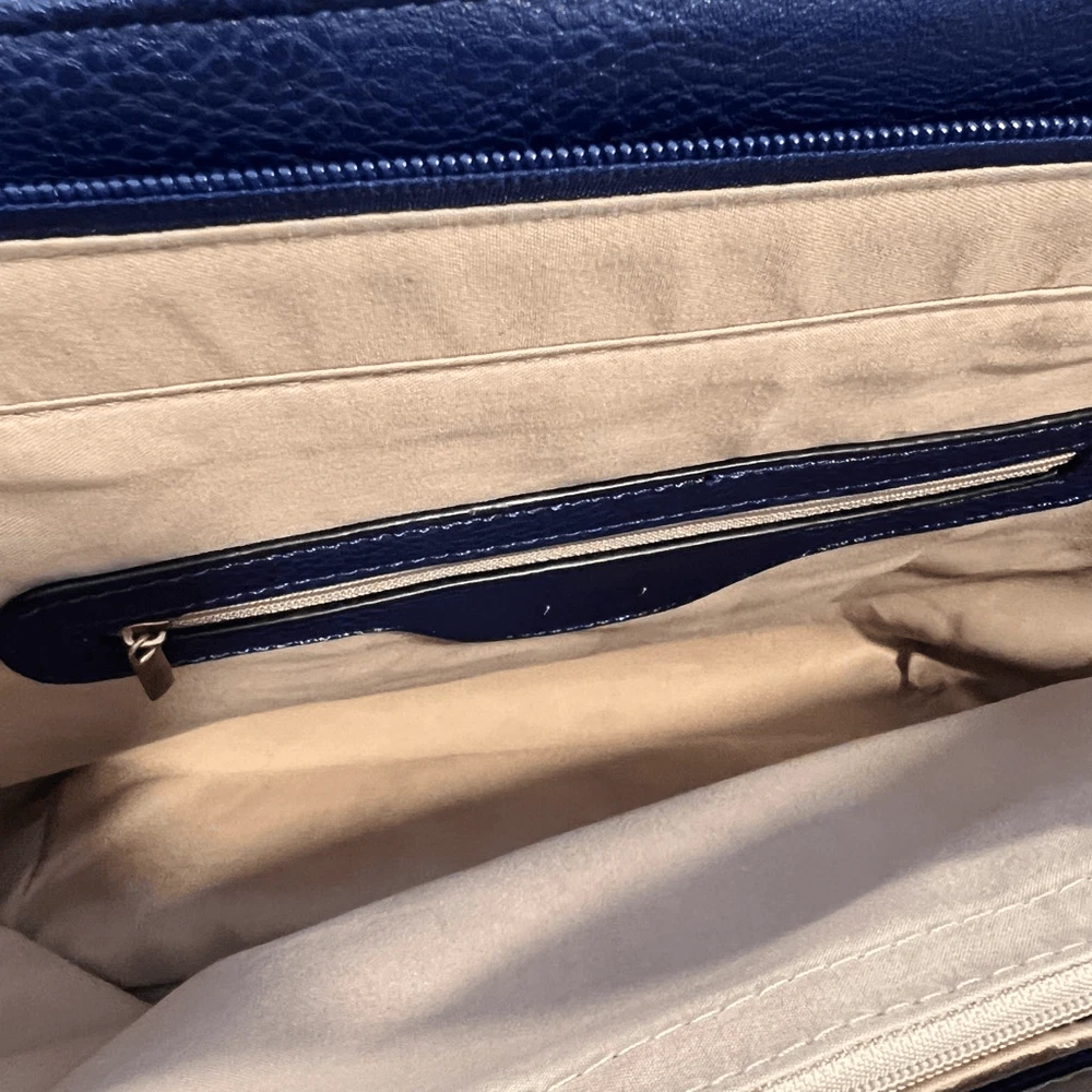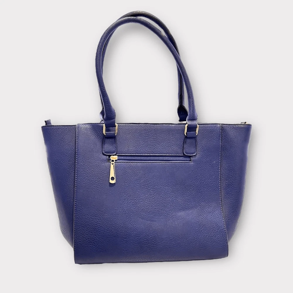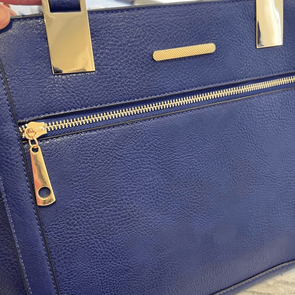 Royal Blue Pebbled Faux Leather Tote Handbag (Broken Zipper) Royal blue pebbled handbag. Gold tone hardware. Zipper pockets at front and back. Three separate compartments inside. Two open slit pockets and one zipper pocket inside. One large middle zipper compartment. Brand new shoulder strap still in its original wrapping. This is a brand new handbag with a manufacturer defect. Main zipper is broken and pebbles leather is slightly irregular in areas, bottom corner wear. Approximate Measurements 17” length x 11” height x 5.5” depth 9” handle drop 5” + 4” open pocket 15” middle zipper compartment 6.5” zipper pocket 7” outer zipper pocket 10” outer front zipper pocket Smoke Free | Pet Free Environment