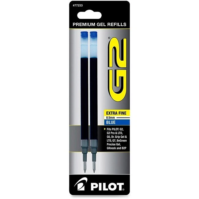 Refills are designed for use with Pilot G2, G2 Limited, G2 Pro, G6, B2P, Dr. Grip Ltd, Dr. Grip Gel, G-Knock BeGreen, Precise Gel BeGreen, Execugel and Q7. Gel ink formula delivers smear-proof, smooth writing.Smear ProofMaterials: Plastic Color: BlueModel: 77233Dimensions: 0.3 inches high x 1.9 inches wide x 6 inches longPack of: 2 each Free Shipping Over $49.99* Details Blue Pilot Refill for G2 Gel- Dr. Grip Gel/Ltd- Product Description: Refills are designed for use with Pilot G2, G2 Limited, G2 Pro, G6, B2P, Dr. Grip Ltd, Dr. Grip Gel, G-Knock BeGreen, Precise Gel BeGreen, Execugel and Q7. Gel ink formula delivers smear-proof, smooth writing. Smear Proof MaterialsPlastic ColorBlue Model77233 Dimensions0.3 inches high x 1.9 inches wide x 6 inches long Pack of2 each
