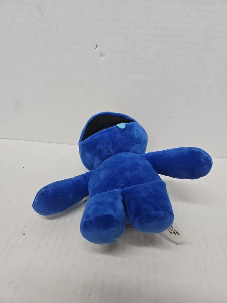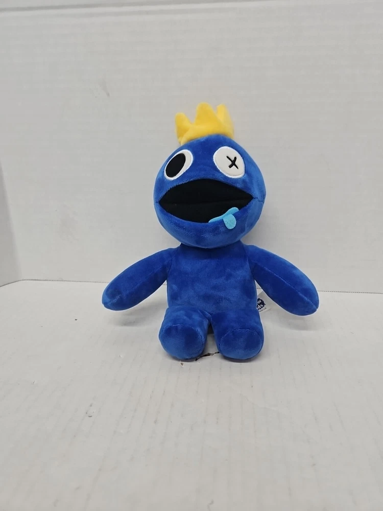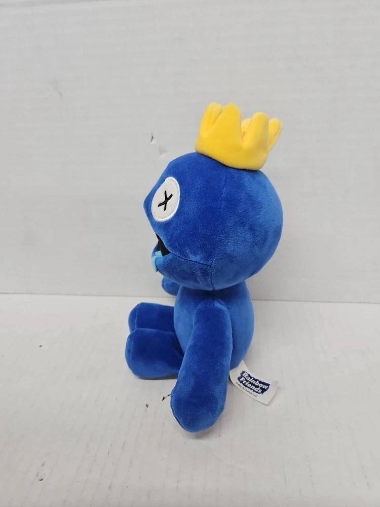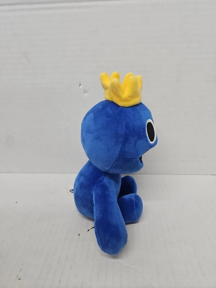 The "Blue Rainbow Friends Plush" is a small (9") stuffed animal from the Roblox Phatmojo Monster Yellow Crown series. It features a blue color and belongs to the Rainbow Friends character family. Ideal for birthdays, this plush toy is suitable for all ages and was manufactured in China.