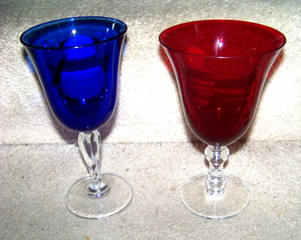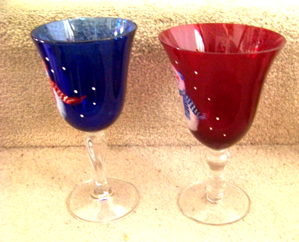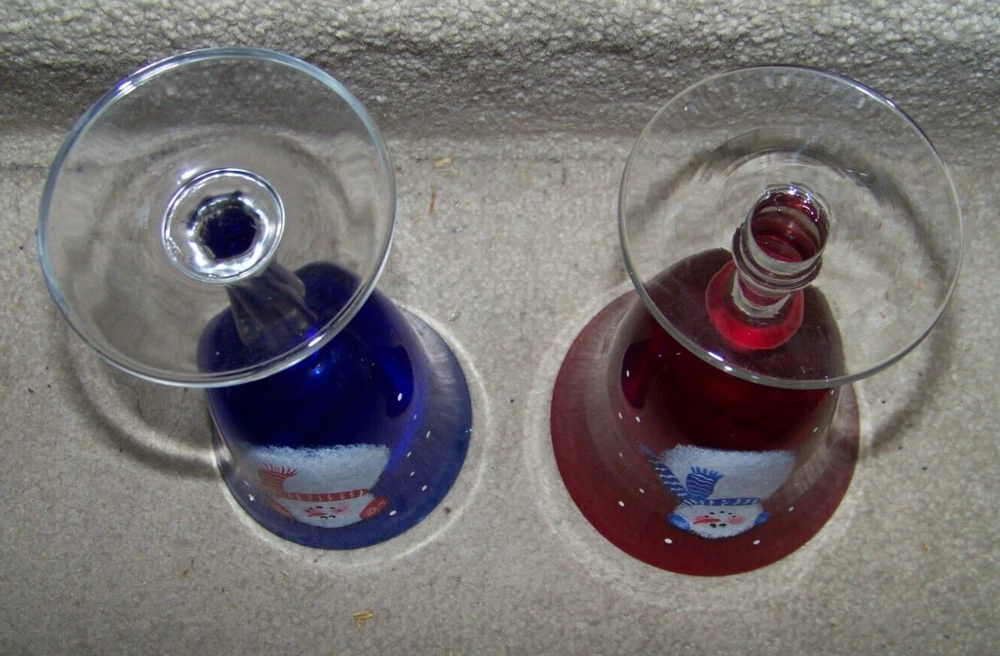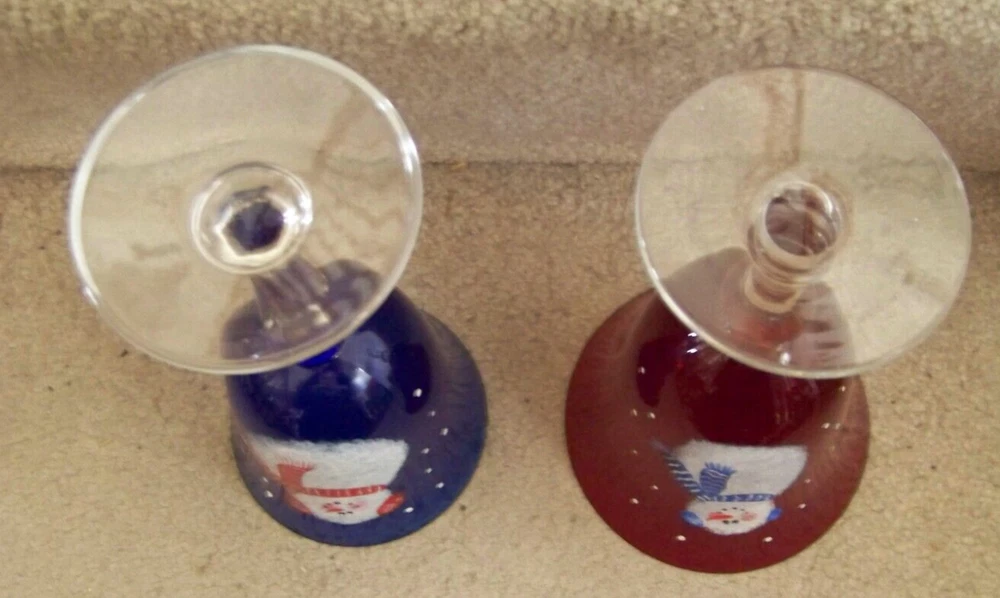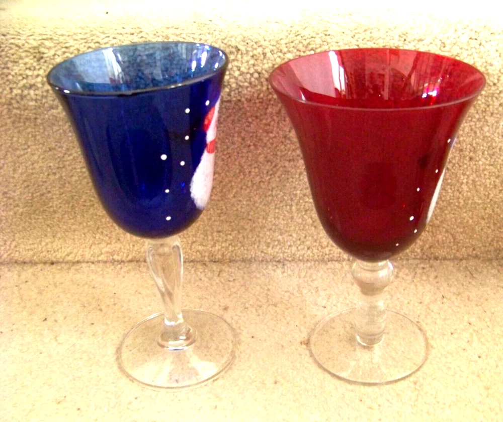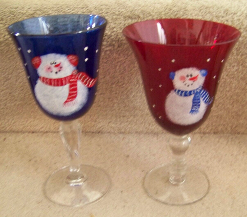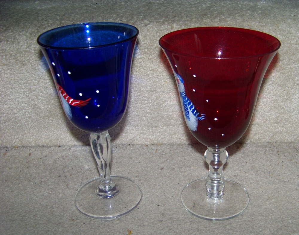 TWO Snowman stemware glasses one blue 7.6" one red 7.3" tall FREE SHIPPING These glasses measure about 7.6" tall and a top diameter of 3.8" for the blue one, and about 7.3" tall and a top diameter of 4.5" for the red one. Excellent condition, no chips or cracks. The blue glass has a small area, about 1" long, on the top edge that appears to be bubble like. The area is smooth with possibly an area smaller than a pinhead of roughness, maybe a nick. Don’t forget to click on my "Stores" link, next to my eBay name, to see other items I currently have listed for sale, or you can copy and paste this address into your browser: stores.ebay.com/highcountrycollectibles SHIPPING INFORMATION Shipping to U.S. addresses is FREE! HIGH COUNTRY COLLECTIBLES Since 1989 – A LEADER IN THE DENVER SPORTS MEMORABILIA MARKET. Check out my other auctions and listings, and keep an eye out for the different, unusual, and EXCLUSIVE items available nowhere else but from High Country Collectibles.