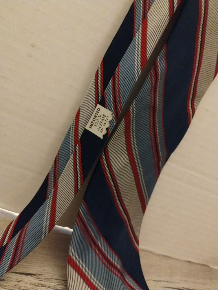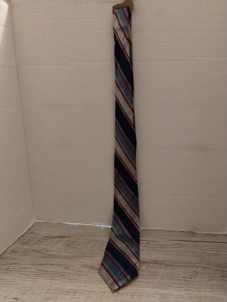 This vintage necktie features a timeless blue and red striped pattern, crafted from acetate for a polished look. Its 50-inch length complements various formal and business attire, making it an elegant addition to professional wardrobes. • Made from durable acetate material • 50 inches in length • Classic striped design in blue and red • Suitable for formal and professional settings • Slim yet traditional width Size: Mens 50" Condition: Pre-Owned