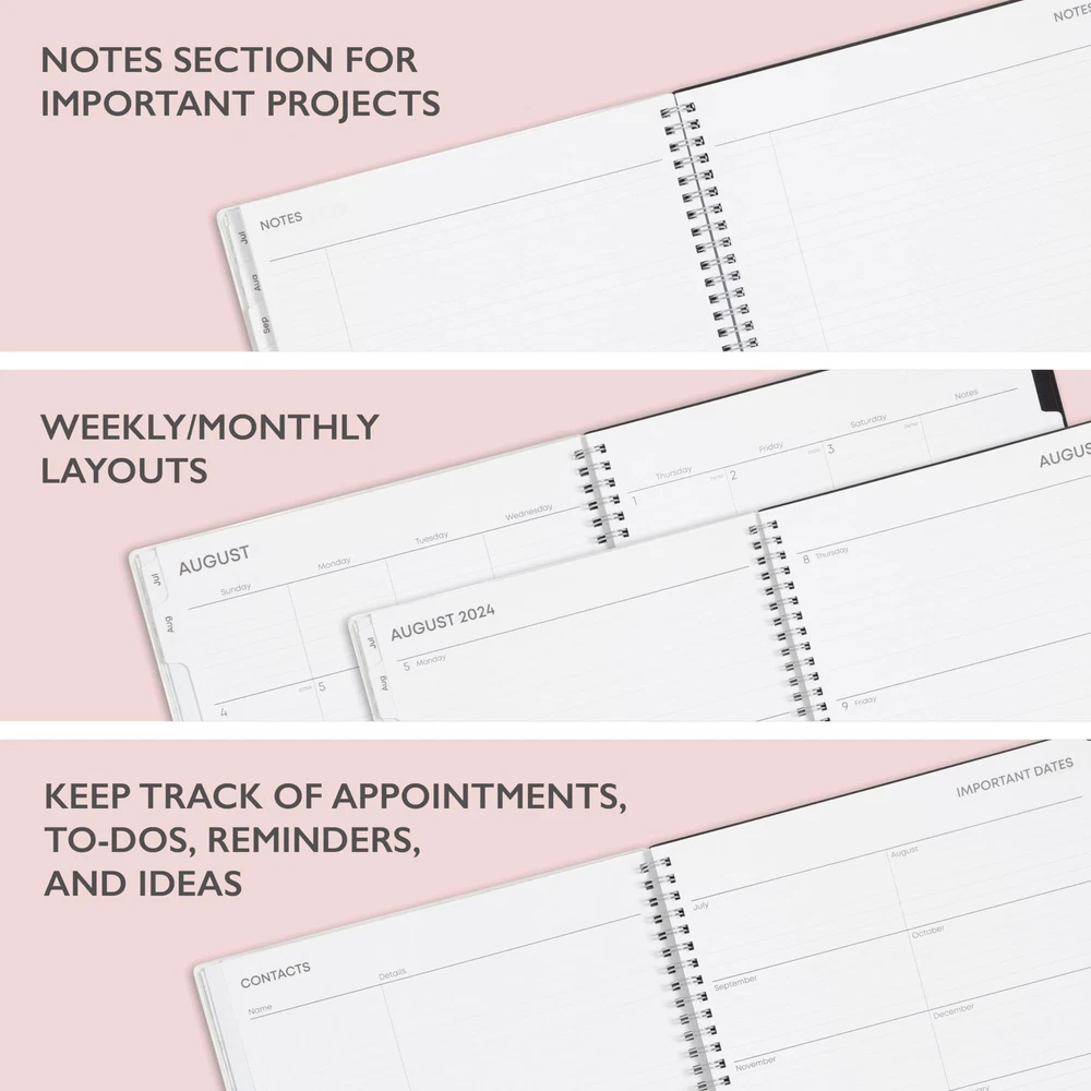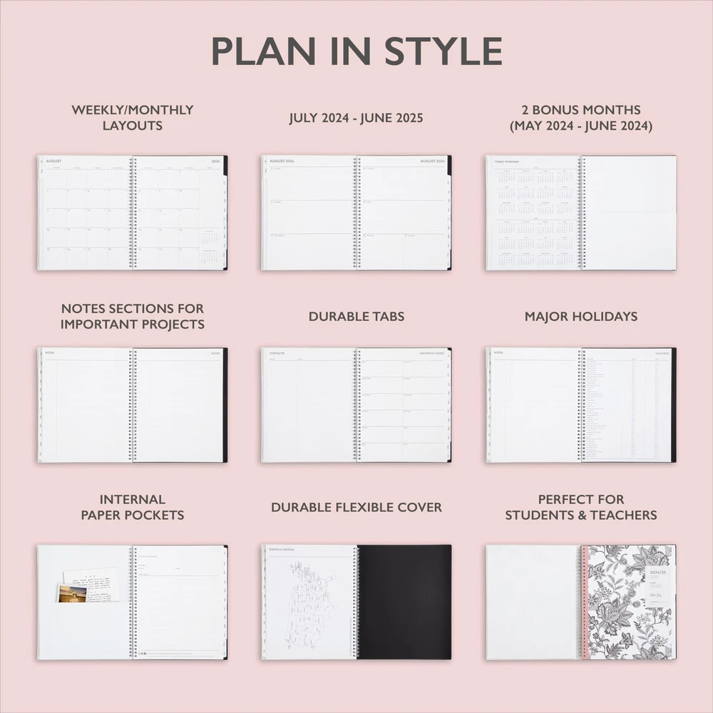 Blue Sky 2024-2025 Academic Year Weekly and Monthly Planner, 8.5" x 11", Flexible Cover, Wirebound, Analeis (130606-A25) Plan your year in style with the beautiful florals and bold colors of the 2024-2025 academic year Analeis collection. This stylish CYO (create your own) cover planner will keep you organized everywhere you go. Add in your favorite photos, sentiments, notes or memories to the clear cover pocket, and keep organized with dated weekly and monthly pages inside for easy scheduling. Simple page designs add a touch of sophistication and offer plenty of room for all of your important information. Designed with practicality and ease of use in mind, this academic agenda's monthly calendar tabs allow for easy access to each month’s plans while weekly views offer ample writing space for detailing each day. Use this dated academic planner to keep track of your appointments, and to write down notes and ideas in one place. Durable coated tabbed dividers are long lasting and make accessing information a breeze. Premium quality covers and twin-wire binding provide reliable durability for daily use. Stay on track throughout the academic year with this large 8.5” by 11” planner dated July 2024 - June 2025. Mix and match with other Analeis Collection planning products from Blue Sky to organize your daily life. • Blue Sky creates modern and sophisticated organizational planners and calendars to fit the scheduling needs of busy people - whether it’s for business professionals, college students, teachers, or anyone with appointments to make note of. Keep your life organized with our full line of products including desk pad calendars, wirebound tabbed weekly and monthly planners with contacts and notes pages to accommodate your scheduling needs, and laminated two-sided wall calendars, all in a variety of colors and patterns to suit your lifestyle and personality. July 2024 - June 2025 floral day planner with 12 months of monthly and weekly pages for easy academic planning and scheduling; 2 additional monthly pages (May 2024 - June 2024) are included Monthly view pages contain previous and next month reference calendars for long-term planning, and a notes section for important projects; Major holidays listed, elapsed and remaining days noted Weekly view pages offer ample lined writing space for more detailed planning, allowing you to keep track of your appointments, reminders, ideas and to-do lists every day of the week Yearly calendar layout includes a convenient list of holidays, reference pages, contacts pages and extra notes pages to accommodate your scheduling needs; Perfect for students and teachers Printed on high quality white paper for clean writing space, with premium quality covers in a beautiful floral pattern and durable, coated tabs that withstand constant use throughout the year Shipping from the USA All of our products are shipped from the USA, ensuring quick delivery to your destination. Payment We offer the following payment methods: PayPal, credit card, bank transfer, and eBay's secure payment system. Free Shipping & Free Returns Shipping within the USA is FREE. Additionally, any return is absolutely free for you. Risk-Free Purchase You have the option to return an item within 30 days without any justification. We cover the return shipping costs! Fast Shipping We ship immediately upon receipt of payment. Generally, the package is delivered within 2-3 days in the USA. If it takes longer, we will contact you. Quality and Costs Made in Europe, USA, China No customs fees or additional charges Total satisfaction guarantee Invoice with declared VAT available upon request in .pdf format Feedback Your feedback is very important to us. After you pay for your purchase, you will automatically receive positive feedback from us.