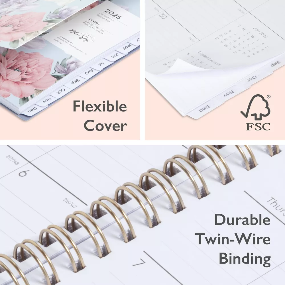 Blue Sky 2025 Weekly and Monthly Planner Calendar, January 2025 - December 2025, 5" x 8", Flexible Matte Cover, Laminated Tabs, Wirebound, Storage Pocket, Tula (Tula- 2025, 5" x 8") Plan your year in style with the chic design and trendy colors of the 2025 calendar year Classic collection. This stylish weekly and monthly planner will keep you organized everywhere you go. Simple page designs add a touch of sophistication and offer plenty of room for all of your important information. Designed with practicality and ease of use in mind, this professional agenda's monthly calendar tabs allow for easy access to each month’s plans while weekly views offer ample writing space for detailing each day. FSC-certified paper is sourced from responsibly managed forests and provides clean writing space for jotting down your appointments, to-dos and reminders. Use this dated planner to keep track of your appointments, and to write down notes and ideas in one place. Durable coated tabbed dividers are long lasting and make accessing information a breeze. Premium quality covers and twin-wire binding provide reliable durability for daily use. Stay on track throughout the year with this portable 5” x 8” planner dated January 2025 - December 2025. Mix and match with other Classic Collection planning products from Blue Sky to organize your daily life. Blue Sky creates modern and sophisticated organizational planners and calendars to fit the scheduling needs of busy people - whether it’s for business professionals, college students, teachers, or anyone with appointments to make note of. Keep your life organized with our full line of products including desk pad calendars, wirebound tabbed weekly and monthly planners with contacts and notes pages to accommodate your scheduling needs, and laminated two-sided wall calendars, all in a variety of colors and patterns to suit your lifestyle and personality. January 2025 - December 2025 chic day planner with 12 months of monthly and weekly pages for easy year-round planning; 6 additional monthly pages (July 2024 - December 2024) are included Monthly view pages contain previous and next month reference calendars for long-term planning, and a notes section for important projects; Major holidays listed, elapsed and remaining days noted Weekly view pages offer ample lined writing space for more detailed planning, allowing you to keep track of your appointments, reminders, ideas and to-do lists every day of the week Yearly calendar planner includes a convenient list of holidays, reference calendars, contacts pages and extra notes pages to accommodate your scheduling needs Printed on FSC-certified paper for clean writing space, with premium quality covers in rich colors and durable, coated tabs that withstand constant use throughout the year Shipping from the USA All of our products are shipped from the USA, ensuring quick delivery to your destination. Payment We offer the following payment methods: PayPal, credit card, bank transfer, and eBay's secure payment system. Free Shipping & Free Returns Shipping within the USA is FREE. Additionally, any return is absolutely free for you. Risk-Free Purchase You have the option to return an item within 30 days without any justification. We cover the return shipping costs! Fast Shipping We ship immediately upon receipt of payment. Generally, the package is delivered within 2-3 days in the USA. If it takes longer, we will contact you. Quality and Costs Made in Europe, USA, China No customs fees or additional charges Total satisfaction guarantee Invoice with declared VAT available upon request in .pdf format Feedback Your feedback is very important to us. After you pay for your purchase, you will automatically receive positive feedback from us.