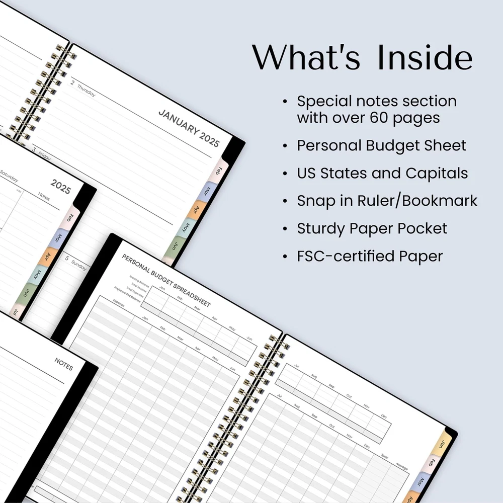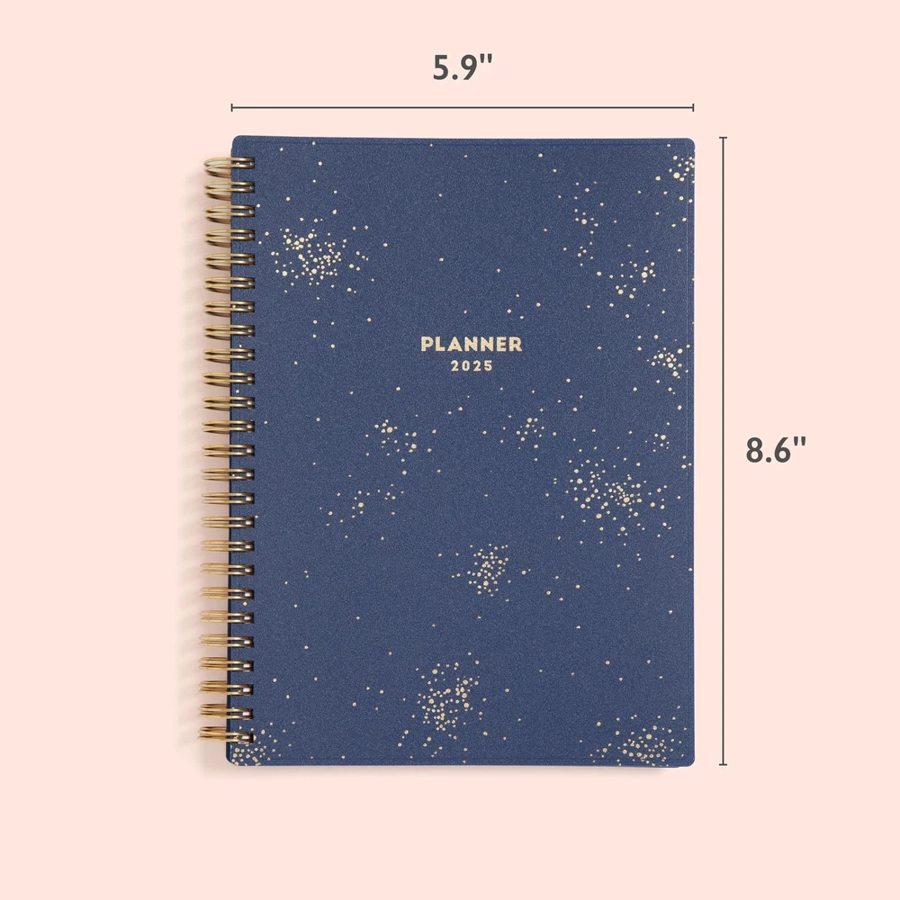 Blue Sky 2025 Weekly and Monthly Planner Calendar, January 2025 - December 2025, 5.875” x 8.625”, Flexible Cover, Laminated Tabs, Wirebound, Storage Pocket, Gold Foil Details, Starlight (Starlight- 2025, 5.875" x 8.625") Plan your year in style with the classic aesthetic of this 2025 planner. This weekly and monthly planner will keep you organized everywhere you go. Simple page designs add a touch of sophistication and offer plenty of room for all of your important information. Designed with practicality and ease of use in mind, this agenda's monthly calendar tabs allow for easy access to each month’s plans while weekly views offer ample writing space for detailing each day. Thirty sheets of notepaper at the back of the planner offer additional space for you to jot down your thoughts, ideas and musings. A yearly overview calendar, a yearly goals layout and budget spreadsheet assist with long-term planning. A snap-in ruler/bookmark, double-sided paper pocket for loose leaf materials, listed holidays and a reference sheet with US States and Capitals add to the usefulness of this organizational tool. Quality flexible covers and metallic twin-wire binding provide reliable durability for daily use. Stay on track throughout the year with this portable 5.875” by 8.625” planner dated January 2025 - December 2025. Mix and match with other Classic Collection planning products from Blue Sky to organize your daily life. Blue Sky creates modern and sophisticated organizational planners and calendars to fit the scheduling needs of busy people - whether it’s for business professionals, college students, teachers, or anyone with appointments to make note of. Keep your life organized with our full line of products including desk pad calendars, wirebound tabbed weekly and monthly planners with contacts and notes pages to accommodate your scheduling needs, and laminated two-sided wall calendars, all in a variety of colors and patterns to suit your lifestyle and personality. January 2025 - December 2025 planner with 12 months of monthly and weekly pages for easy planning and scheduling; 6 bonus monthly pages (July 2024 - December 2024) are included Monthly pages contain previous and next month reference calendars for long-term planning, and a notes section for important projects; Major holidays listed, elapsed and remaining days noted Weekly view pages offer ample lined writing space for more detailed planning, allowing you to keep track of your appointments, reminders, ideas and to-do lists every day of the week This 5.875" x 8.625" planner has a generous, tabbed notes section that provides 60 pages of lined writing space, while a budget tracker helps you manage your finances The planner’s gold-tone, spiral bound spine, flexible, dark blue cover and colorful, durable monthly tabs ensure that this planning calendar can withstand the demands of your busy schedule Shipping from the USA All of our products are shipped from the USA, ensuring quick delivery to your destination. Payment We offer the following payment methods: PayPal, credit card, bank transfer, and eBay's secure payment system. Free Shipping & Free Returns Shipping within the USA is FREE. Additionally, any return is absolutely free for you. Risk-Free Purchase You have the option to return an item within 30 days without any justification. We cover the return shipping costs! Fast Shipping We ship immediately upon receipt of payment. Generally, the package is delivered within 2-3 days in the USA. If it takes longer, we will contact you. Quality and Costs Made in Europe, USA, China No customs fees or additional charges Total satisfaction guarantee Invoice with declared VAT available upon request in .pdf format Feedback Your feedback is very important to us. After you pay for your purchase, you will automatically receive positive feedback from us.