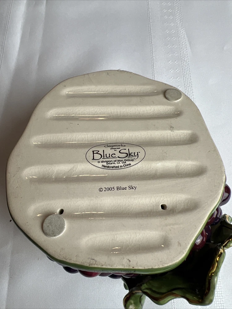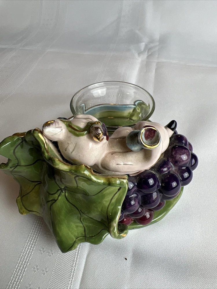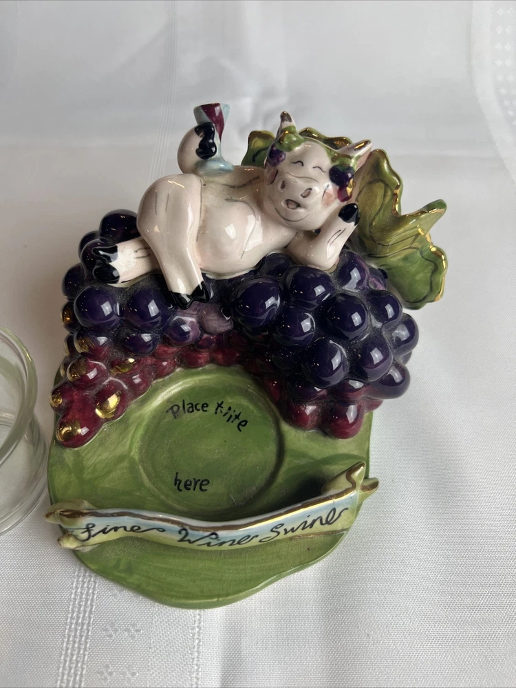 This Blue Sky Clay Works Pottery Fine Wine Swine Candle Holder is a licensed reproduction with glossy finish. The hand-molded stoneware piece is suitable for tea light candles and features a Wine Swine Figure pattern. The item dimensions are 5" length x 4" height x 4.25" width, and it weighs 1lb 1oz. The candle holder comes with a printed backstamp and belongs to the Blue Sky Pottery product line. The decorative piece is perfect for any room and adds a touch of whimsy to your decor. The Faience Pottery production style and pottery production technique used in China in the 21st Century (2000-2009) make it a unique addition to your collection. This item is not antique and is not handmade. See more TreasureHuggersUnlimited WillCombineShipping