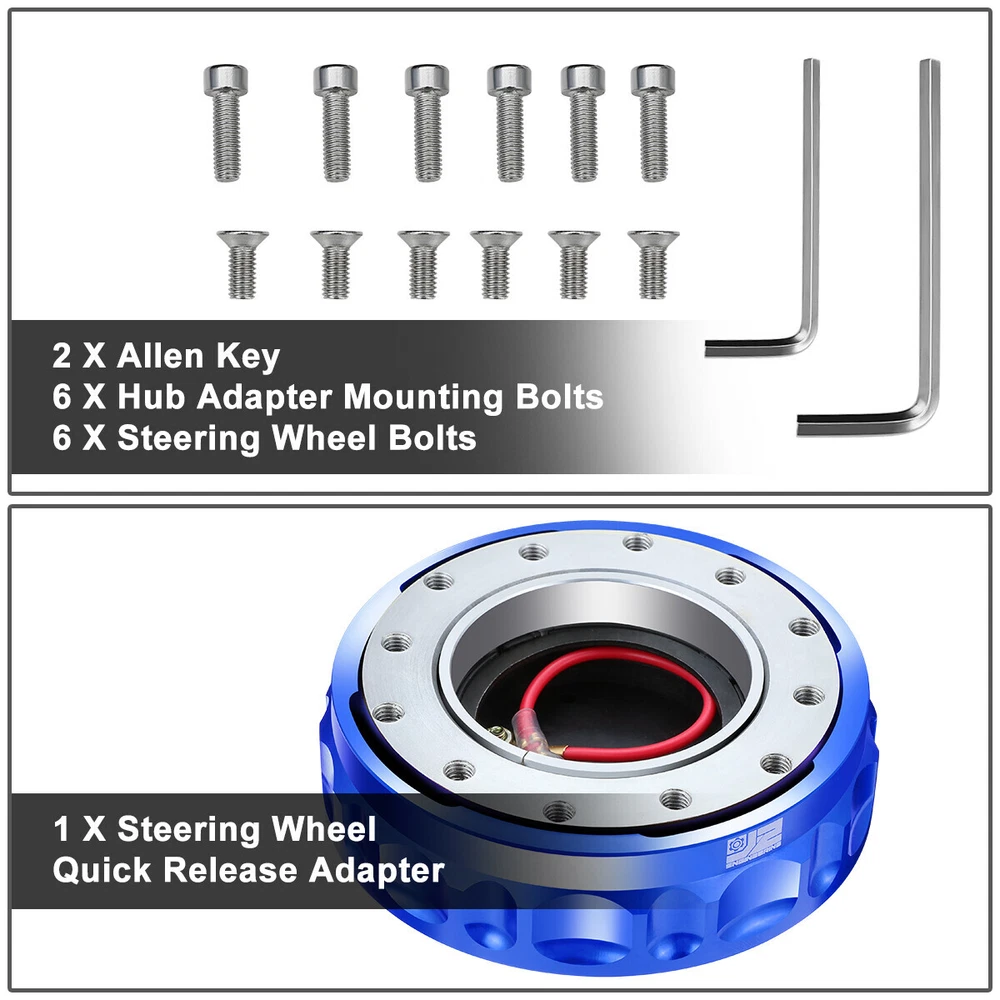 Welcome to our eBay store DPT Motorsport Business Hours: Monday - Friday, 9 AM to 6 PM PST. Store Home Payment Shipping Returns Need Help Add to Favorites About Us Blue Steering Wheel Twist Lock Quick Release Hub Adapter Kits-J2 Engineering Product Description Quick releases allow you to remove your steering wheel from the car for easier access / exit especially when you have a bucket seat or sealed doors such as in a race car. Or for increased security to prevent theft. Made of High Quality Aluminum Anodized Finish Outer Ring Adds 22mm Height When Installed 95mm Wide Diameter Push Button Lock Release Twist to Install / Remove Steering Wheel Wired for Horn Button Installation Fits 6-Bolt 70mm Steering Wheel Hubs Fits 6-Bolt 70mm & 74mm Steering Wheels Hub & Steering Wheel Bolts / Allen Keys Included for Installation Includes: 1 X Steering Wheel Quick Release Adapter 6 X Hub Adapter Mounting Bolts 6 X Steering Wheel Bolts 2 X Allen Key Notes: Compatible with: Fits Any 6 Bolt 70mm or 74mm Spacing Steering Wheel Fits on Steering Wheel Hub Adapters with 6-Bolt 70mm Bolt Spacing 100% Brand New Professional Installation is Highly Recommended Installation Instruction is NOT Included About Us Payment Shipping Returns Feedback Contact Us Have any questions or need info about something you already purchased? We'd love to hear from you! For items already purchased, please kindly include your eBay item number for faster response time. DPT Motorsport operates from Monday through Friday, 10 am to 6 pm (PST). ATTENTION: We are closed on Saturdays and Sundays. All messages will be replied in the order it was received during business days Thank you for choosing DPT Motorsport and happy bidding! We accept PayPal only. We reserve the right to file Non-Paying Bidder if payment is not received 10 days after the auction ended. Shipping Methods All shipments are made via either UPS or United States Postal Service depending on the types of products purchased. Majority of our orders will be ship within 2 business days (mostly within 24hrs) (All mail transit time stated above is best estimated but not guaranteed.) All shipments requires physical addresses, no PO Box address will be shipped. Shipping and handling charges are not negotiable. Return Policy **We stand behind the products we sell. If for any reason you are not satisfied with your purchase, we'll be happy to process a refund the product less S&H within 30 Days of your purchase. All return items will require a RMA number, which is given by our Customer Service Department only. Please allow 10-14 days for returns and exchange to be process. Please inspect all your order(s) upon receipt. All return items MUST be in brand new condition which means the item is never installed and kept in the original packaging. We will not reship replacement(s) before we get a claim approval for the lost or stolen item(s) or the returned item from customers. In most cases, all shipping and handling fees are non-refundable, unless it has been approved by our Customer Service Department. Any item(s) that the buyer states as defective will be tested by our Returns Department, if there is no problems or errors found during testing. Once the RMA# is issued, the buyer will have 30 days to return the item, if any items that is return after 30 days, the item(s) are subject for rejection. All items are brand new unless otherwise stated. PROFESSIONAL installation is highly recommended. Buyer assumes all risk on usage. About Us Have any questions or need info about something you already purchased? We'd love to hear from you! For items already purchased, please kindly include your eBay item number for faster response time. DPT Motorsport operates from Monday through Friday, 10 am to 6 pm (PST). ATTENTION: We are closed on Saturdays and Sundays. All messages will be replied in the order it was received during business days Thank you for choosing DPT Motorsport and happy bidding! Payment We accept PayPal only. We reserve the right to file Non-Paying Bidder if payment is not received 10 days after the auction ended. Shipping Shipping Methods All shipments are made via either UPS or United States Postal Service depending on the types of products purchased. Majority of our orders will be ship within 2 business days (mostly within 24hrs) (All mail transit time stated above is best estimated but not guaranteed.) All shipments requires physical addresses, no PO Box address will be shipped. Shipping and handling charges are not negotiable. Returns >Return Policy **We stand behind the products we sell. If for any reason you are not satisfied with your purchase, we'll be happy to process an exchange or refund the product less S&H within 30 Days of your purchase. All return items will require a RMA number, which is given by our Customer Service Department only. Please allow 10-14 days for returns and exchange to be process. Please inspect all your order(s) upon receipt. All return items MUST be in brand new condition which means the item is never installed and kept in the original packaging, otherwise you will be subjected to a 20% restocking fee. We will not reship replacement(s) before we get a claim approval for the lost or stolen item(s) or the returned item from customers. In most cases, all shipping and handling fees are non-refundable, unless it has been approved by our Customer Service Department. Any item(s) that the buyer states as defective will be tested by our Returns Department, if there is no problems or errors found during testing, there will be a mandatory 20% restocking fee for the price of the item. Once the RMA# is issued, the buyer will have 30 days to return the item, if any items that is return after 30 days, the item(s) are subject for rejection. If the items are returned without an RMA#, we reserve the rights to reject the item or charge the buyer a 20% restocking fee. All items are brand new unless otherwise stated. PROFESSIONAL installation is highly recommended. Buyer a