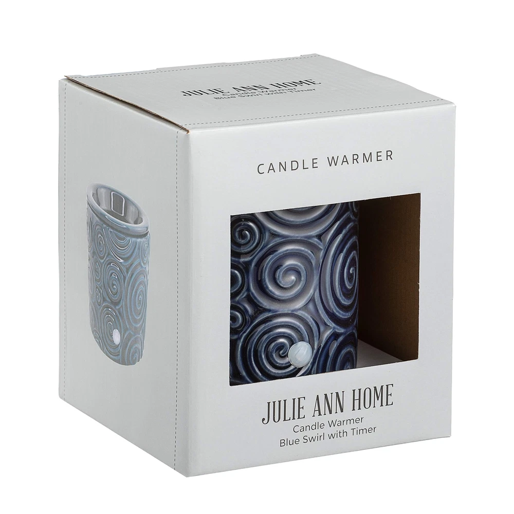 Blue Swirl Ceramic Candle Warmer Electric with Safety Timer | Automatic Plug in Fragrance Warmer for Scented Wax Melts, Cubes, Tarts | Air Freshener Set for Home Décor, Office, and Gifts Product Details Color: Blue Swirl Brand: JULIE ANN HOME UPC: 850008975646 EAN: 0850008975646 MPN: Does not apply Brand: JULIE ANN HOME Color: Blue Swirl Product Dimensions: 4.2"W x 4.3"H Item Weight: 2 Pounds Number of Items: 1 Scent: Unscented Are Batteries Included: No Indoor/Outdoor Usage: Indoor Specific Uses For Product: Aromatherapy, Decoration Shape: Round Brand: JULIE ANN HOME Color: Blue Swirl Product Dimensions: 4.2"W x 4.3"H Item Weight: 2 Pounds Number of Items: 1 Scent: Unscented Are Batteries Included: No Indoor/Outdoor Usage: Indoor Specific Uses For Product: Aromatherapy, Decoration Shape: Round Material: Ceramic Container Material: Ceramic Occasion: general home decor Seasons: All Season Special Feature: Smokeless Style: Traditional Model Name: Blue Chevron Theme: Swirl Pattern: Swirling Package Information: Can Product Care Instructions: Keep dry and clean, avoid abrasive materials and cleaning solvents, unplug when not in use, handle cord with care. Unit Count: 1.0 Count Embellishment: Swirl Pattern and Leaf Pattern Material Feature: embossed swirl pattern for decoration and texture Target Audience: All Consumers Manufacturer: C.G.G. INC. UPC: 850008975646 Item Weight: 1.96 pounds Batteries required: No FLAMELESS ALTERNATIVE TO CANDLES Electric wax warmers are a safer and cleaner alternative to burning traditional candles. Simply warm your own scented wax melts in the warmer cup to fill your room with fragrance. Smokeless, flameless, and easy to use. DECORATIVE CERAMIC WAX WARMER This candle warmer provides quality function without compromising its looks! Featuring a ceramic construction, this blue wax burner boasts an embossed swirl pattern for decoration and texture. PREMIUM TIMER WITH MULTIPLE SETTINGS This candle wax warmer comes with a safety timer on the cord so you can set it to always on, or automatically turn off in 2, 4, or 6 hours. You can also adjust the power levels between low, medium, and high for varying intensities of fragrance. ATTRACTIVE AIR FRESHENER Decorative and functional, this unique air freshener makes a wonderful accent to any room of the home. Great for home living rooms, bedrooms, offices, yoga studios, spas and more! EASY TO USE Remove candle cup from base. Add your own scented wax melts, tarts, cubes, or chips to the dish and place it back on base. Plug in warmer and turn to desired settings. Enjoy the aroma.