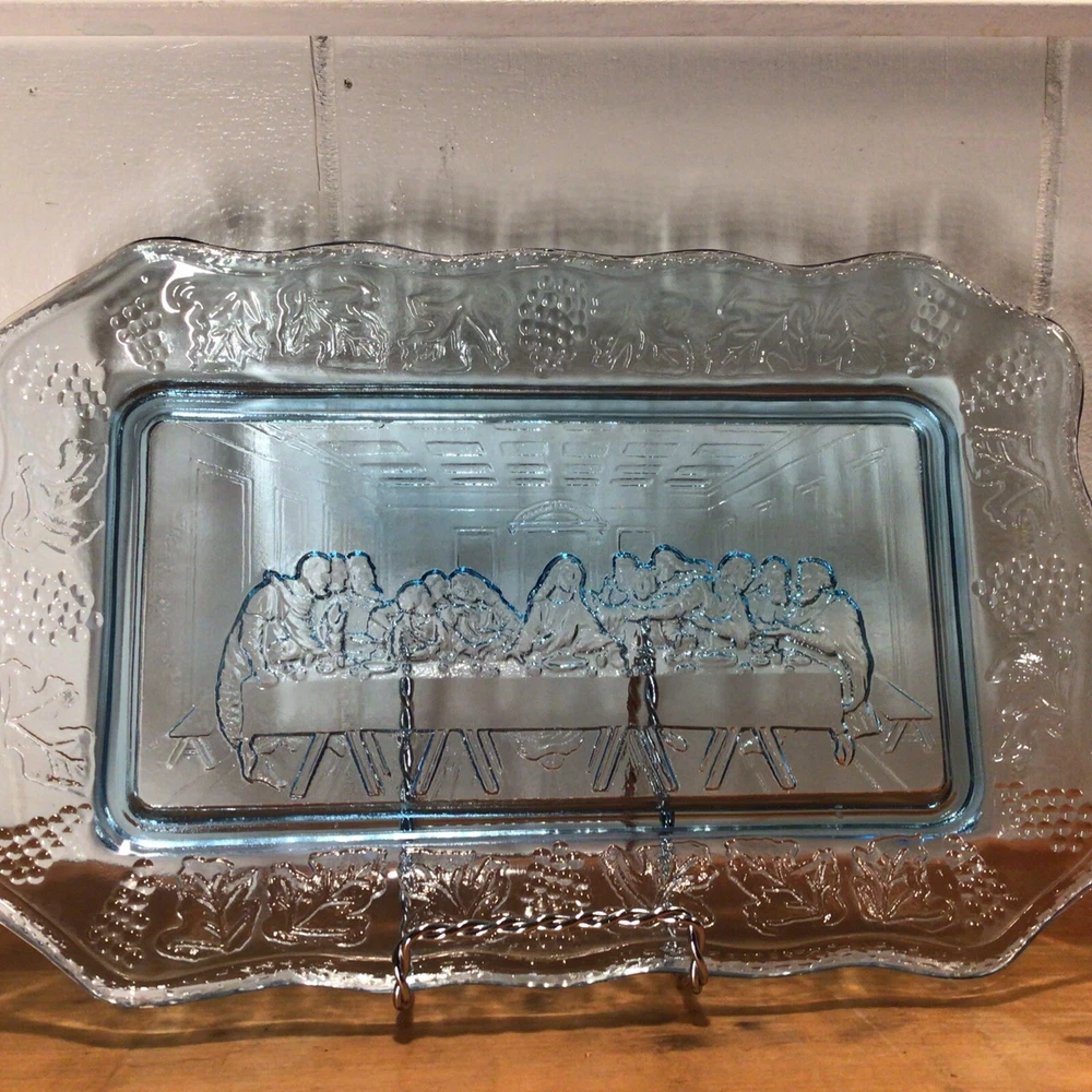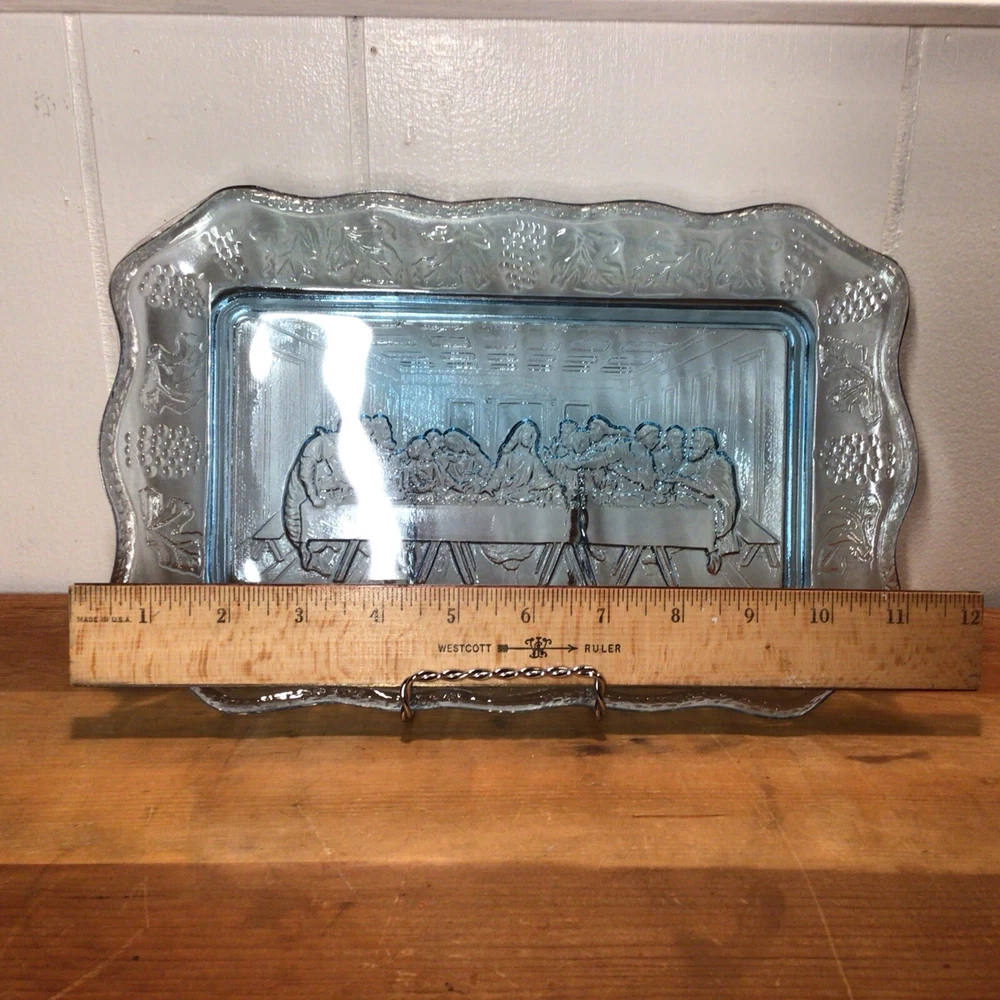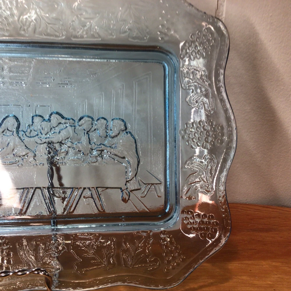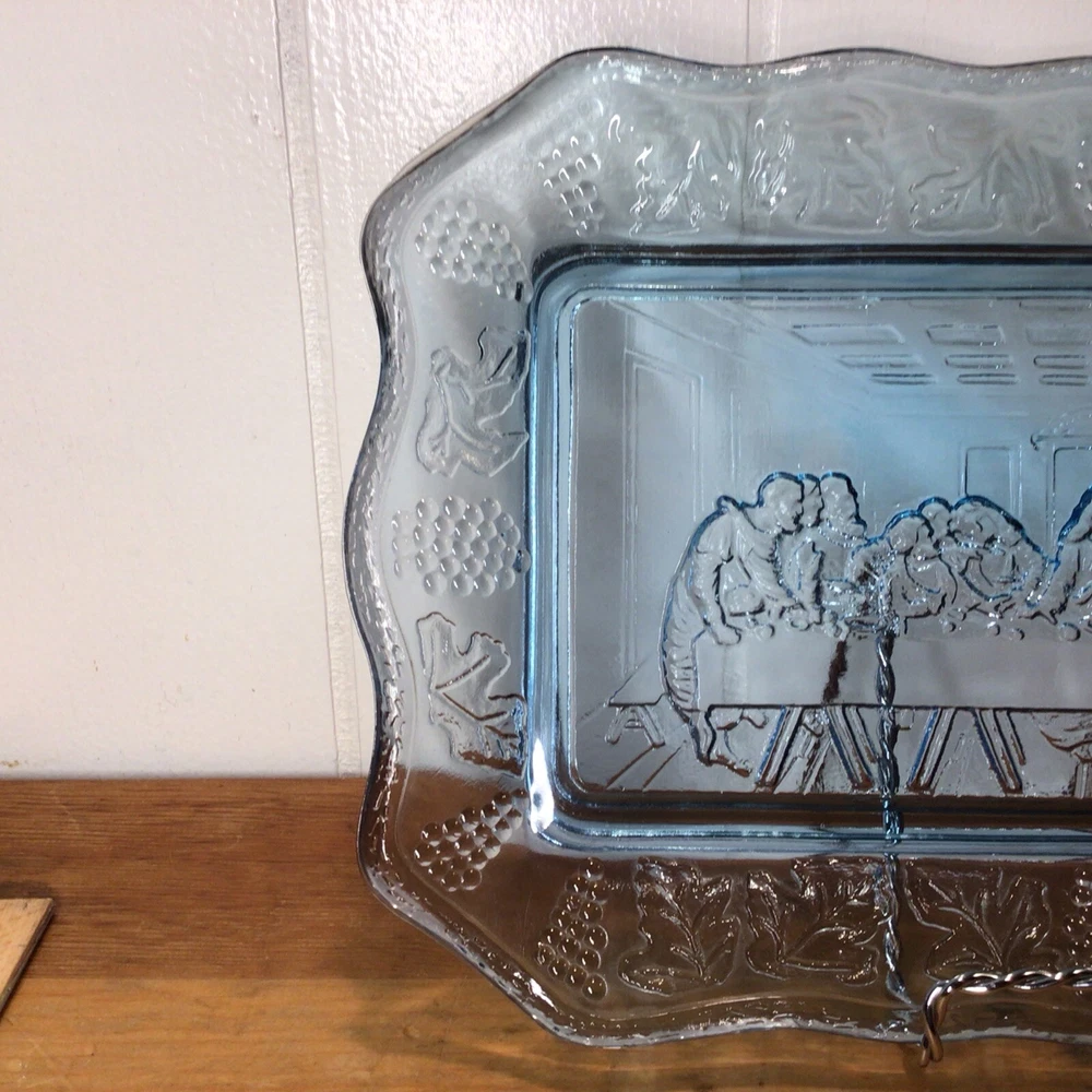This vintage Indiana Glass bread plate tray features a Last Supper theme in blue Depression Glass. The rectangular tray measures 11 inches in length, 7 inches in width, and 1.25 inches in height. It is a unique piece depicting Jesus with a production style of pressed glass from the 1970s in the United States. The set includes a single tray with a design suitable for all occasions.