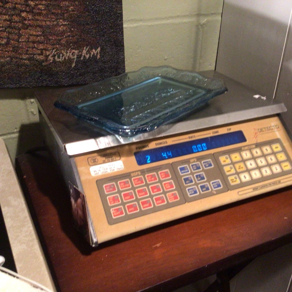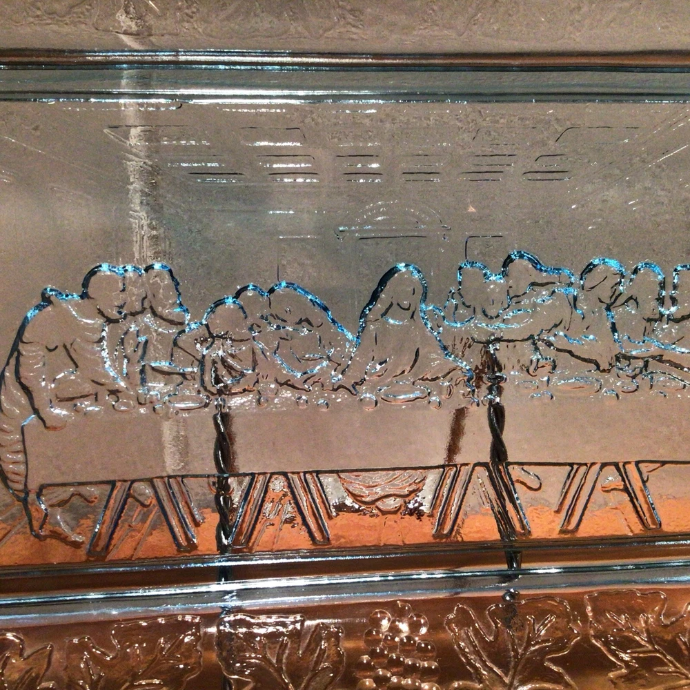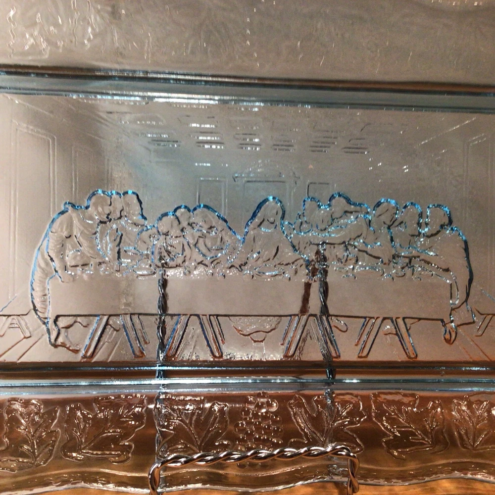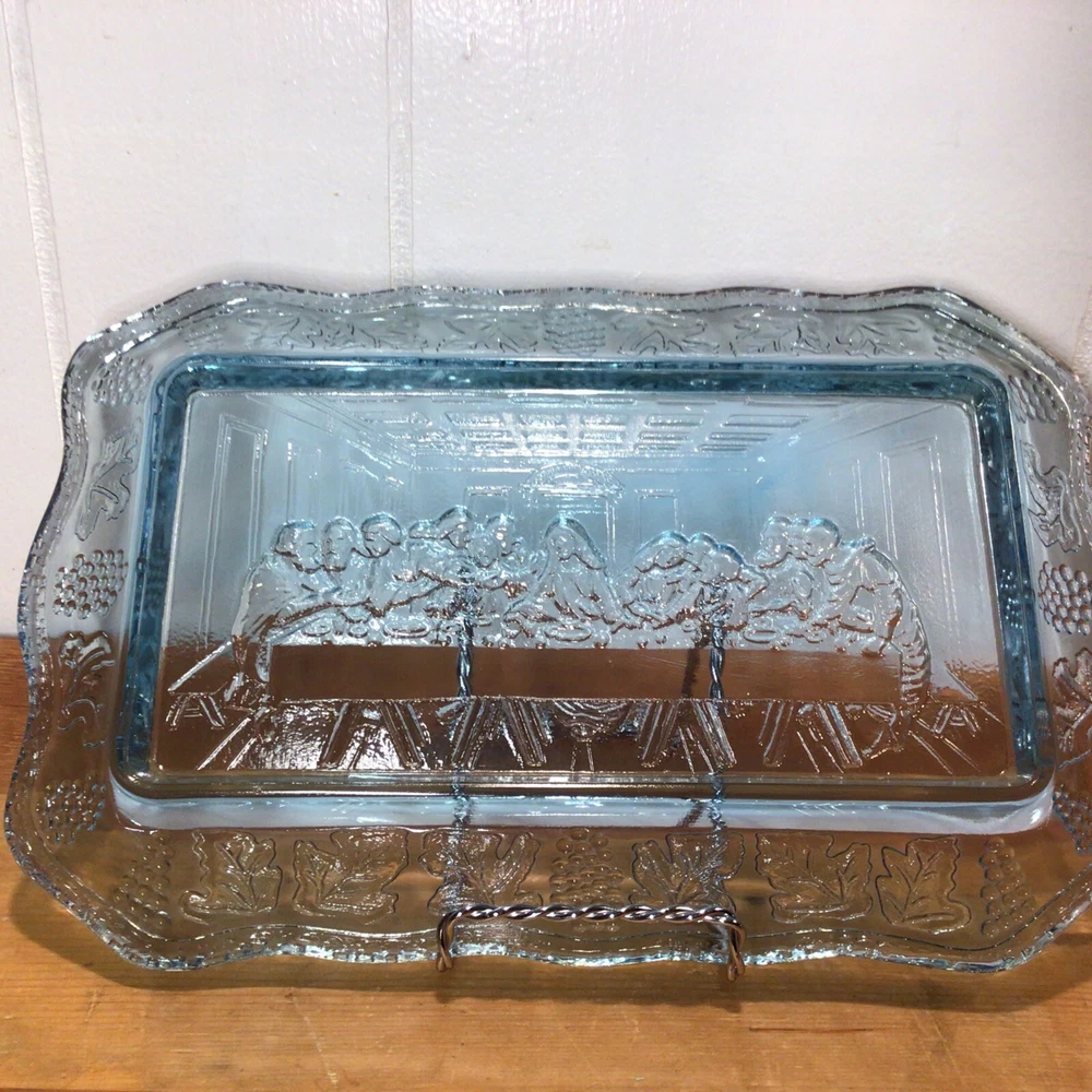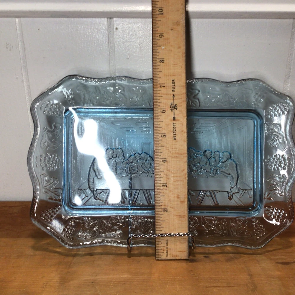 This vintage Indiana Glass bread plate tray features a Last Supper theme in blue Depression Glass. The rectangular tray measures 11 inches in length, 7 inches in width, and 1.25 inches in height. It is a unique piece depicting Jesus with a production style of pressed glass from the 1970s in the United States. The set includes a single tray with a design suitable for all occasions.