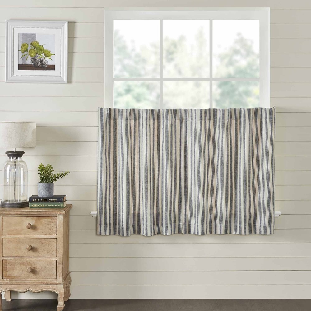 In today's farmhouse-style decor trend, ticking stripe fabrics are highly coveted, and our Market Place Collection features some of the best. Crafted from luxuriously textured cotton with a substantial weight and soft touch, our Market Place Blue Ticking Stripe 36" Curtain Tiers exude rustic charm. The woven ticking stripes in denim blue create a striking contrast against the natural cream base, adding timeless elegance to any space. Paired with a coordinating grain sack stripe fabric option, mixing and matching becomes effortless, allowing you to curate your ideal farmhouse-inspired look. Our ticking stripe tier curtains, lined with white cotton and featuring a 3.25" rod pocket with fabric loops for versatile hanging options, measure 36"L x 36"W each. Sold as a set of 2, their total width is 72". Elevate your farmhouse decor with these stylish and functional tier curtains, perfect for adding a finishing touch to your windows and enhancing the cozy ambiance of your home. 36" TIERS: Package contains 2 tier curtains, each measuring 36" LONG x 36" WIDE (72" total width) DENIM BLUE TICKING STRIPES are woven into a natural beige base for a classic vintage farmhouse style. It's the perfect finish to your farmhouse home décor. 100% Cotton IMPORTANT DETAILS: Lined with white cotton. Hang using either the 3.25" rod pocket or for a more modern and tailored style use the fabric back tabs. No header for a clean look. LIGHT FILTERING: Lined with white cotton to provide additional privacy while f COORDINATING HOME DECOR ACCESSORIES - All of our decor items are sold separately so that you can curate the perfect look for your home. Create your dream room by mixing and matching any of our Market Place items such as quilts, curtains, table runners, and more! MODERN FARMHOUSE STYLE: Elevate your space with versatile styling that effortlessly complements country chic, vintage farmhouse, or cottage decor. EASY CARE: Machine wash in cold water with like colors, gentle cycle. No chlorine bleach. Tumble dry low or hang to dry. Iron if needed.