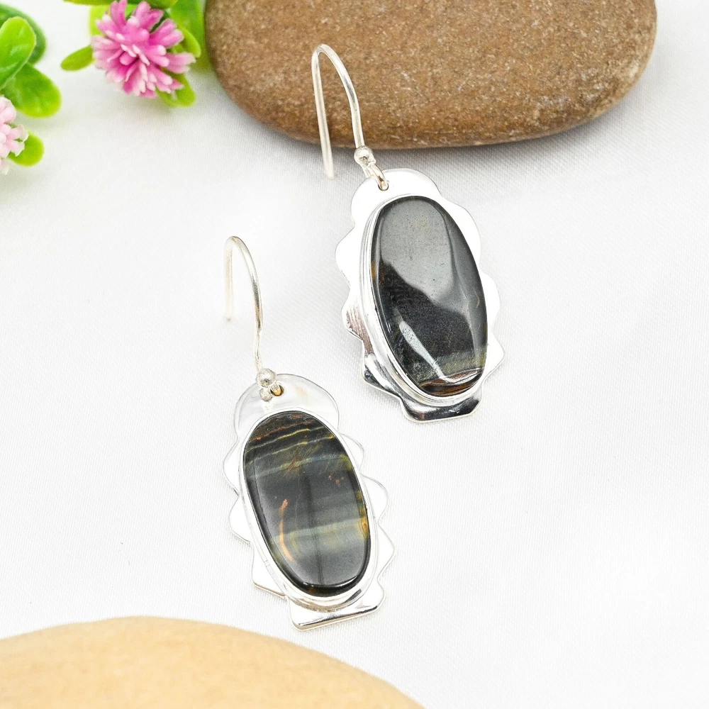 HomeBlue Tiger Eye Dangle Earrings Handmade Sterling Silver Jewelry Gift