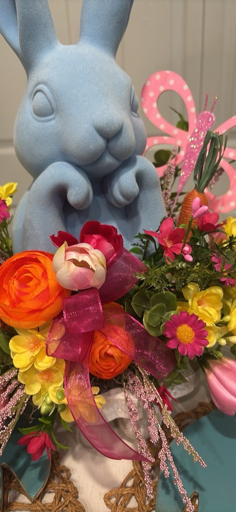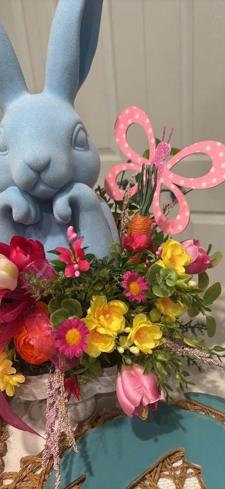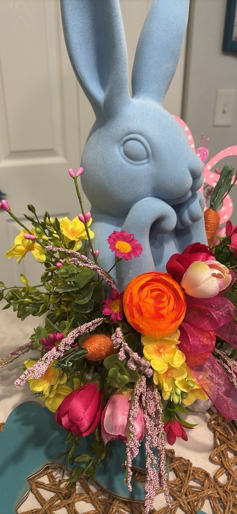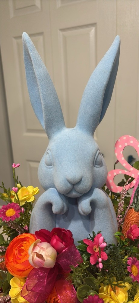 This Blue Velvet Bunny Rabbit is a large, handmade figurine perfect for decorating any room during the Spring and Easter seasons. The wood base centerpiece features a white wood base with blue velvet bunny adding a touch of whimsy to your home. Easy to care for, this free-standing piece is a charming addition to your holiday and seasonal decor collection. Measures 18 inches tall by 12 inches wide handmade item