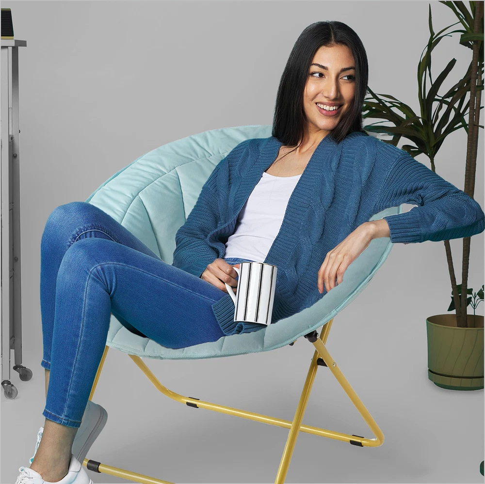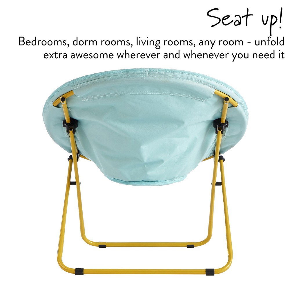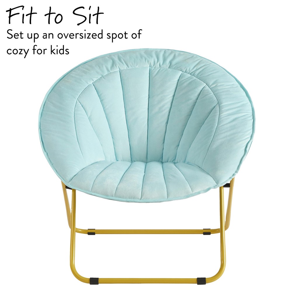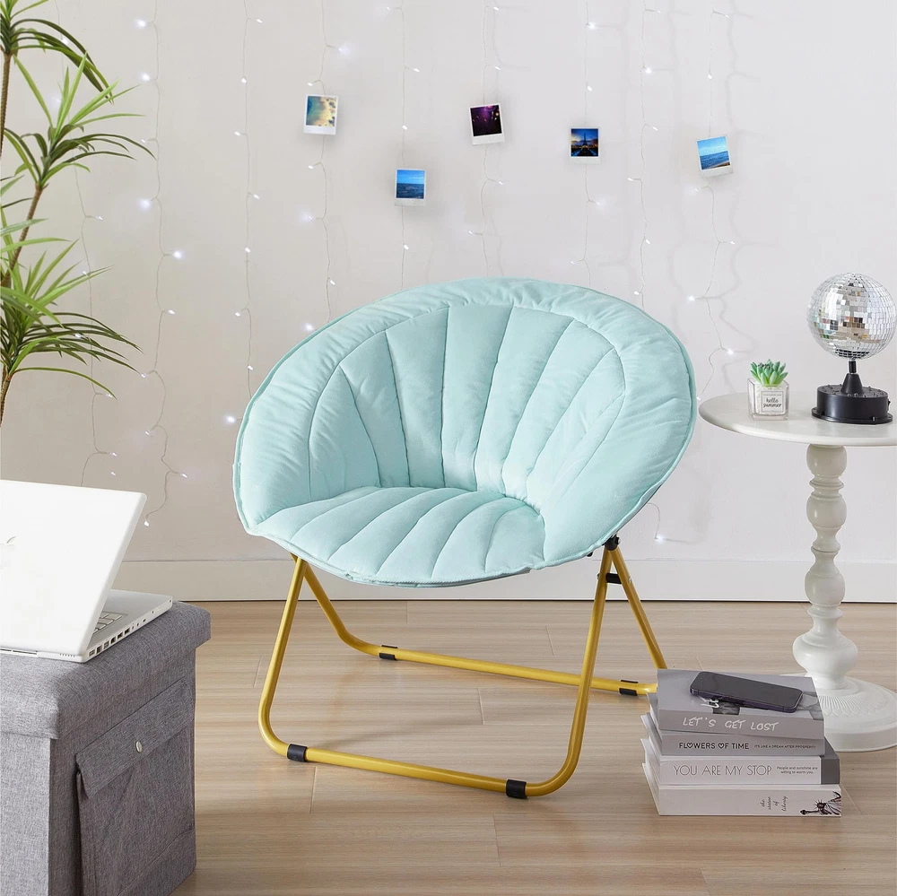 Accent any room with this Urban Velvet Channel Stitch Saucer Chair. It has a wide design and cozy velvet fabric for a comfortable place to study, relax or watch TV after a long day. The Urban Velvet Channel Stitch Saucer Chair features a durable steel frame and is easy to transport or . It's ideal for dorm rooms, apartments, bedrooms and more. It adds a pop of color to any room and is sure to become everyone's favorite spot to sit or lounge. Add contemporary style to your living room or den area, entertainment room or any space where you need comfy extra seating. This Urban Velvet Channel Stitch Saucer Chair makes a wonderful addition to your home and is also ideal for gaming or to place in a playroom. No assembly required. COMFORTABLE COZY DESIGN: This Velvet Saucer Chair will hug your body when you are relaxing while watching TV, reading, playing video games or lounging around. Made with soft velvet fabric, this chair is extra cozy for sitting and lounging around. FOLDING FRAME - NO ASSEMBLY REQUIRED: Ready to use once you receive your package! This no assembly chair will be ready to enjoy once it arrives. Just unfold and place in your desired room of the house. Simply fold chair down flat for easy storage or transport when not in use. HIGH QUALITY: Constructed from a sturdy metal tubular frame that features a safety locking mechanism on the leg. Faux Fur fabric is made from durable, high quality Polyester that is easy to clean and maintain by spot cleaning with soap, sponge or warm water. VERSATILE USE: Place this chair in any room of your house, dorm room or apartment for an added cozy seating option. Enjoy this chair in your bedroom for lounging or place in your Living Room or Dens for a go to seat to unwind and watch TV or read a book. Available in a variety of colors, this chair is perfect for anyone and makes for a great gift! DIMENSIONS: This super soft saucer chair measures 27.95"L x 30.70"W x 27.74"H. The edge of the front seat is 14” from the floor, and seat is 16” deep and has 19” back. An ideal perfect size for kids, teens, and young adults.