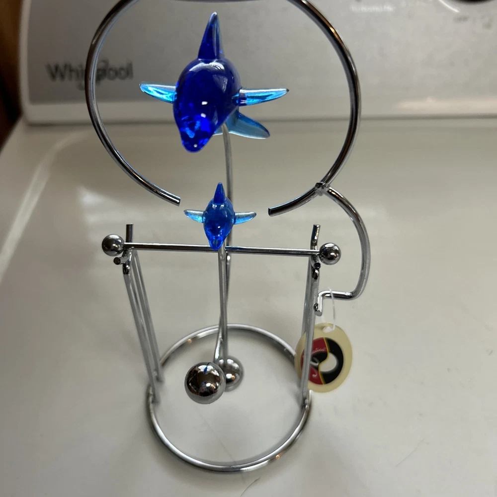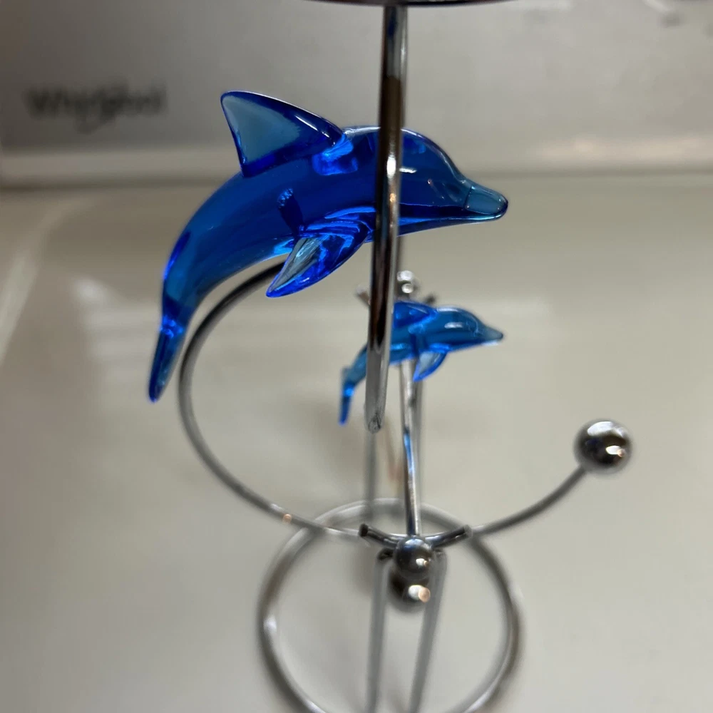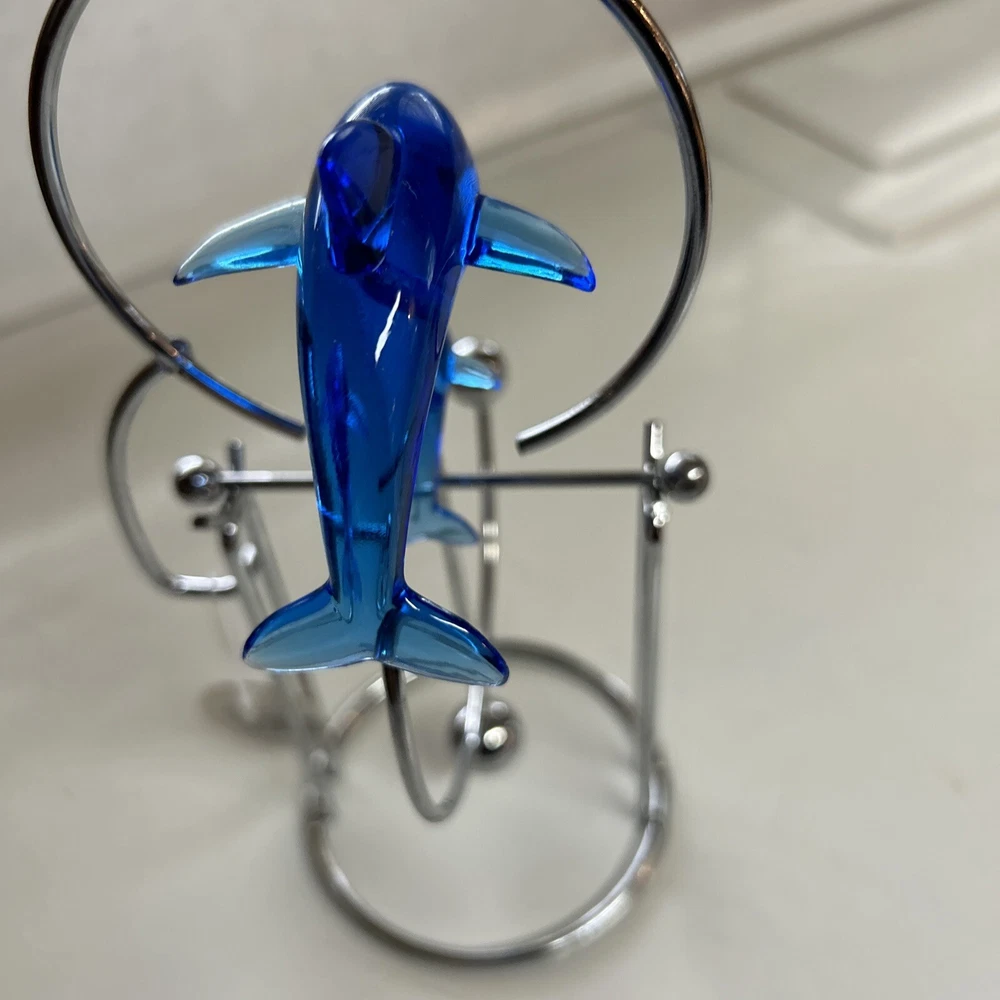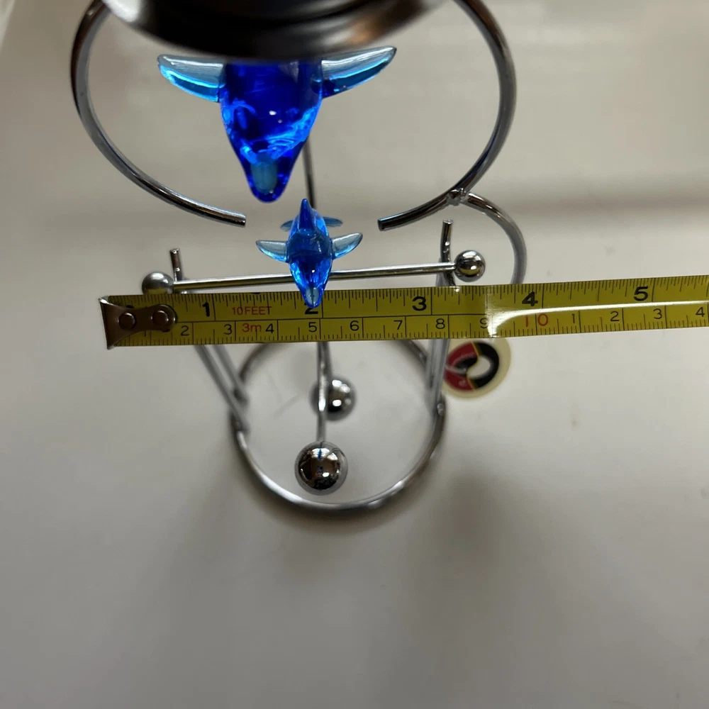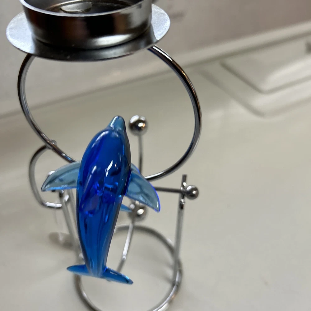 Add a touch of oceanic charm to your desk with this Blue Whale Shark kinetic motion desktop Candle decoration Tea-light. Crafted from resin and chrome, this medium-sized figurine is an asymmetrical shape with a height of 8 inches and a width of 4 inches. The blue color and marine theme make it a perfect addition to any room, including the office and bedroom. The figurine is a Whale Dolphin Figurine Kinetic Candle Holder, featuring a cute and cuddly dolphin design. It is made in China and is perfect for those who love sculptures and figurines. The item is a great gift for anyone who loves marine life and wants to add a unique touch to their home decor. New with tag Tealight NOT INCLUDED