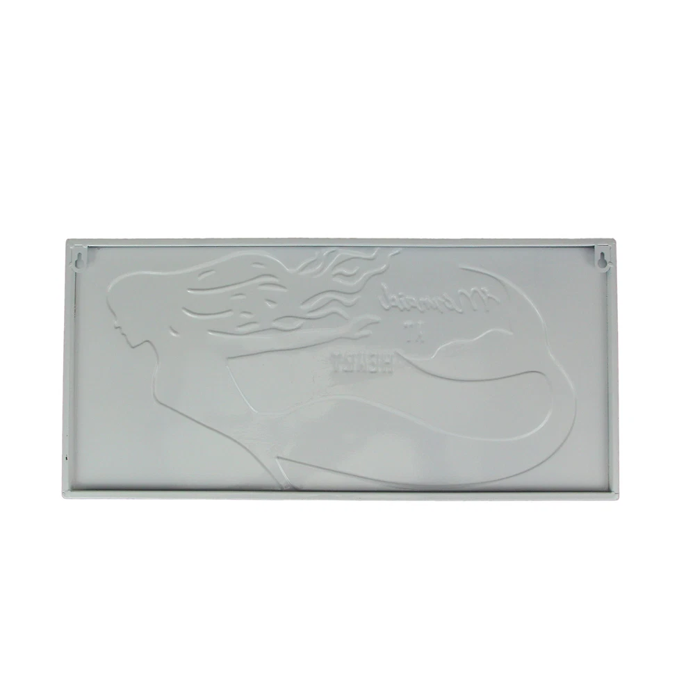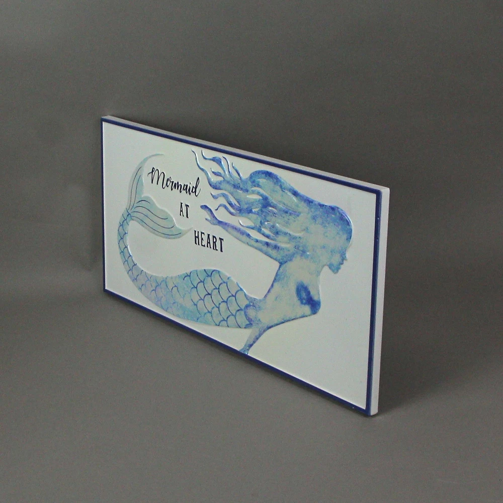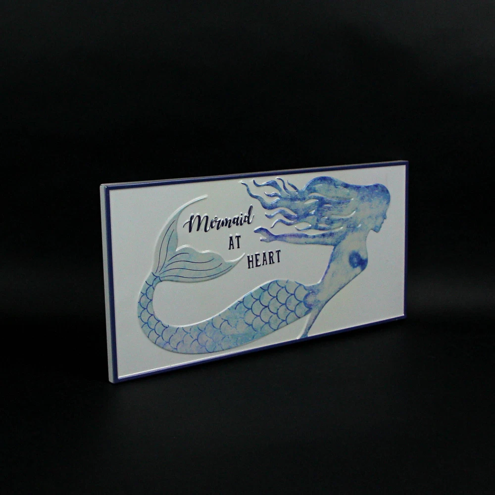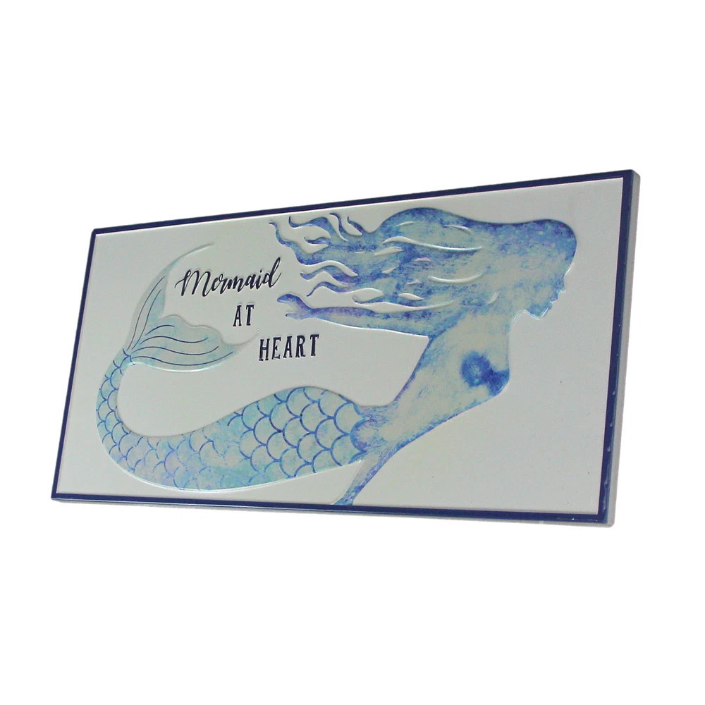 This beautiful "Mermaid at Heart" stamped metal sign is a wonderful addition to any room with a Coastal or ocean theme. It has a white enameled finish, with blue and teal accents. The sign measures 22 inches long, 10.25 inches high, and 0.5 inches thick. It hangs easily on your wall, using the pre-attached keyhole hangers on the back. It makes a perfect gift for any mermaid lover. Our eBay Store About Us Add to Favorite Sellers Blue / White Enamelware Mermaid at Heart Metal Wall Sign Coastal Decor OVERALL SIZE - 22 Inches Long, 10.25 Inches High, 0.5 Inches Thick DURABLE MATERIAL - Crafted of Metal For Years of Maintenance Free Display COASTAL COLORS - Perfect for Any Beach Theme INDOOR / OUTDOOR - Great for Porches and Patios GREAT GIFT - For Yourself, Friends and Family This beautiful "Mermaid at Heart" stamped metal sign is a wonderful addition to any room with a Coastal or ocean theme. It has a white enameled finish, with blue and teal accents. The sign measures 22 inches long, 10.25 inches high, and 0.5 inches thick. It hangs easily on your wall, using the pre-attached keyhole hangers on the back. It makes a perfect gift for any mermaid lover. Product Details Color White Height 10.25 Length 22 Weight 1.6 LB