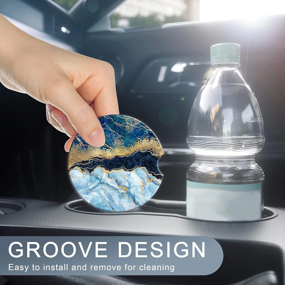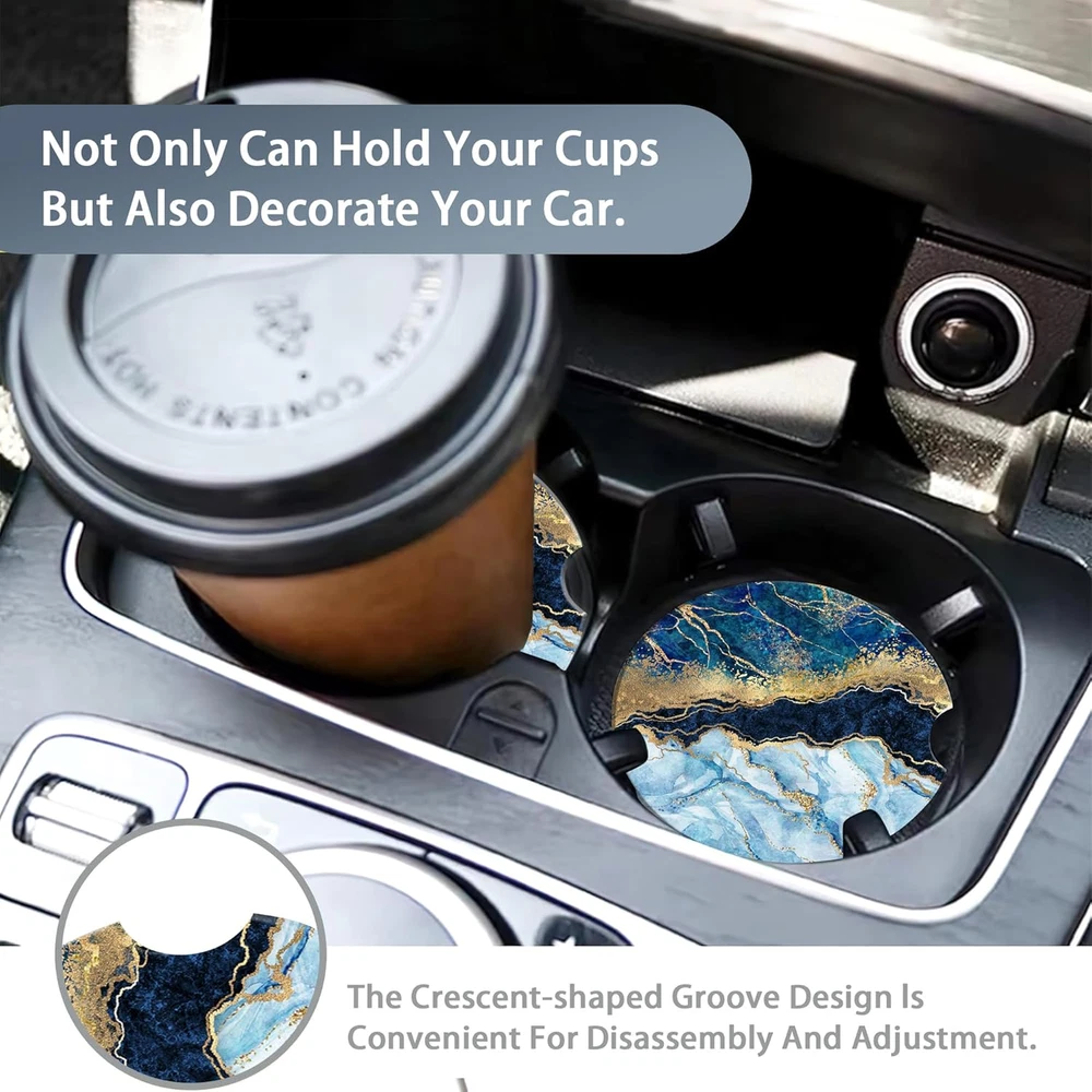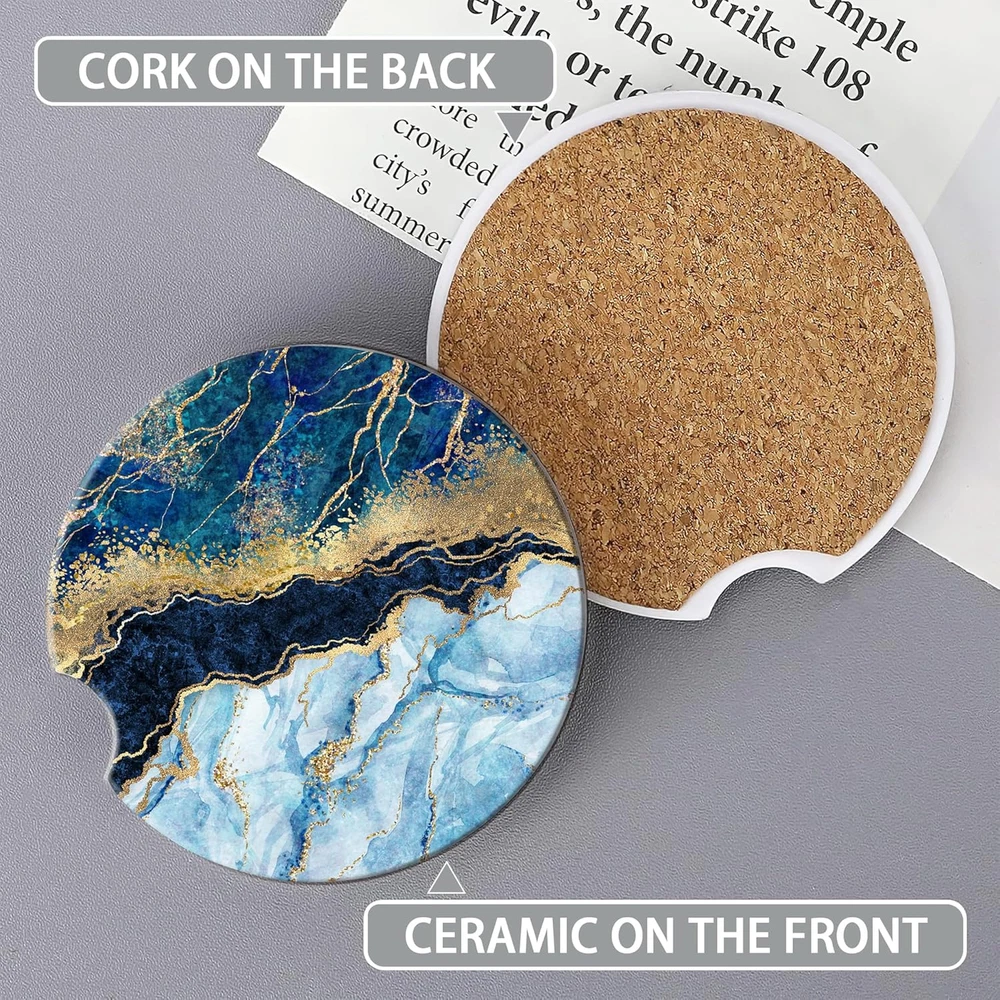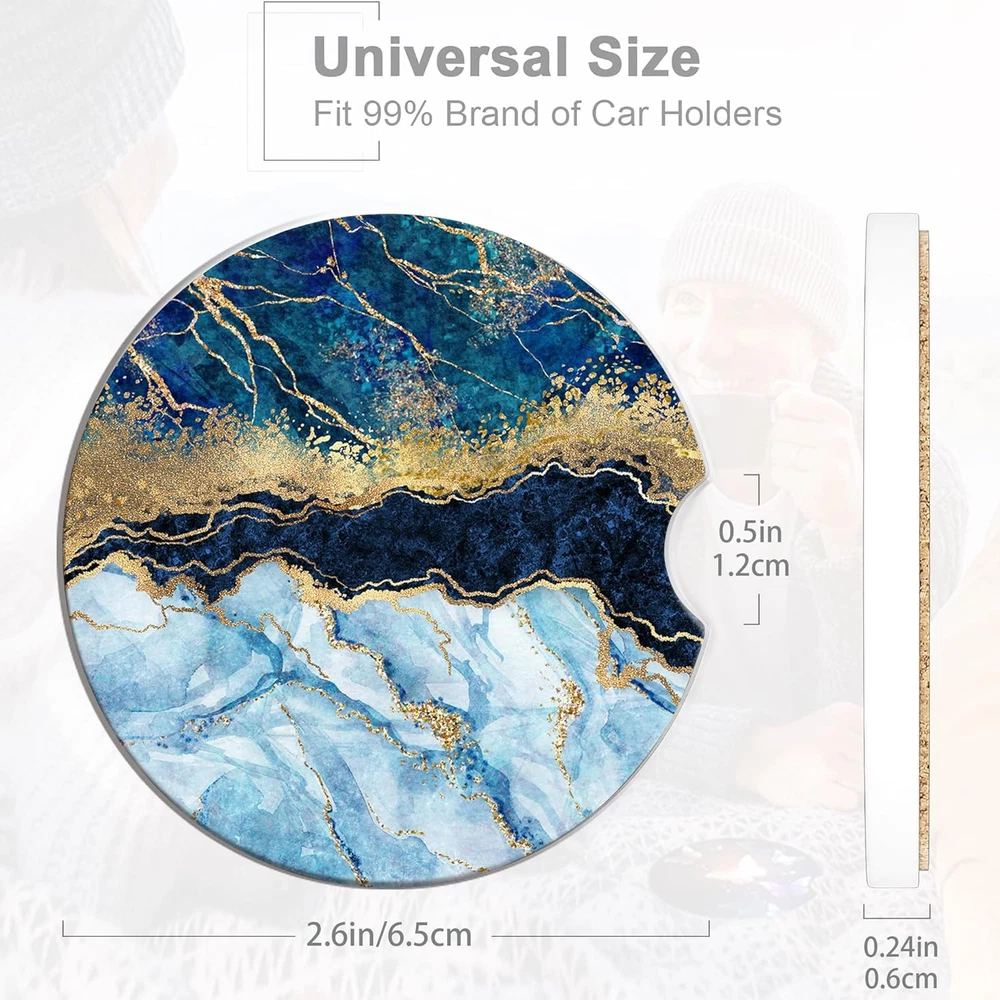 Blue White Gold Marble Car Coasters for Women 2 Pack,Abstract Absorbent Car Coas