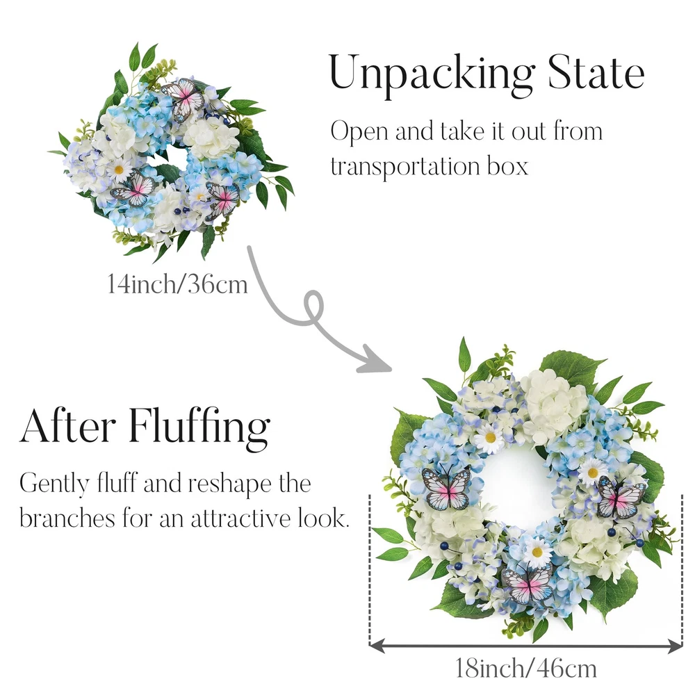 Spring Hydrangeas Wreaths for Front Door with Lights, Blue White Summer Artificial Floral Wreath with Eucalyptus Leaves Butterfly for Home Porch Wedding Party Wall Outdoor Decor-18'' 【Original Design】is a retail brand adhering to original seasonal decorations. Beneath the gentle sunlight, experience the fresh colors of spring intertwined in the designs. In this enchanting Spring Summer season, bring nature’s beauty to your home with —ideal for summer holiday party front door decor. 【Abundant Accessories with High Fidelity】The 18 inch wreath is constructed with a base of real touch branches and adorned with rich elements including soft tough blue and white hydrangeas flowers, white daisy, eucalyptus leaves, realistic butterflies, and more. These elements are skillfully arranged on a natural rattan base, creating a vivid and realistic scene—A stylish accent to make your summer living space bloom. 【Lights with Timer】 This front door wreath is provided with 20 warm LED lights (not pre-lit), offering you the freedom to create a unique lighting arrangement. Switch to the "TIMER" for 6 hours on/18 hours off. (2 AA batteries required, not included). Add a warm, inviting glow to your home this summer with customizable lighting. 【Sturdy Base and Solid Accessories】Crafted with meticulous attention to detail, each component is securely fastened to ensure longevity and resilience against the elements. This Spring Summer wreath will be placed in a box for transportation. No tools are needed, just manually adjust the accessories to expand the wreath. 【Versatile Use】This door wreath is suitable for both indoor and outdoor use. It can be hung on wall, fireplace, window, or placed above the entrance or on a mantel. It can also serve as a centerpiece on a tabletop, offering a warm welcome to family and friends. Additionally, is a thoughtful gifts for Mother’s Day, weddings, anniversaries or Spring Summer daily home decorations. 【More Options】The flower wreath pairs perfectly with our Spring Summer garlands, allowing you to create a harmonious and visually appealing home look.