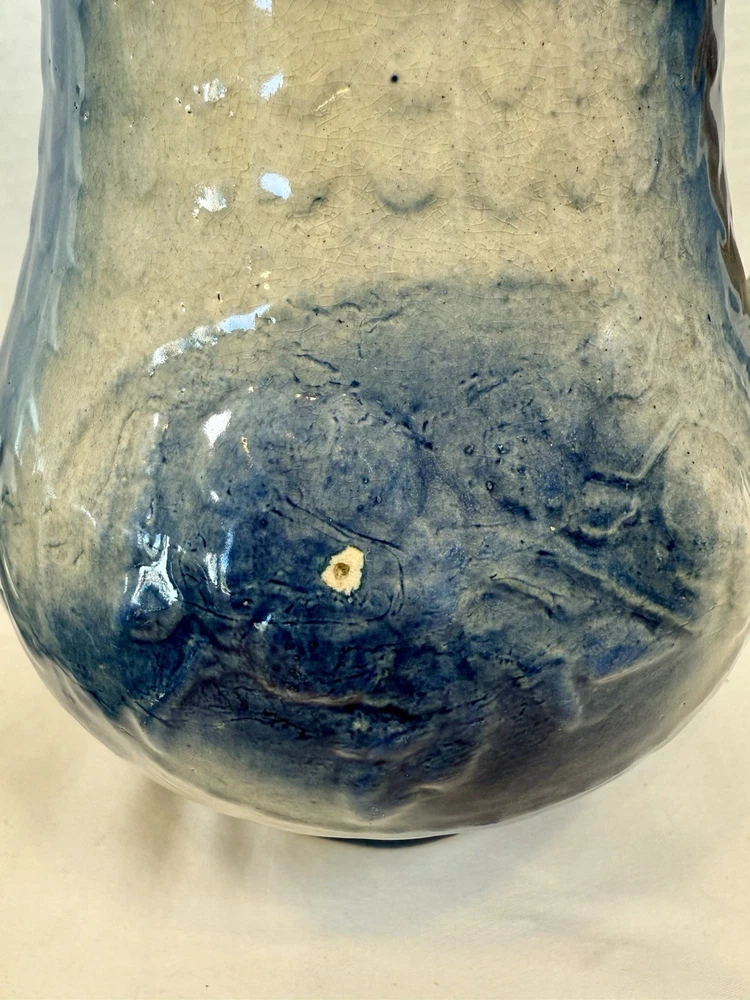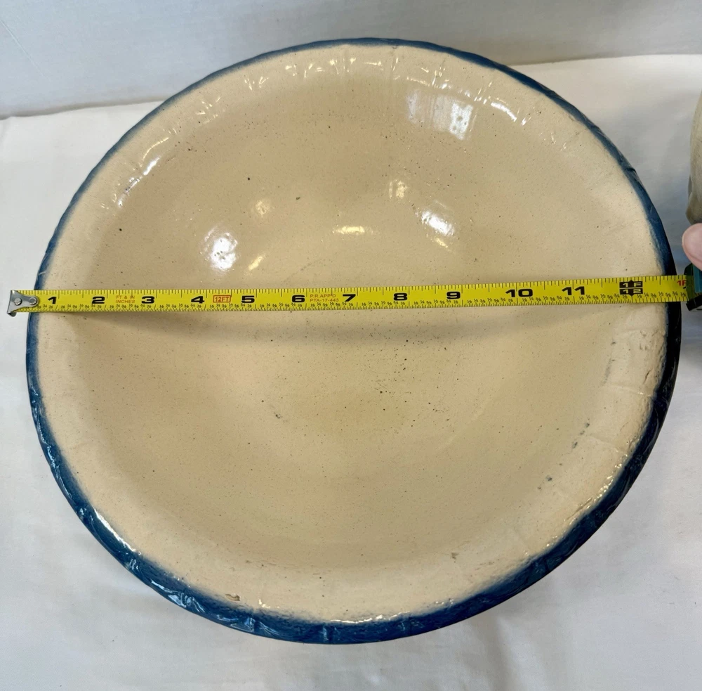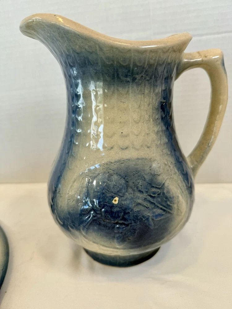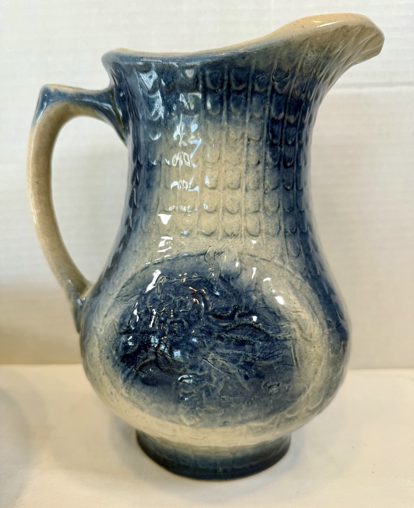 ** see pics for small chip (not all the way thru). This two-piece Blue & White Stoneware Wild Rose Pitcher & Bowl Basin Wash Bath Set is an antique Victorian-era piece handcrafted in the United States. The set features a beautiful fishscale and wild roses pattern on semi-gloss finish stoneware, with a blue color scheme. The pitcher and bowl are both round in shape, with the pitcher standing at 10 inches tall and the bowl having a diameter of 15.25 inches. This vintage wash set is perfect for all occasions and adds a touch of floral charm to any home decor.