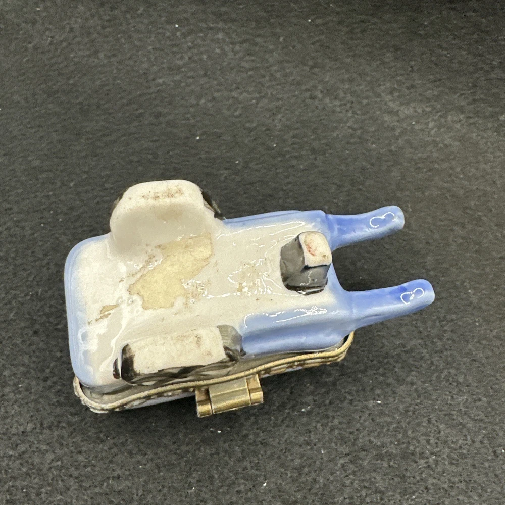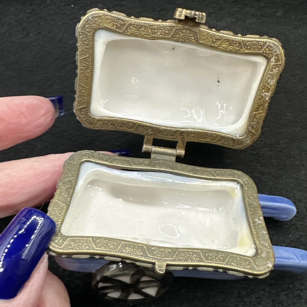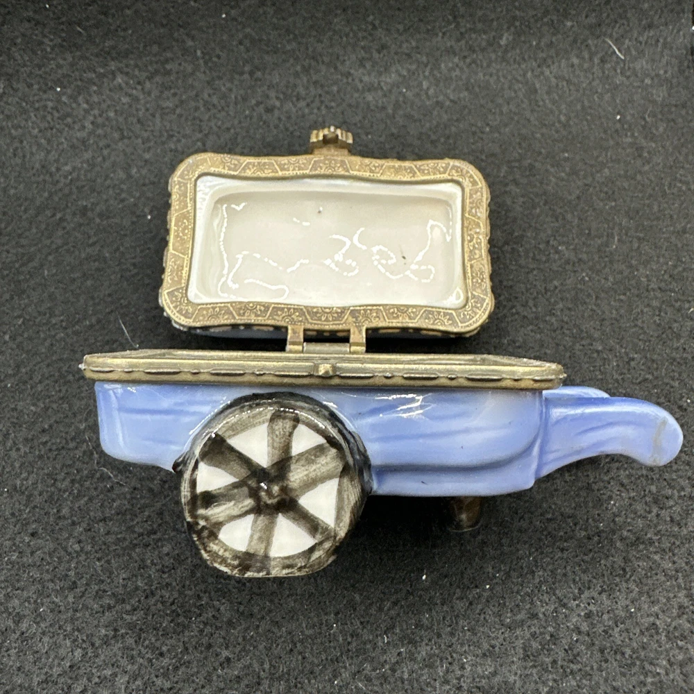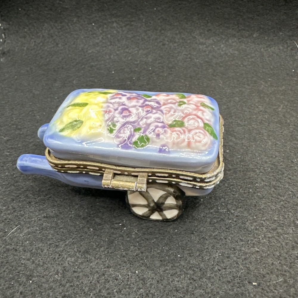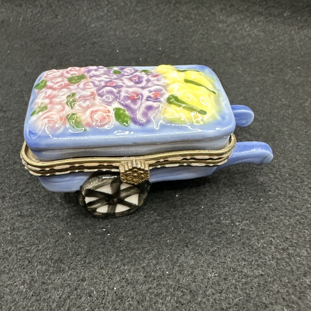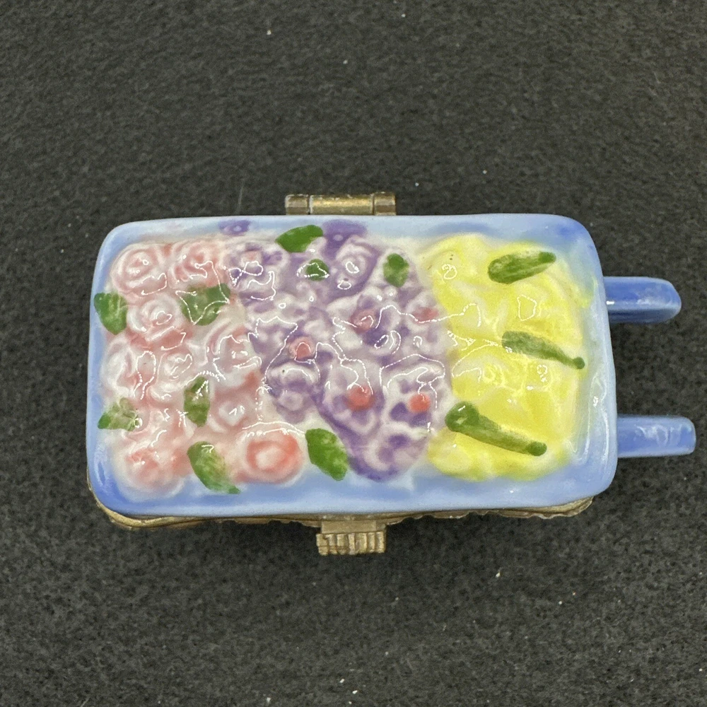 This charming vintage trinket box is perfect for any gardening enthusiast. The ceramic wheelbarrow design features beautiful yellow flowers and a glossy finish. Measuring at 3 inches in length and 1.5 inches in height, it's a small but stunning addition to any collection. Ideal for adults, this asymmetrical trinket box can store jewelry, small keepsakes, or any other cherished items. The unboxed packaging adds to the vintage charm, and the country/region of manufacture is unknown. This collectible item is categorized under decorative collectibles and boxes, jars & tins. Add some floral flair to your decor with this lovely vintage trinket box.