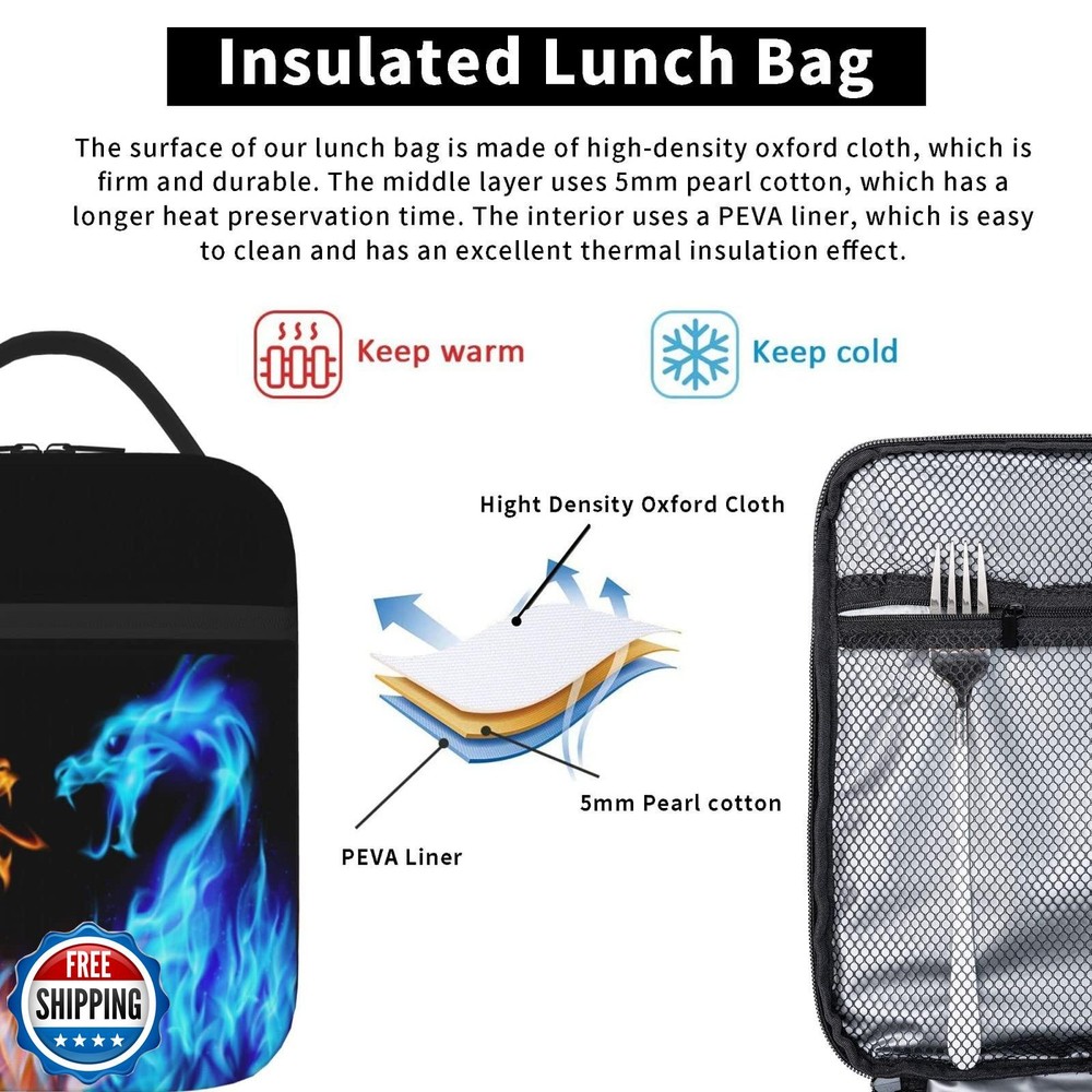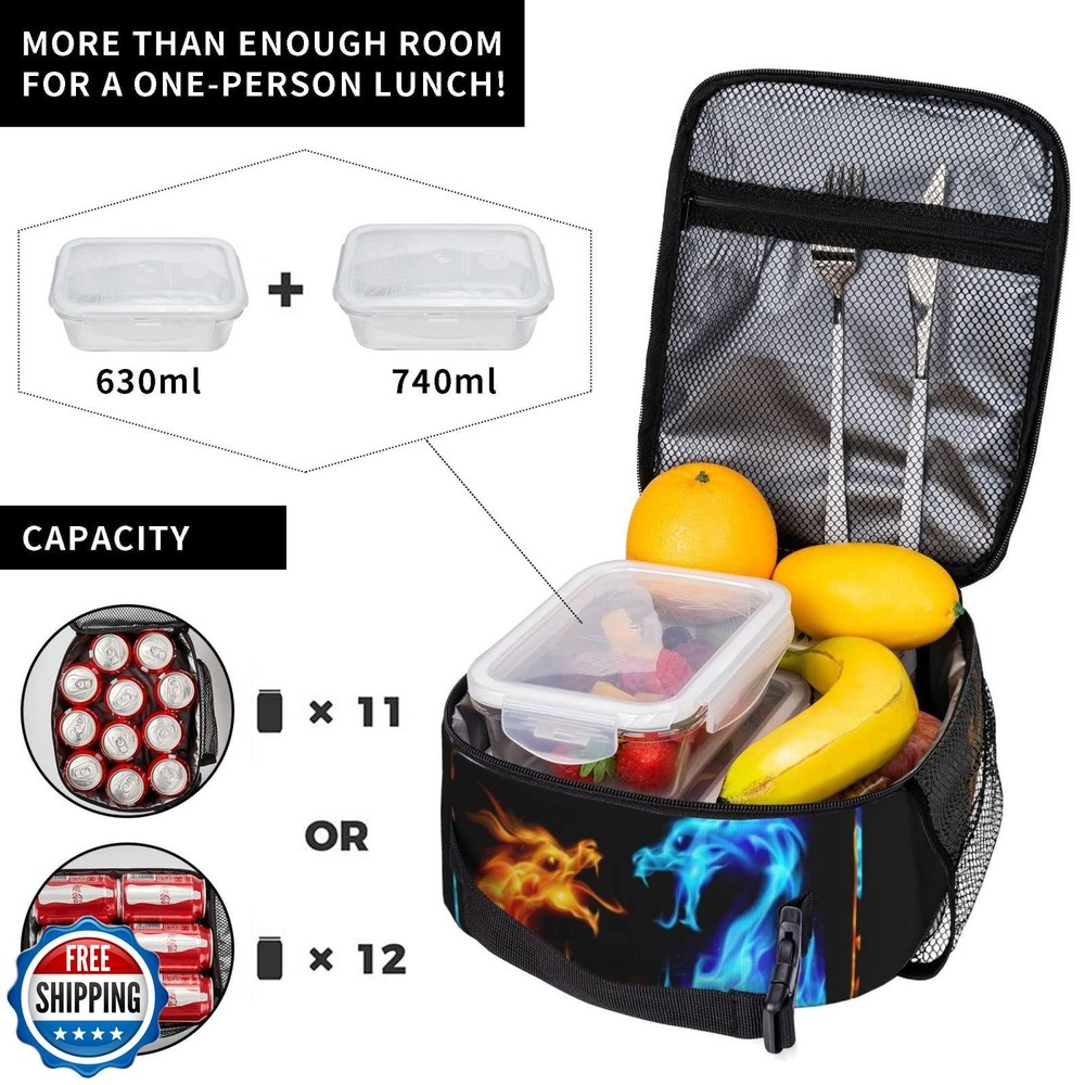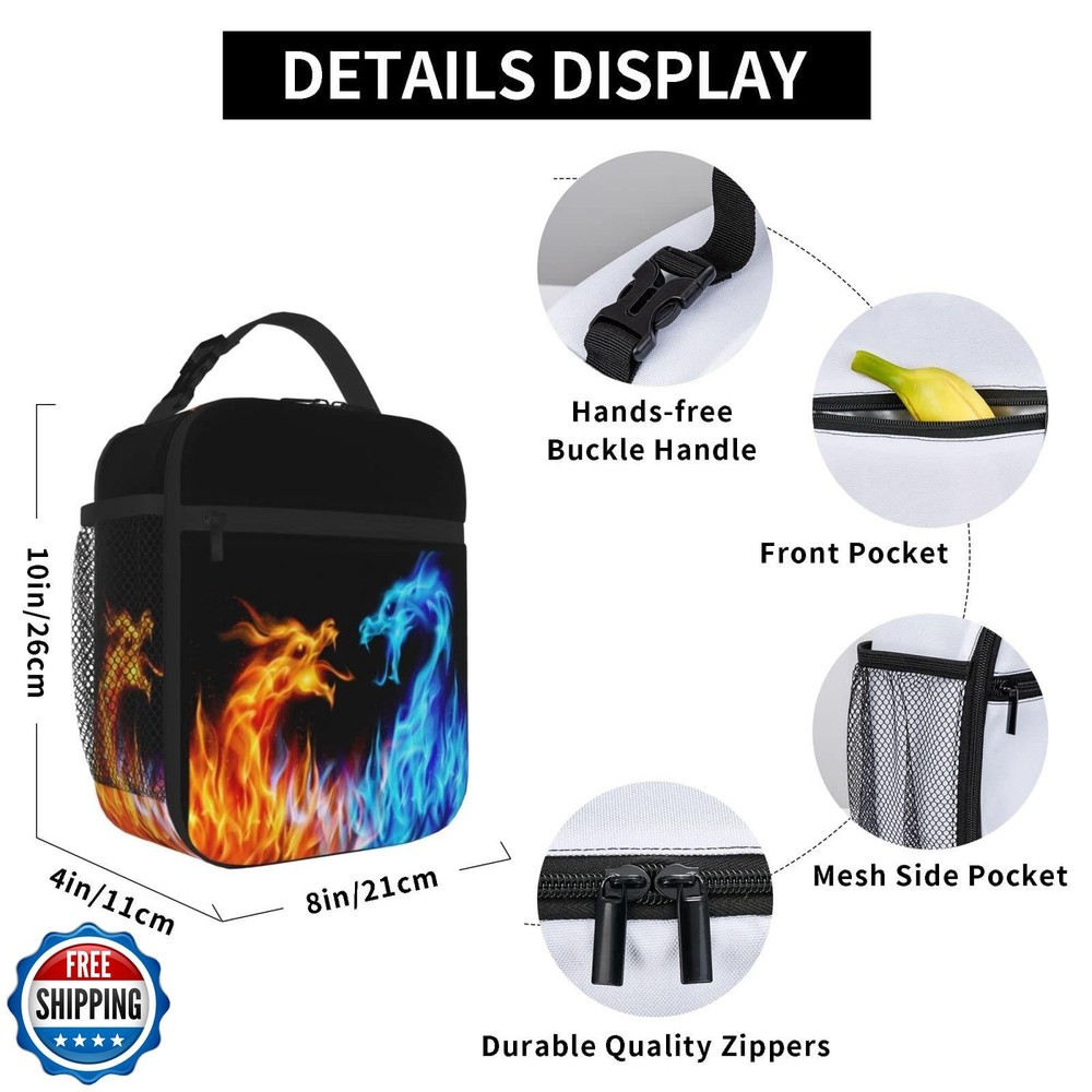 Blue And Red Fire Dragon Reusable Lunch Bag Lunch Box Kids,Kids Lunch Box For Girls Boys,Insulated Lunch Bag For Kids,Easy-To-Clean Bento Box Bento Bag,Loncheras Lunchbox For Work/School/Picnic Features 【Insulated Lunch Bag】: This Fashionable Lunch Bag Keeps Your Food Fresh For Longer Than Plastic Lunch Boxes Or Paper Lunch Bags. Insulated, This Lunch Bags Are Made Of Rubber Material,So It Can Keep Food Cold Or Warm For A Few Hours. 【Capacity】The Spacious Lunch Handbag Can Easily Accommodate All Snacks, Drinks, Sandwiches, Fruits Or Vegetables. You Can Take It To The Office, Pack Healthy Snacks For Your Family Or Enjoy A Happy Sunday Picnic. 10 X 8 X 4 In, Suitable Size, Easy To Carry. 【Cute Designs】: Choose From A Variety Of Unique, Stylish Designs, And Support The Arts. The Special Style Make The Lunch Bags Distinctive, And It Matches Well With All Your Dress Style, And Popular Patterns Suitable For Anyone Of All Ages. 【Reusable And Eco-Friendly】:Rather Than Throwing Away Paper And Plastic Bags Everyday After Lunch, Protect The Environment With This Reusable Lunch Bag.Our Portable Lunch Totes Keep Your Food Safe From In Cheaper Plastic Lunch Boxes. 【Multi-Function】: The Large Insulated Lunch Bag Not Only Can Be Used For Work Lunch Tote, It Also Can Be Used As Picnic Tote Bags, Sundry Bag, Shopping Bag As It'S Capaciousness, It Has Heat/Cold/Fresh Preservation, Can Be Used To Pack Frozen Food, Hot Pot Dishes, Frozen Drinks, Ice Cream, Etc. 【Applicable age 】:6+years old Shipping Free & Fast Shipping: We offer free shipping to most of the USA with a normal delivery time of 3-7 days. However, due to the current situation, additional delivery time (up to 3 weeks) may be required for some items. Alternative Carriers: We may use alternative carriers (e.g., USPS, FedEx, UPS) to ensure your package arrives safely and on time. Due to the use of multiple carriers, we are unable to provide a tracking number automatically. Handling Time: Orders are processed and shipped within 1-2 business days of receiving cleared payment. Shipping Restrictions: Shipping to Alaska, Hawaii, Puerto Rico, Guam, and other US territories may incur shipping charges or delivery restrictions. Please contact us before ordering, or your order can be refunded/cancelled. State Restrictions: Certain items may not be shipped to California due to state regulations. Contact for Tracking Updates: If you require tracking updates or have any concerns about the delivery of your order, please feel free to contact us, and we will be happy to assist you. Return Policy 30-Day Hassle-Free Returns: If you are not completely satisfied with your purchase, you can return the item for free within 30 days of receiving it for a full refund or exchange. Easy Return Process: Contact us, and we will provide you with a prepaid return shipping label and detailed instructions. No Restocking Fee: There are no restocking fees for returns. However, the buyer is responsible for return shipping costs if the return is not due to a seller"s error. Refund Processing: Refunds will be processed within 1 business day of receiving the returned item in its original condition. Feedback Your feedback is extremely important to us. We strive to provide the best products and customer service possible. If you are satisfied with your purchase, please take a moment to leave us a positive review. If you have any concerns or issues with your order, please contact us before leaving negative feedback. We are committed to resolving any problems and ensuring your satisfaction. Contact Us If you have any questions or concerns, please feel free to reach out to our customer support team. You can contact us through the eBay messaging system. We are available Monday to Friday, 9:00 am to 5:00 pm EST, and we will do our best to respond to your inquiry within 24 hours. Thank you for supporting our small family business!