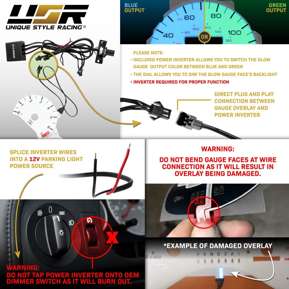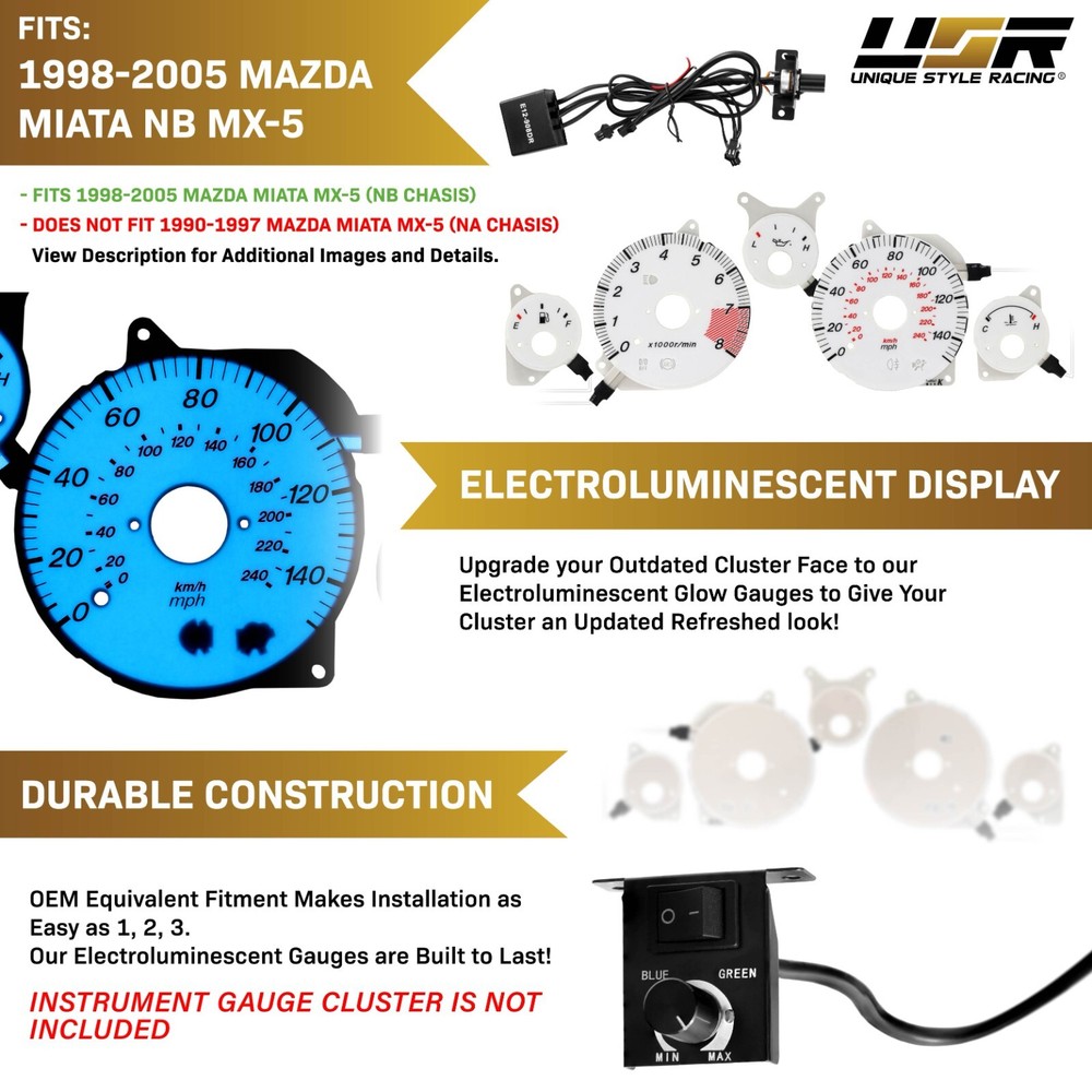 ATTENTION: For fitment and address issues, we will contact you through eBay message system first and by phone. If we are unable to get a hold of you or we cannot ship your order within 24 business hours after your order is placed, we will cancel the purchase instead. Please be sure you check product info carefully and enter your address correctly before purchase. Thank you. visit our store | View feedback | Sign up for our newsletter Please read and understand our complete description and policies/terms below prior to buy. EL-AC001-4 DESCRIPTION Product Details: This listing is for a BRAND NEW Blue/Green Glow Gauge Overlay with an Inverter Dimmer Switch Fit for: 1998-2005 Mazda Miata MX-5 - NB chassis (Please always check the top speed and Redline on RPM matches between your stock instrument cluster vs. Glow Gauge set sold here) Features: * Upgrade to a more Aggressive Blue or Green Output Glow Gauge * Made by ISO2001 certified manufacturer, Excellent Quality! Specs: * Brand: Unique Style Racing (USR) * Type: Glow Gauge Overlay * Color: White Gauge Face by Day / Blue or Green Glow by Night * Surface: Non-Glare/Scratch resistant * Install Process: These gauges do not require the removal of the gauge needles for installation. Though we provide reference installation links upon request, no installation instruction will be included. In the Package: * x1 Glow Gauge Overlay Set * x1 12V Power Inverter Switch Special Note: * Though we provide reference installation link (at buyer request), we highly suggest professional installation. * WARNING: This is the Gauge FACE overlay ONLY. The entire gauge cluster is NOT included. You lay the Overlay face on top of your existing gauge cluster, as this gauge face DOES NOT replace your STOCK cluster. The Glow Gauge Overlay Face here can only worked with the 12V power inverter supplied and the 12V power inverter dimmer should NOT be connected to stock gauge cluster's own dimmer for power. Buyer's discretion is advised, please purchase the item accordingly!! Important Notes: - Although DIY is possible, CERTIFIED & LICENSED PROFESSIONAL INSTALLATION is HIGHLY SUGGESTED . - We do not provide Installation Instruction except the manufacturer's original ones if there is any. - Direct OEM STOCK Replacement - No modification needed to fit the specified years / make / models / trims. - Our Products Are SPECIFICATION SENSITIVE and we ship DOOR to DOOR ONLY. Any package being sent to "FORWARDING COMPANY" is not our responsibility. - You, as the buyer / consumer are solely responsible for all damages and losses. - We highly recommend you to buy new gaskets prior to install the product you purchased from our company since the stock ones by now should have been worn out, therefore, it is easily allowing moisture to get in and create condensation which is NOT due to the product that has leak, but bad gaskets. - Some EXCEPTIONS For Warranty Claims: A.) No visible / physical damages to the product and / or warranty is void, B.) Alteration to the product will result in termination of warranty, C.) Be sure the stock gaskets or rubber seals are not torn and worn as you will need to reuse them when you replace your stock lights with ours. You will also be asked for photos that documents any *leaking*, *misting*, *fogging up* and *condensation* issues, as well as the condition of your stock gaskets or rubber seals. and lastly, D.) All of our lighting assemblies are NOT compatible with XENON HID and LED-type bulbs. Please use either incandescent or halogen bulbs per advertisement. - Please be sure to check the provided PHOTOS, read the DESCRIPTION and ask QUESTIONS before purchase. Thank you for your business. ABOUT US We're genuine and honest sellers and we carry great selection of the quality products to choose from, at a competitive pricing. Every order is carefully packaged and inspected by three of our staff using the latest technology to ensure safe shipment to you. We value good relationship with our customers and if you have any question or concerns regarding a sale, please do feel free to contact us first. Please do check your ebay message often for your order status, we will contact you for any delay that is caused by the payment or shipping complication arises from processing your order. We hope you enjoy your purchase! PAYMENT We accept payment by: Paypal. We accept PAYPAL only at this moment for all ebay transactions and MUST ship to paypal's listed address. 1.) If you are using eBay?s checkout system, please ensure that your registration information is current and will match what you have on PayPal. We will not be able to accommodate to change the original address we receive at the time of payment with an alternative one, once the transaction is completed via eBay and PayPal. 2.) We are required to ship to the address attached to your payment only. 3.) We will not be able to ship to an alternative address besides the original address shown on your PayPal payment detailed page. 4.) Please DO read and understand the policies / terms prior to buy to avoid any future discrepancy from occurring. Thank you for your cooperation! SHIPPING Please read and understand our complete policies/terms below or ask question if you have concerns prior to buy. 1.) Free shipping only applies to the listings that have the ?Free Shipping? icon displayed and for completed transactions. Any canceled, incomplete, refused or undeliverable packages are subjected to a 20% re-stocking fee + all shipping related fees. 2.) Shipping costs incurred are non-refundable under any circumstance. Shipping costs are incurred and paid to the shipping courier and they are not refundable. 3.) We DO NOT ship to APO / FPO, GUAM, MP, PUERTO RICO (PR) and VIRGIN ISLAND (VI) 4.) INTERNATIONAL COUNTRIES: Buyer is responsible for all Brokerage Fees, Taxes & Duties - which may be charged upon delivery. Please contact your local shipping agent to determine your estimated taxes & duties. 5.) Pick up / Will Call servic