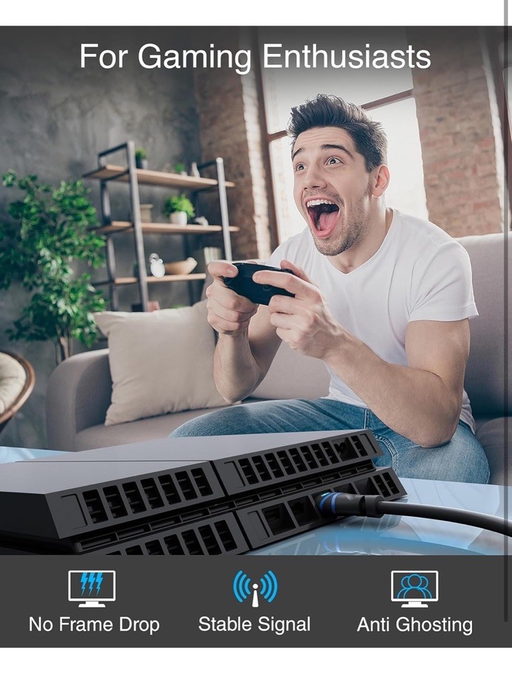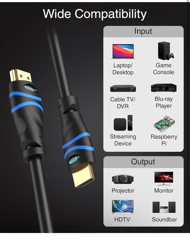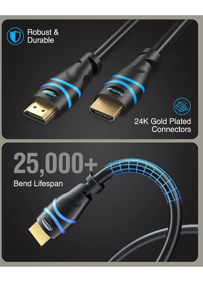 Open box New item! ➤ High Speed 4K HDR HDMI: This cable supports HDMI 2.0b including upto 18Gbps high bandwidth (600 MHz Refresh Rate), Mirror & Extend mode, Ultra HD 4K 30Hz, HD 2K 1080p, QHD 1440p, HDCP 2.2, 48 bit/px HDR color depth, Audio Return(ARC), 3D,Ethernet,Dolby TrueHD 7.1 and hot plugging ➤ Heightened Viewing Experience: Supports HDMI 2.0 standard and backwards compatible with HDMI standards . Enjoy unparalleled video quality, crisp and accurate sound with no lag ➤ Unmatched Quality: The cable has 24 AWG copper wire and triple shielding . 24K Gold-plated full metal jacket connectors resist corrosion while maximizing stable signal strength. Can withstand over 25,000+ bend lifespans ➤ Universal Compatibilty: Compatible with all of HDMI devices like Blu-ray players, Fire TV, Apple TV, Roku, XBox One, Nintendo Switch, PC, laptop, monitor, projector etc. Perfect for home and office use