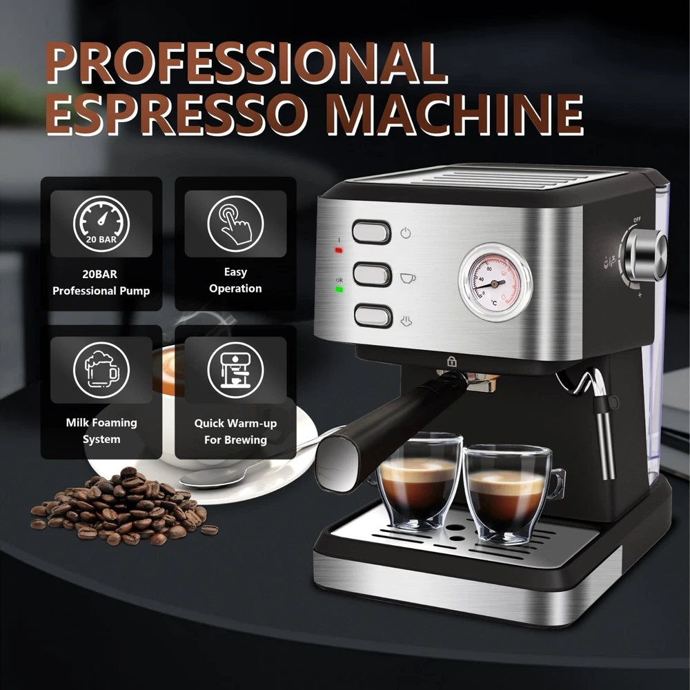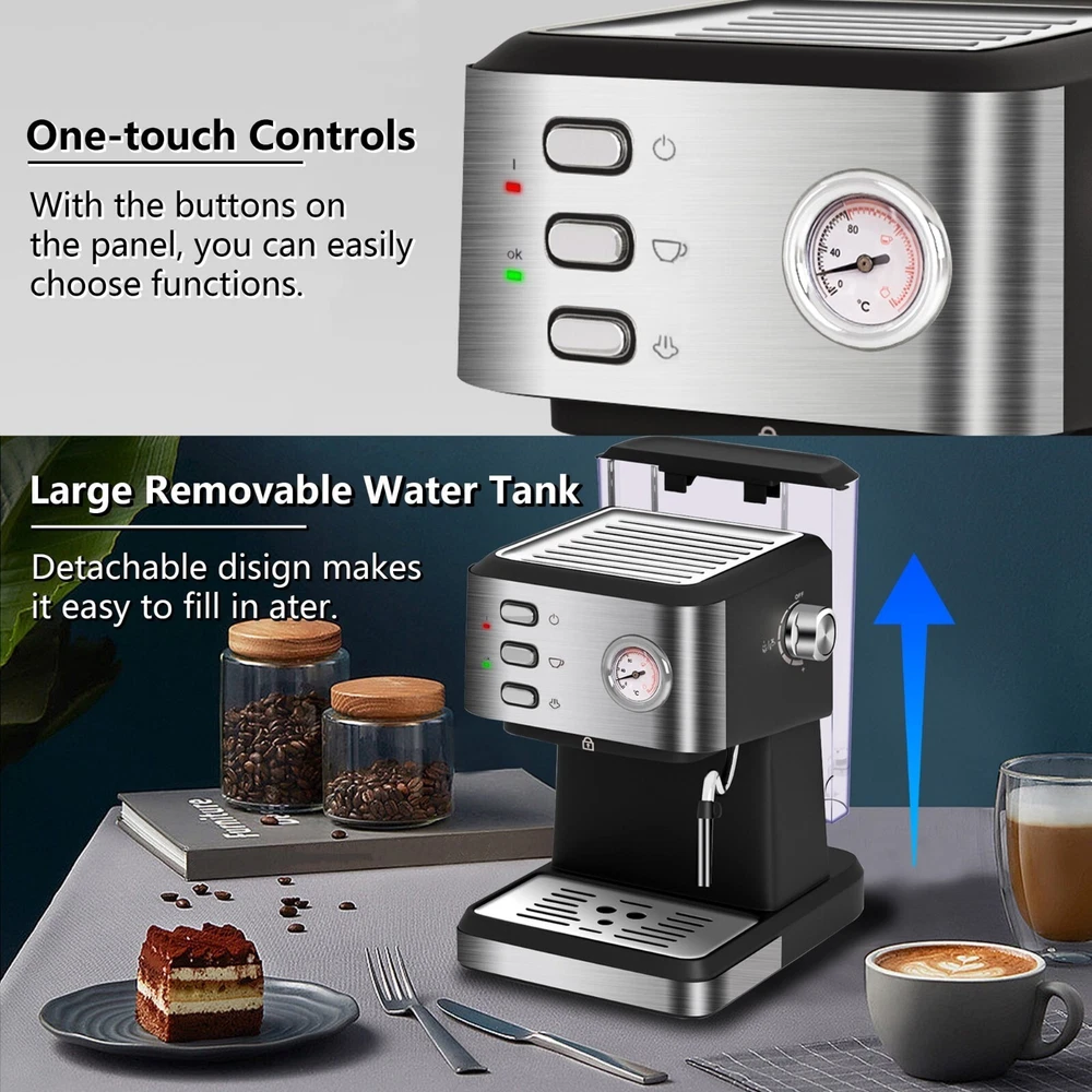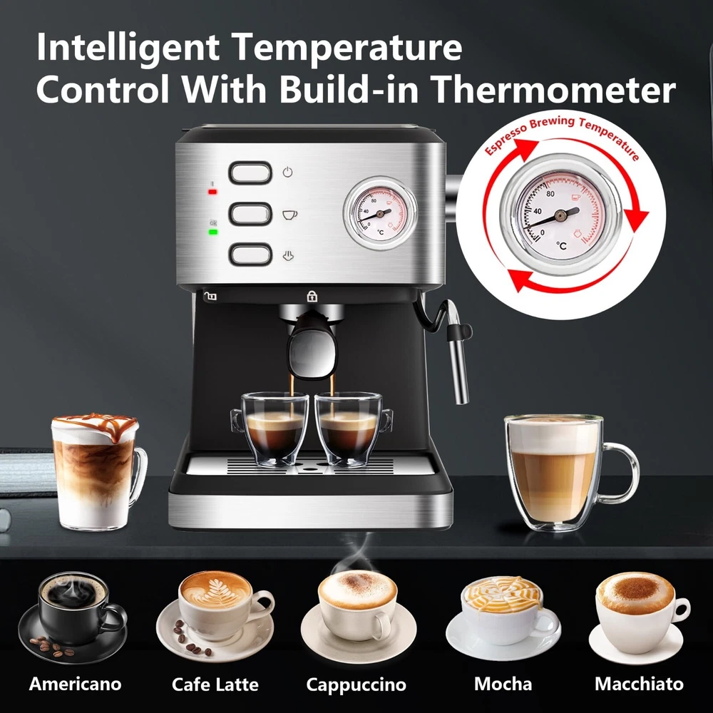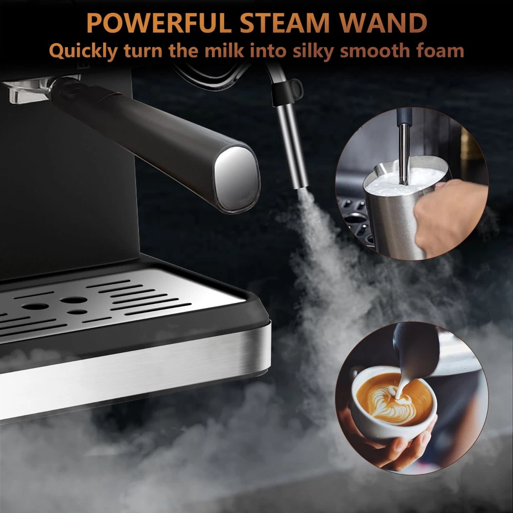 20 BAR PRESSURE FOR HIGHER QUALITY EXTRACTION: The espresso coffee machine is with a 20 bar high pressure pump that creates nice dense, maximizes the extraction of the coffee beans aroma and develop the quality of the natural oils. PROFESSIONAL FROTHING WAND: Frothing milk for cappuccino and latte by hot steam wand. The steam wand rotate 360 degrees, which can produce silky and smooth milk foam better. DOUBLE TEMPERATURE CONTROL: With an accurate dual temperature control system, the temperature of water and the taste of milk foam, foam, coffee and milk can be adjusted to achieve the ideal state. FOR BEST FLAVORS: Two cups of 60ml/ 2oz, about 14g/ 2 spoons powder for the best concentration. COFFEE DRINKS: Create an cappuccino, latte or flat white at home or office. The removable froth nozzle makes the cleaning easily.