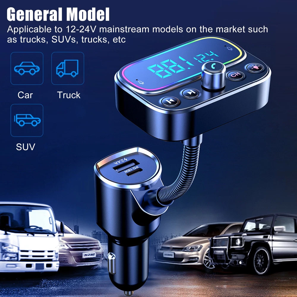 Product Description Bluetooth 5.0 Car Wireless FM Transmitter Adapter 2x USB + Type-C AUX Hands-Free Features: With dual microphones and CVC noise cancellation technology, this car Bluetooth adapter ensures clear sound and eliminates background noise and echo. Its advanced Bluetooth 5.0 chip provides a stable connection and fast transmission, delivering crystal clear calls and exceptional Hi-fi music streaming while driving. Equipped with a USB-C PD charging port, this Bluetooth audio transmitter charges compatible devices up to 50% in just 30 minutes. It also features a 5V/2.4A USB port for standard charging and a USB drive port that can double as a charging port. Share the charging port with friends while enjoying music. The FM transmitter includes a large LCD screen that displays the FM frequency and car battery voltage, keeping you informed about battery usage. With the power on/off button, you can easily turn off the FM transmitter without the need for constant plugging and unplugging when starting or turning off your car. Note: Charging ports can still be used even when the power is off. Enhance your car's interior with the stylish backlight circle design featuring nine color options: red, blue, green, yellow, cyan, purple, white, rainbow, and breathing rainbow. The backlight makes it easier to locate buttons accurately and quickly in the dark, ensuring safe driving. Note: The light can be turned off. Answer, redial, hang up, and reject calls with a single click of the call button. Seamlessly switch between incoming calls and music. Stay focused on the road by using for Siri or for Google Assistant to make calls, send texts, or get driving directions. Additionally, this Bluetooth car kit supports voice notifications from navigation apps, reducing the need to look at your phone frequently. Specifications: Number of Ports: Dual USB, Type-C Screen: 2.0'' LCD Screen Wireless Transmission Distance: About 10M input Voltage: 12-24V Output: 5V/3A 9V/2A 12V1.5A FM Frequency: 87.5MHZ-108MHZ Package includes: 1 x Bluetooth FM Transmitter 1 x Audio Cable Shipping Returns Contact Us Payment 1. Items sent from US warehouse. 2.Receiving time = Processing time + Shipping time 3. Processing Time: Around 1-2 business Days 4. Shipping Time: 3-5 business day it may have a little delay during some holiday (such as Christmas),any problem ,please feel free to contact 1. 30 days warranty from the purchased date. Please contact us via email before returning the defective item. 2.Our warranty does not extended to any product that are physically damaged or that are not under normal operating conditions as result of misuse or improper installation on the buyer/user's part. 3.Return items should include the original packaging and all accessories. buyers MUST contact us for the returning address. 4.In all cases, buyers pay shipping fees at their own cost to return products for exchange or refund. We will be responsible for the postage of replacements. Refund will be made upon receipt of the returned item. Pls contact us if you have any problems,we will try our best to solve for you We accept all verified payment from eBay. Shipping 1. Items sent from US warehouse. 2.Receiving time = Processing time + Shipping time 3. Processing Time: Around 1-2 business Days 4. Shipping Time: 3-5 business day it may have a little delay during some holiday (such as Christmas),any problem ,please feel free to contact Returns 1. 30 days warranty from the purchased date. Please contact us via email before returning the defective item. 2.Our warranty does not extended to any product that are physically damaged or that are not under normal operating conditions as result of misuse or improper installation on the buyer/user's part. 3.Return items should include the original packaging and all accessories. buyers MUST contact us for the returning address. 4.In all cases, buyers pay shipping fees at their own cost to return products for exchange or refund. We will be responsible for the postage of replacements. Refund will be made upon receipt of the returned item. Contact Us Pls contact us if you have any problems,we will try our best to solve for you Payment We accept all verified payment from eBay. You may also like TV Remote Control Controller For Bose Solo 5 TV Soundbar System 535 AUX1 CM525 18.99 USD Storage Case Travel Carrying Bag For Bose SoundLink 3 SoundLink III Speaker 20.0 USD 4Pcs/Set Tires & Wheels Rims For Tamiya TT01 TT02 XV01 HPS HPI 1/10 RC Car aa 22.77 USD Repair LCD Screen Hinge Flex Cable For Canon PowerShot G7X Mark II G7 X II G7X2 12.75 USD Echo Recoil Starter Assembly A051001312 A051001311 Pe-225 Srm-255 Pas-255 17.84 USD 1.99 USD Portable Adjustable Stainless Handheld Can Opener Jar Bottle Lid Remover Tool 9.99 USD powered by