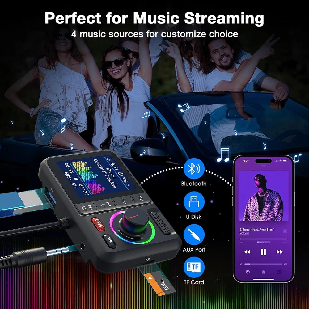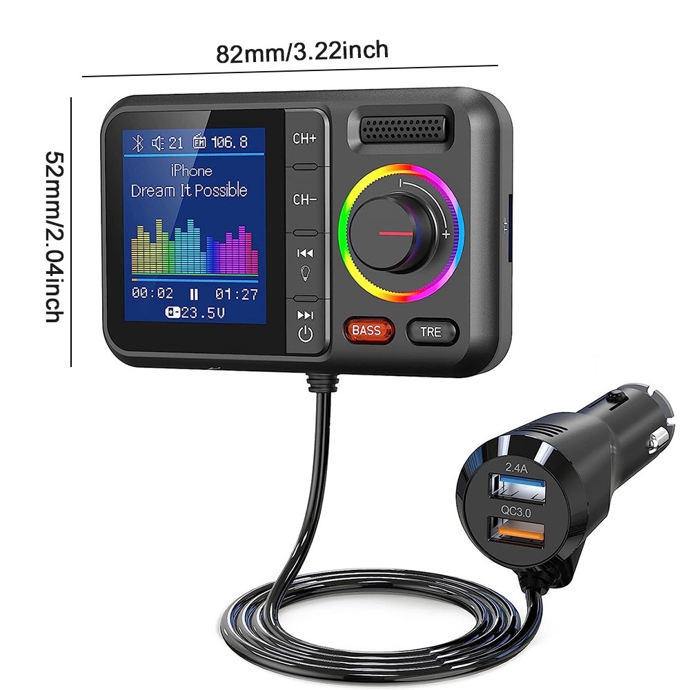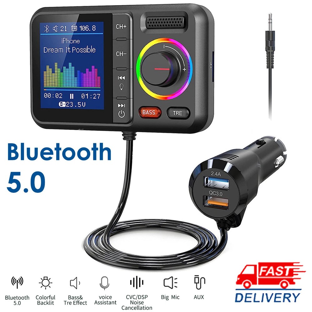 Product Description Description: Colorful LCD Screen: This Bluetooth adapter is equipped with large LCD screen, providing more information than other products. Display details include Bluetooth name, FM channels, connected device name, car voltage, music title, music count, volume, incoming phone numbers and play status. The 360° flexible design ensures a comfortable visual experience and easy access for hands-free calling. Hands-Free Calling & Bluetooth 5.0: With the latest CVC noise cancellation and Digital Signal Processor (DSP) technologies, the built-in microphone picks up your voice from all directions. The Bluetooth 5.0 chip ensures a faster and more stable connection, making it easier to stream music and make hands-free calls. It also reconnects automatically to the last paired device for convenience. Dual USB Ports & QC3.0 Fast Charging: The bluetooth FM transmitter features dual USB ports (QC3.0+2.4A), allowing you to charge two devices simultaneously with QC3.0 technology for fast charging—up to 4x faster than standard chargers. It also includes TF card and AUX ports, giving you multiple ways to play music via USB drive, TF card, AUX or Bluetooth. Note: TF card not included. Activate Siri & Hands-Free Use: Easily stay focused on the road by activating Siri or Google Assistant for hands-free calling, messaging and navigation. The large button allows you to answer, redial, hang up or reject calls with a simple press. It also supports voice notifications from navigation apps, making it even easier to stay safe and connected while driving. Enhanced Treble & Bass Control: Experience Hi-Fi sound with the FM transmitter, featuring independent treble and bass control for a personalized audio experience. Adjust the sound to your preference and enjoy audiophile-grade quality with an auto-syncing colorful music spectrum that creates the perfect party atmosphere. Specifications: Name: Car Bluetooth Player Material: ABS Color: Black Size: 82×52mm/3.22×2.04inch Bluetooth Version: 5.0 Bluetooth Distance: >7M FM Transmission Frequency: 87.5-108.0MHz FM Transmission Distance: <3M Package Includeds: 1×Bluetooth Adapter 1×3.5mm Audio Cable 1×User Manual Note: 1. Please allow 0~1 inch error due to manual measurement. Thanks for your understanding. 2. Monitors are not calibrated same, item color displayed in photos may be showing slightly different from the real object. Please take the real one as standard. Payment Shipping Returns Contact Us 1. This is the payment method we can accept: Paypal 2. You can checkout and pay immediately after the auction ends or you complete the purchases. If you need an eBay invoice sent to you by Email, please contact us before making payments. 3. Once the checkout is completed, you will not be able to include any additional purchases. We start to process and fulfill your order once payment is received. New purchases after the checkout will be processed separately. 4. Payments are expected within 4 days after the order is confirmed. Unpaid item (UPI) strike may be filed with eBay upon non-receipt of payment. 1. How much is the shipping & handling (S&H)? Our shipping and handling charges are clearly stated in the Shipping and Payments section of the item page, and we provide Free Shipping for most items. 2. For multiple purchases, the combine shipping discount will be automatically calculated when you check out and pay all of your purchases together. Items checked out separately may not be combined and the combine shipping discount will not be offered automatically. 3. Please make sure the correct Ship-To address is entered before checking out. Once the payment is completed, you may not be able to change the shipping address. We shall not be held responsible for any wrong or undeliverable addresses. 4. We usually ship within 1-2 business days of receiving cleared payment. 1. We put buyer's satisfaction at top priority. If you're not pleased with your purchases, we'll be happy to make an exchange or refund the item total price less Shipping and Handling (S&H) charges within 30 days of your purchases. 2. For any Exchange, Refund or Return, the item must be in its original condition, including the box, packaging, and all the accessories or gifts. 3. We'll provide prepaid return shipping label if the return is a result of our error. Postage reimbursement is offered only on standard mails, and it needs to be approved by our staff prior to returning. 4. Please allow up to 7 business days for returns to be processed. 5. Shipping and Handling (S&H) charges are not refundable. 1. Customer satisfaction is very important to us and our feedback rating reflects this satisfaction. If you have any question or concern, please contact us via eBay message. 2. We respond to all eBay messages as quickly as possible. Though your question will usually be answered very soon, please allow us up to one business day before you start thinking your message is neglected or the reply is avoided, because there would be time difference, non-working hours or public holidays that have prevented us from making an instant response. Payment 1. This is the payment method we can accept: Paypal 2. You can checkout and pay immediately after the auction ends or you complete the purchases. If you need an eBay invoice sent to you by Email, please contact us before making payments. 3. Once the checkout is completed, you will not be able to include any additional purchases. We start to process and fulfill your order once payment is received. New purchases after the checkout will be processed separately. 4. Payments are expected within 4 days after the order is confirmed. Unpaid item (UPI) strike may be filed with eBay upon non-receipt of payment. Shipping 1. How much is the shipping & handling (S&H)? Our shipping and handling charges are clearly stated in the Shipping and Payments section of the item page, and we provide Free Shipping for most items. 2. For multiple purchases, the combine shipping discou