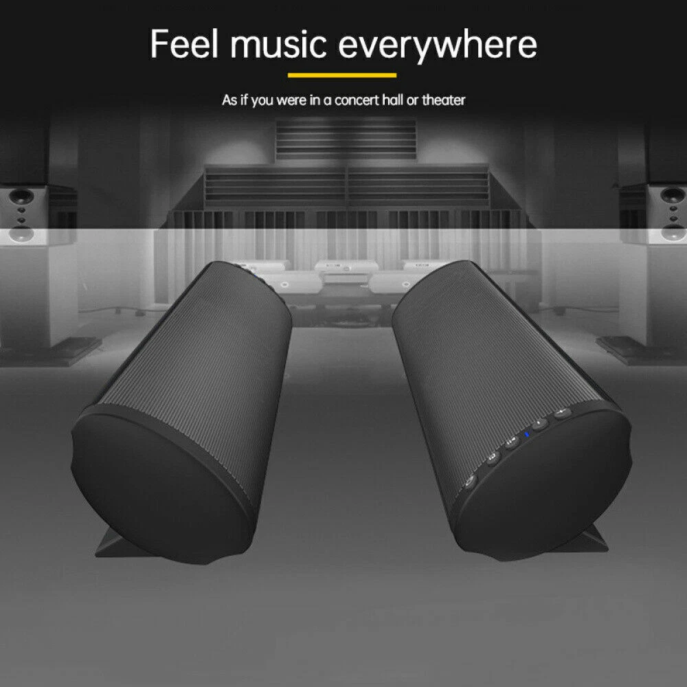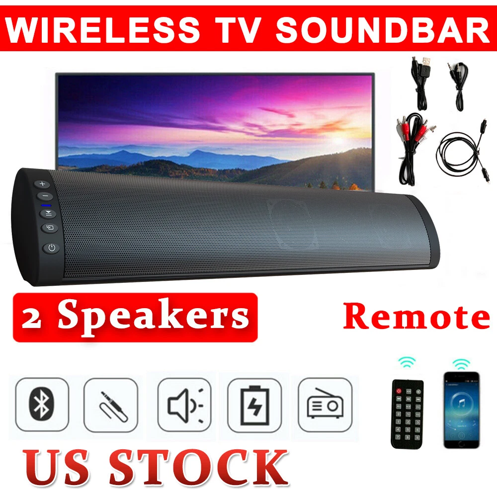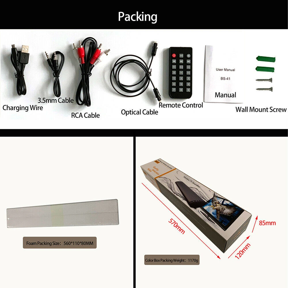 Bluetooth 5.0 Sound Bar Wireless Home Theater Subwoofer Wall Mount Soundbar Description: 🌐Full frequency range, 3D stereo, high-definition dual speakers, wireless Bluetooth function, surround sound, lossless sound quality decoding, FM radio, long-lasting battery life 🌐Built-in dual speakers + dynamic passive radiator, high output internal strong magnetic speaker + independent subwoofer diaphragm, perfect subwoofer effect. 🌐High-fidelity HI-FI sound quality. Through the integrated sound cavity resonance, the music scene is restored and the pure music emotion is reproduced 🌐Dual chip decoding driver. The combination of bass chip and HI=FI chip provides faster and more accurate decoding speed and more mellow bass performance 🌐360° surround sound. Feel the music everywhere, as if you are in a cabaret, theater. The combination of bass and surround sound reverberation presents an auditory feast as if you are on the scene 🌐Wireless Bluetooth transmission. Put aside the cumbersome wire constraints, connect to Bluetooth, and enjoy free wireless music. Smart compatible Bluetooth devices. Compatible with mobile phones, computers, tablets and other Bluetooth devices, easy wireless connection, and compatible with windows, Android, Apple and other operating systems 🌐Bluetooth disconnection can also be used. With a 3.5mm audio input interface, you can use the audio cable to connect when Bluetooth is turned off. It can be used as a desktop speaker for computers, PADs, notebooks, etc. 🌐With RCA interface, directly connected to TV audio playback 🌐Support U disk/TF card playback, support multimedia functions such as previous/next song, song cut, etc. 🌐FM radio function Specification: Bluetooth: Bluetooth version: V5.0 Bluetooth chip: AC6926A Transmission power: 4dBm Frequency: 2402MHz-2480MHz Distance: 8-10 meters Decoding format: MP3/WAV/WMA/FLAC/APE Audio: Speaker device: internal magnetic horn Rated power: 10W*2 Frequency response: 20HZ-20KHZ Signal to noise ratio: -80db Rated impedance: 4Ω Total harmonic distortion: 1% Battery: Battery type: 18650 aluminum polymer battery Battery capacity: 2000mA Rated voltage: 7.4V Protection circuit reference: overcharge protection (8.40±0.05) V/over discharge protection (5.0±0.1) V Charging mode: DC 5V 1A charging time: about 4H Play time: Use time at middle volume (speaker loudest, mobile phone 50% volume): about 6H Maximum volume usage time (both speakers and mobile phones are at maximum volume): about 3H Standby time: 240H Volume segment: 0-15 other: Input audio: Bluetooth/TF card/U disk/3.5mm/optical fiber/RCA Built-in radio: external antenna to close Receiving audio segment: 87.5-108 weight: 780g Size: 540*58*78.5mm Package Included: 1 x Bluetooth Soundbar Speakers 1 x Charging Cable 1 x 3.5mm Audio Cable 1 x RCA Cable 1 x Optical Audio Cable 1 x Remote Control 1 x User Manual 1 x Wall Mounting Screw Pack 【Service Guarantee】Thanks for visiting our Store! We try to accurately describe our item to the best of our knowledge, if there is any incorrect, please feel free to let us know via message. If you have any problem or concerns,we hope you can contact us via message,before you decide to leave neutral or negative feedback or open return request or case. When we see your email at work, we will reply to you as soon as possible. Payment Delivery details Terms of sales About us Contact us Payment 1.We only accept PayPal as payment method. 2.The item will be shipped to buyer’s CORRECT and VERIFIED Ebay Address. 3.We are not responsible for the package lost due to incorrect address. 4.Our price do not including any custom or duty, VAT and local tax. 5.Payment must be received within 7 days of winning the auction 6.Please contact us if you need file an extension for any late payment. Delivery details 1.All item are shipped via DHL eCommerce or USPS Frist Class express Service within 2 business days once full payment is settled.If you can't get your items in time,please contact to us first,we will check and solve it for you soon.We will reply your mail within 24 hours normally. Sometimes have a little delay due to the weekend or holiday.If you can't get our mail after 48 hours,please check your spam or contact to us with other mail address or via ebay. 2.We only ship to confirmed Ebay addresses. Your Ebay address MUST MATCH your Shipping address. 3.If you want to change the address please E-mail us right after you pay for the item. 4.SERVICE TRANSIT TIME is provided by the carrier and excludes weekends and holidays. Transit times may vary, particularly during the holiday season. 5.If you have not received your shipment within 30 days from payment, please contact us. We will track the shipment and get back to you as soon as possible with a reply. Our goal is customer satisfaction! Terms of sales 1.Please contact us via eBay Message if you have NOT received item in 30 days , we will check it with post office, and then resend or refund any missing item. 2.i n the unlikely event that your product is faulty in anyway, you must contact us ASAP and then return it within 7 Days of receipt. 3.Return shipping fee should be paid by buyer if wrong item you bought (wrong model or wrong color) and item is defective. We will provide replacement or refund after we received and confirmation. 4.if you need return, please contact and get an address for return from us, then declare your package as “Return”, write your Ebay ID and item number outside About us 1. Dear buyers, we appreciate your business, if you are satisfied with our service, 2. Please leave us a positive feedback and rate the details of the transaction (Detailed Seller Ratings) with a "PERFECT 5 Star. 3. Your recognition will make us more confident to develop business and serve you better. 4. Our goal is to make sure you are a happy buyer and pleasant shopping with us. Please email us before leaving any 1 or 2 ratings, negative feedback or open any dispute. We understand the conce