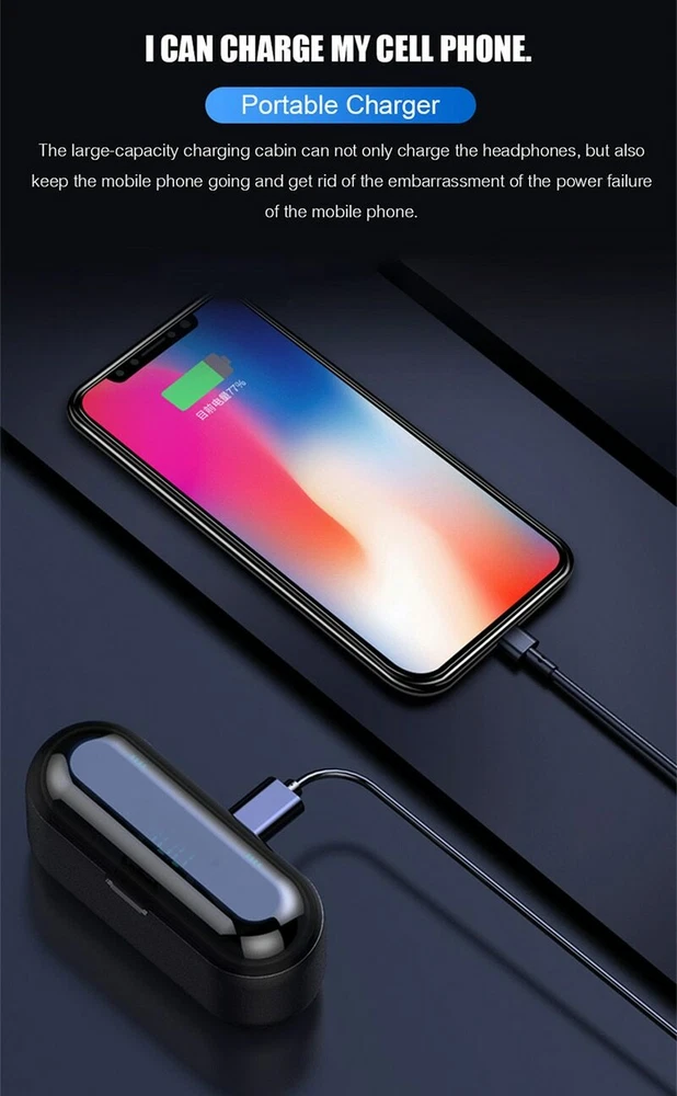 F9 Earphones Bluetooth Headphones Wireless Earpiece Running Headset With Charging Case Power Bank Waterproof Earbuds For Samsung Product Features: 1.2000mAh charging case can full charge 2 earphones around 10 times, offer more music time. 2.Bluetooth V5.0, support most of bluetooth devices and lower power consumption 3.With waterproof technology, no need to worry about water and sweat anymore 4.Popular one button control function, support switch songs, phone call and call voice assiatant. 5.8mms dual drive units, enjoy 9D strong deep bass music sound Package Lists: 2* Bluetooth Earphones 1* Charging Case 1* USB Cable 1* User Manual