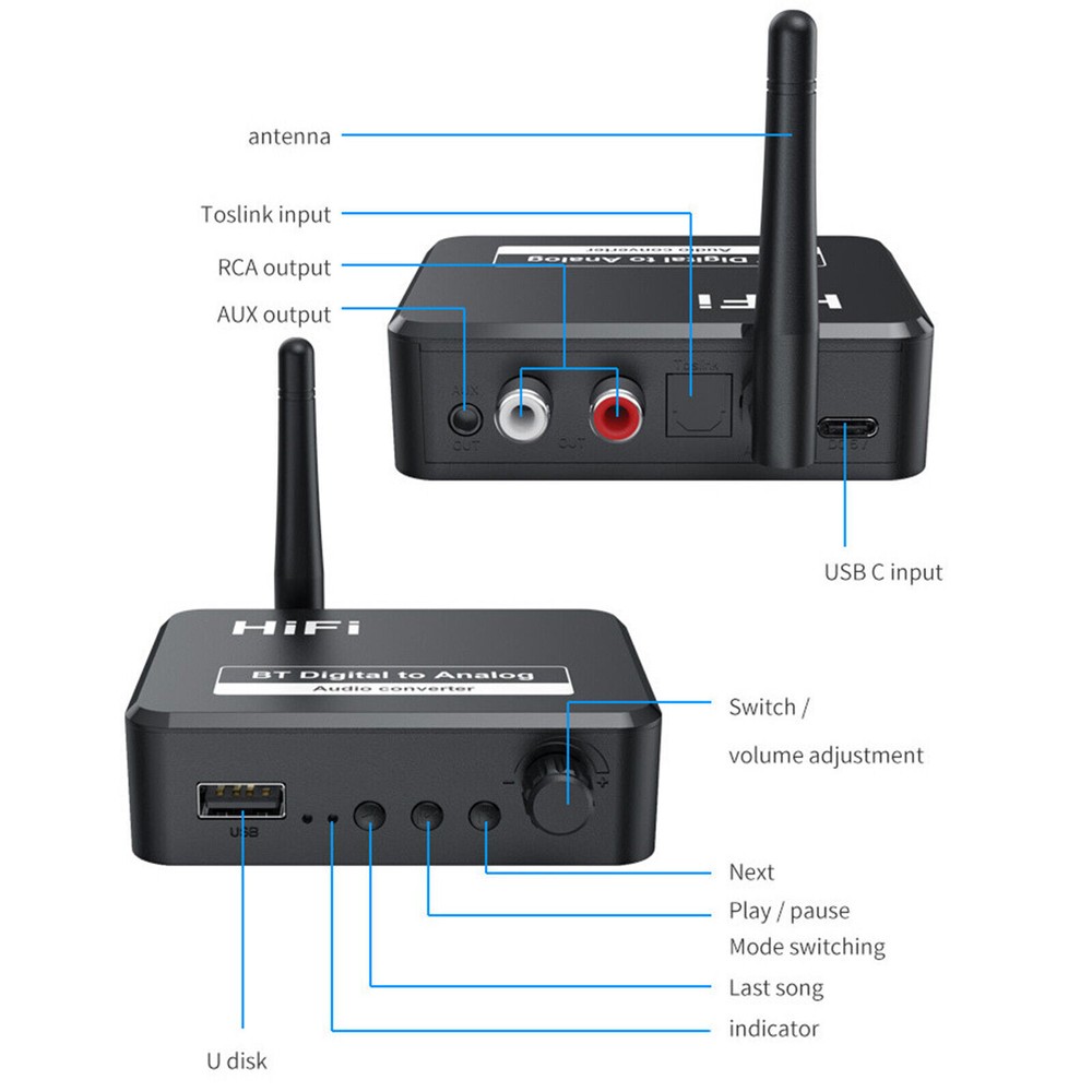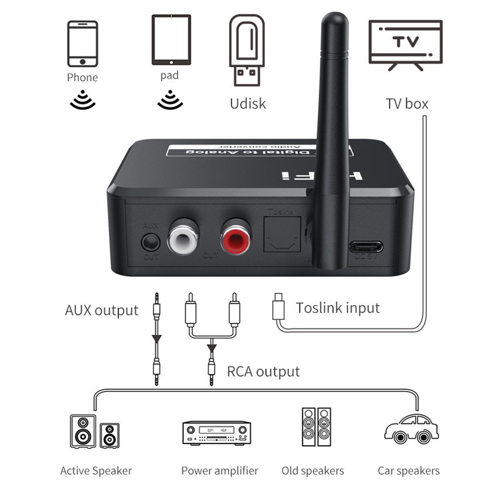 Features: 1. Convert toslink digital audio signal to 2RCA analog L/R and 3.5mm AUX audio 2. Can be connected to external devices such as amplifiers via standard RCA/3.5mm auxiliary jacks 3. Supports sampling rates of 32, 44.1, 48 and 96khz 4. 24-bit spdif input bitstream for left and right channels 5. Provide no electromagnetic noise transmission 6. Easy installation and simple operation 7. Small size and light weight 8. Toslink digital optical signal to analog audio converter is specially designed for home or professional audio switch 9. Convert toslink digital audio signals to 2RCA analog L/R and 3.5mm AUX audio, which can be connected to external devices such as amplifiers via standard RCA style jacks 10. The converter is small in size and easy to install. 11. Updated with Bluetooth audio reception function. 12. Super stable connection: Our bluetooth audio adapter is equipped with a bluetooth 5.1 chip for continuous pairing, fast transfer and wide signal range (33 feet). With 3.5mm aux port and 2 RCA ports, it can connect non-Bluetooth car audio system, home audio, wired headphones/speakers, amplifier/home theater, etc. Then you can enjoy wireless high-fidelity music streaming! Note: It's just a Vikefon bluetooth receiver, not a transmitter. So you can't use it for your TV, keyboard, mouse. Note: 1. There is no built-in battery, so use via USB power! ! ! 2. TF/SD card not included! ! ! Packing list: 1*Bluetooth receiver 1*USB cable 1*Fiber Optic Cable 1*3.5mm audio cable 1*RCA cable Warranty: We strive for 100% customer satisfaction! If you have any questions, please feel free to contact us via eBay message, we will reply you as soon as possible ,for timedifference may a little delay ,hope understand and a little more patience ,thanks ! Feedback: Positive feedback is important to you and me. If you are satisfied with our service and product, hope give us a positive feedback with 5star,also we will do that for you :) If not, please contact us First, we will give you a satisfactory answer.