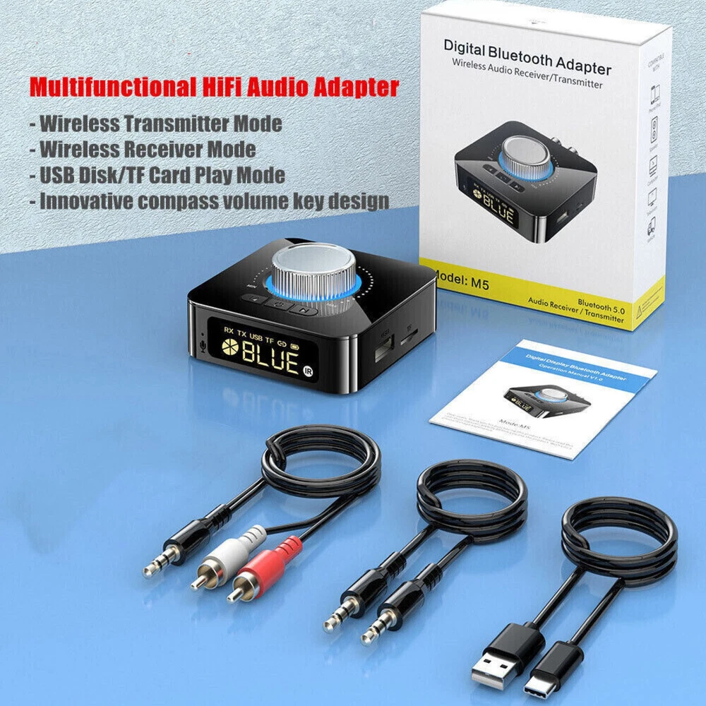 Product Description Features: Exquisite appearance and portable size. Adopting Bluetooth 5.0 chip design with stronger compatibility and stability. 2 in 1 Bluetooth receiving (RX) and Bluetooth transmitting (TX) functions. Innovative compass volume key design, 360-degree adjustable, more convenient rotating operation, easy to answer calls, play songs, pause, etc. Equipped with high-definition LED digital display screen, the working status and Bluetooth mode are clearly visible. Lossless music, HiFi high-definition decoding output, no lag delay, clear sound quality, restore sound details, just like a music scene. Built-in digital to analog chip, support AUX, RCA, USB, TF interface. Cool breathing light, red/blue color, soft and not dazzling. Built-in 400mAh rechargeable lithium battery, long battery life. Support USB (U disk), TF card playback and transmit. Built-in high-definition microphone, support wireless listening to songs, hands-free calling, and GPS navigation. The product connection is simple, without installing any cumbersome USB drivers and downloading APP; Broad Compatibility: With the included 3.5mm and RCA cables, the multifunctional Receiver Transmitter adapter can widely be used on your computer, laptop, home stereo system, headphone, smartphone, Mp3 player, CD player, car stereo etc. Specifications: Bluetooth version: Bluetooth V5.0 Supported protocols: RX: A2DP AVRC TX: A2DP Working frequency band: 2.402GHz -2.480GHz Power class: Power class 2 (Class II) Sensitivity: -85dBm<0.1%BER Signal-to-noise ratio: ≥90dB Distortion: ≤0.1% Interface type: Input: 3.5mm AUX+RCA+USB+TF; Output: 3.5mm AUX+RCA Supported formats: MP3/WAV/WMA/APE/FLAC/G729/M4A/ALAC/AMR/DTS/MIDI/G726/MTY Screen size: 33*14*4MM Working current: <40mA Built-in battery: 3.7V/400mAh Charging current: about 500mA Charging time: about 1 hour Battery life: RX about 6-8H, TX about 8H Bluetooth distance: ≤10M (open place) Charging method: Type-C 5V/0.5A Compatible Devices: for Android, for IOS system mobile phones and PAD, active speakers, power amplifiers and Bluetooth speakers or headphones that support A2DP/protocol connection. Working Modes: 1. Transmitter mode: wirelessly streams audio from your non-Bluetooth TV, home stereo system, or CD player to your Bluetooth enabled headphones or speakers. 2. Receiver mode: wirelessly streams audio from your Bluetooth-enabled phones, tablets, or computer to your wired stereo/speakers/headphones/car stereo. 3. USB Disk/TF Card in receiver mode: it can wirelessly stream audio to your wired stereo/speakers/headphones/car stereo. 4. USB Disk/TF Card in transmitter mode: it can wirelessly streams audio to your wireless bluetooth enabled home stereo/ bluetooth speakers/bluetooth headphones. Package Includes: 1x Bluetooth Transmitter Receiver Adapter 1x USB-C Power Cable 1x 3.5mm Aux Cable 1x RCA Aux Cable 1x User Manual If you have any doubts or uncertainty about this item, contact us with no hesitation, we are always here and will solve your problems. Thanks and wish you a nice day! About Us We dedicated to provide excellent products and services for all customers on ebay. hope we all can have a nice experiences on eBay. Payment We accept all verified payment through PAYPAL payment. Shipping Usually, Item will be shipped within 1-2 working day after full payment is received. Normally, you will receive the item in 5-7 days. Please contact us if you don’t receive the items after 10 working days after the payment If you have any questions about shipping, please feel free to contact us. Returns Always believe we can solve problems by communication if it comes to any problems about products or any others. If it comes to a return, the products must be intact and as original when you received, and should be within 30 days after you received it. Contact Us Work time: 9:00 AM to 18:00 PM Beijing Time You can contact us at anytime you want, we will reply all messages at the first time. powered by