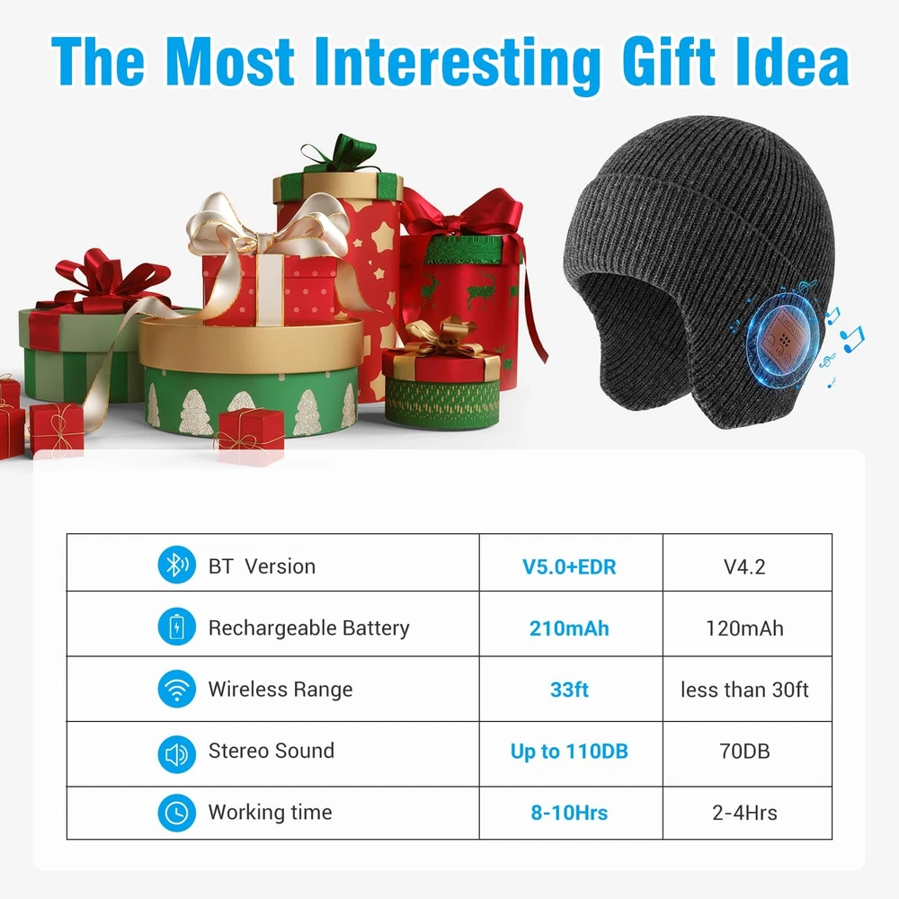 Bluetooth Beanie Hat with Headphones, Wireless Winter One Size, T-dark Grey Product Details 【Fashion, Cozy & Warm】TOUCH TWO Bluetooth Beanie provides maximum comfort and warmth in cold weather, while the innovative beanie with built-in headphones delivers an exceptional music experience. It is the perfect and stylish Bluetooth beanie for various outdoor activities during winter. 【Excellent HiFi Sound Quality】The beanie with bluetooth headphones built-in two high-quality speakers with HiFi sound quality offer up to 110Db HD stereo sound. Clear and loud sound quality without having to fear that the earphones will fall out - enjoy your playlist and take your calls anytime, anywhere! 【Upgrade Bluetooth Chip Set】Our Bluetooth beanie with Bluetooth V5.4 technology offer the most stable and strongest connection with any Bluetooth-enabled devices and automatically connect to your last paired device. 33 feet wireless range, easy and fast to pair with your smartphone or tablet. Also 3-button easy control on music, calls, activate siri. 【Longest Working Time】Built-in rechargeable Li-Ion battery, charging time is 1.5-2 hours, can provide longest continuous working time up to 8 hours for wireless music or 10 hours of hand-free call, perfect for camping, hiking, running, cycling. (Type-C charging cable included) 【Great Value Gifts & Washable】This Bluetooth beanie for men women and teens is the top birthday, thanksgiving gifts or stocking stuffers. Keeping you warm in style-there are no tangled cords to get in your way! Also, the music hat is fully washable after taking out the headphone.