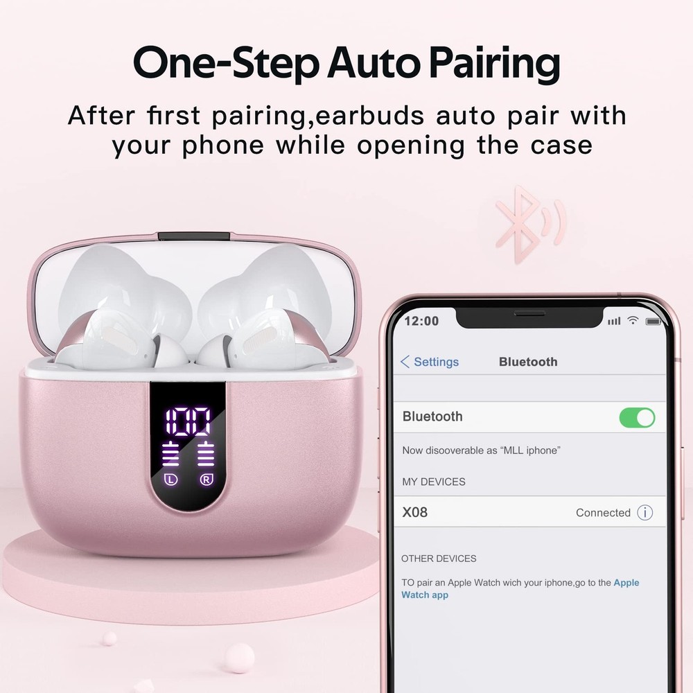 Product Parameters: Bluetooth Version: BT5.0 Speaker Size: 13mm Charging Port: Type-C /Wireless Charging bluetooth Connection Range: 33 feet Battery Capacity: Earbud: 35mAh, Charging case: 470mAh Charging Time: 1Hrs for charging case , 1.2Hrs for earbuds Playback Time: Up to 60 hours Battery Life: Each earbud can last 5 Hrs on single fully charge . the Charging case can provide 6 times full charging Operations details: Answer/End a call: Double tap on either earbud Reject call: Long tap on either earbud for 2s Pause/Play music:Tap once on either earbud Previous track: Double tap on left earbud Next track: Double tap on right earbud Volume +: Long tap on right earbud Volume -: Long tap on left earbud Voice assistant: Quick triple tap on right or left earbud Packaging Items : Wireless earbuds (L/R)x1 Pair Charging Case x1 USB-C Cable x1 Eartips x3 (S/M/L) User Manual x1 LED Power Display and 60H Playback: Dual digital LED power display outside of the case is to show the power level for charging case and earbuds. When charging for the case, the LED light will start to flash from 1 to 100. When you put earbuds into the case, then earbuds will start to be charged. 470mAh battery capacity charging case can provide extra 4 times full charging for both earbuds, each earbud can last 6H on single charging. So, you can enjoy 60H music time in total via using in turn Wireless Charging and IPX5 Waterproof: The charging case of these bluetooth earbuds support wireless charging and USB C cable charging. These wireless headphones are rating at IPX5 waterproof, the nano-coating on earbuds surface can prevent water and sweat from penetrating, which can use as sport wireless headsets. You can listen to the music while running, working, reading, sleeping, meeting, etc One-Step Pairing and Easy Touch Control: X08 bluetooth earphones adopts hall switch. After first connection, these wireless earphones will connect with your device once you open the charging case, which is faster and more convenient. During using, you can touch either earbud to control the phone, such as the music switch, volume adjustment, phone calls, voice assistant, etc. No need to adjust through your mobile phones Ergonomic Design and Lightweight: X08 headphones' structure is the study of thousands of people's ear canal before design. Comes with three different sizes of ear tips, our X08 are fit for most people's ear cannals. These wireless bluetooth headphones are small and light, single earbud is only 0.14oz, earbud size is 1.57*0.78*0.59in, charging case size is 2.56*2.16*1in, It’s more convenient to carry Superior Clear Call and Immersive Stereo Sound: These music earphones with 13mm speakers and triple-layer composite diaphragms provide powerful bass, stunning treble and clear mids. These earbuds are designed for sound and music lovers. It can support the mono mode and twin stereo mode, you can share the earbuds with your friends and families. Each earbud has a build-in microphone for phone calls. CVC noise reduction can make others hear your voice very clearly while phone calls