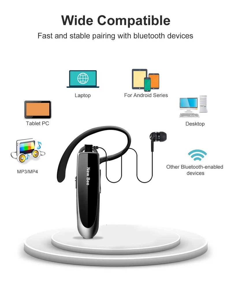 New bee [2 Pack] Bluetooth Earpiece Wireless Handsfree Headset V5.0 24 Hrs Driving Headset with Mic 60 Days Standby Time Headset Case for iPhone Android Samsung Laptop Truck Driver Brand New bee Color Black Ear Placement In Ear Form Factor In Ear Noise Control Active Noise Cancellation About this item [CVC 6.0 Handsfree Talking] 2 Pack New bee hands-free headsets employs CVC 6.0 technology. The sound whilst on a call will be clear, both for you and the other end. [Long Lasting Battery Life] Only 2-3h charge time, 22h music time, 24h talk time, 60 days standby. The wireless headset takes little time to charge but can last for all days. Meets the need for daily use. [Comfortable Wearing Design] Lightweight New Bee B41 bluetooth headset (12g) does not cause any burden to your ears, thus providing lasting wearing comfort, good for drivers or businessmen; 360¡ãadjustable earbud fits perfectly for your left or right ear. Three optional ear tips included; small, medium, and large, choose the most comfortable earbuds to fit in either ear. [Wide Compatible] Compatible with Bluetooth-enabled devices. Designed for iPhone series, Samsung, HTC, LG, SONY, PC, Laptop, etc., iPad, iPod touch, LG G2, Samsung S7 S6, LG, Motorola, LG, SONY, and other Android cell phones, PC, Laptop, etc. [Easy to Carry and Use] Included case helps you keep the headset secure and no worry to lose it. An extra wired earphone is there in case you want to enjoy music with both ears. (Item does not ship to Miami&Doral, FL), have any problem please contact us !