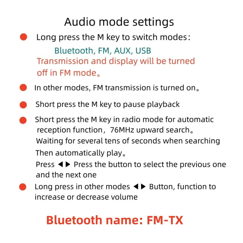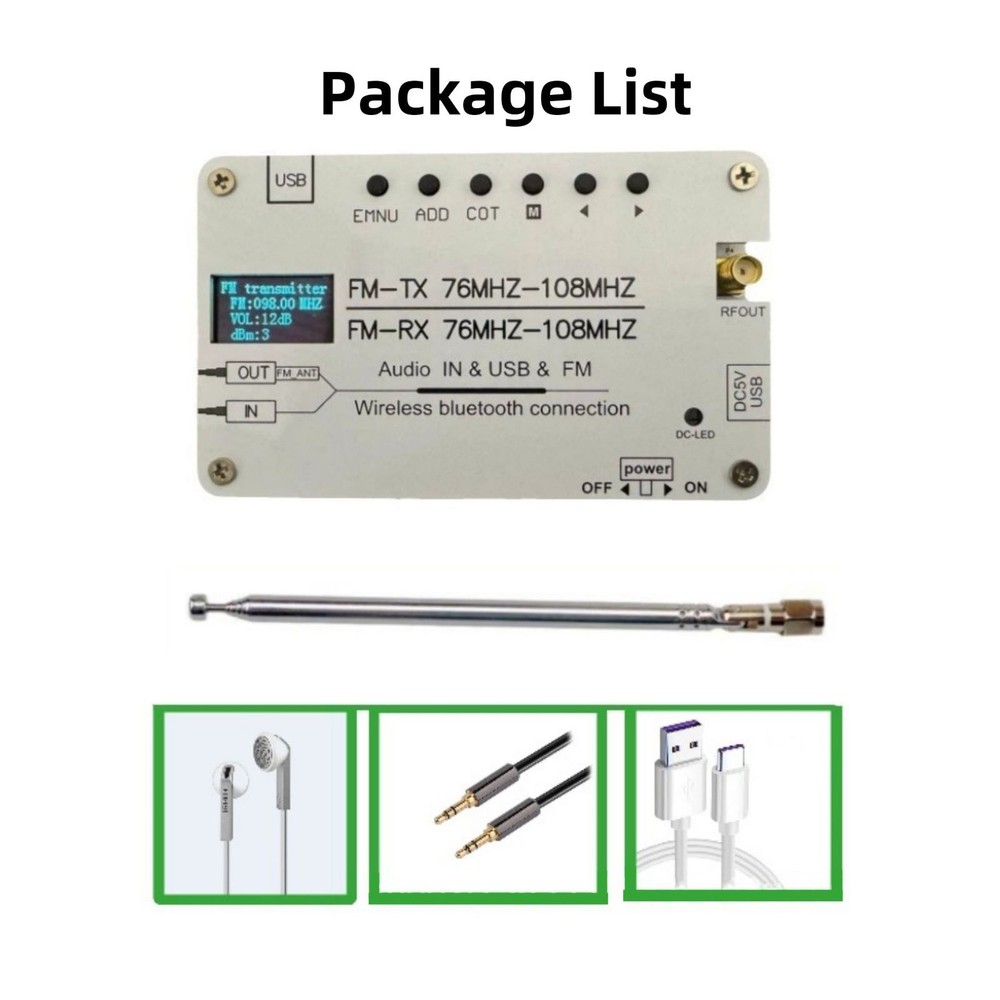SAFE & SECURE SHOPPING 100% SATISFACTION GUARANTEED FAST SHIPPING Store Categories Store Categories Other DJI & RC Parts Game & Arcades Parts Watch Tools & Parts Auto Parts Headphone Parts Musical Parts Health & Beauty Home & Garden Toys Electronics B & I Military Models Office Suplies Outdoor & Sport You may also like You may also like High Accuracy Quartz Chronograph Watch Wrist Movement VK63A For VK SERIES 27.59 USD 19.99 USD 28 in 1 Game Card Case Holder Cartridge Box For Nintendo DS 3DS XL LL DSi MT I 9.79 USD 19.99 USD 200pcs 0.5&0.6mm Waterproof Watch O-Ring Rubber Gasket Assortment For Watchmaker 12.99 USD 1.99 USD Power Reset On Off Button Switch For Playstation2 for PS2 Slim 70000 Series 9.19 USD 1.99 USD Bluetooth Adapter Aux Audio Cable For Alpine KCE-237B/CDE-101/INA-W900/CDA-105 12.98 USD Alloy Watch Balanced Wheel with Hairspring Replacement For NH35 NH36 Movement 13.99 USD Bluetooth FM Transmitter 200m Transmission Stereo Sound Effect AUX/USB/MP3 Product Description Features: Bluetooth Connectivity and Versatility: This FM radio transmitter supports Bluetooth connectivity with the Bluetooth name FM-TX, allowing users to easily pair their phones, tablets, or other Bluetooth devices for wireless audio transmission. Additionally, it is equipped with U-disk MP3 playback functionality, an AUX input interface, and a 3.5mm audio signal input, providing users with multiple audio input options to meet different usage needs. Portability and Long Battery Life: Powered by a lithium-ion battery, this transmitter is designed to be lightweight and portable, allowing users to enjoy music or radio anywhere and anytime. Meanwhile, the lithium-ion battery offers long battery life, ensuring extended use without the need for frequent charging, providing convenience for users' outdoor activities or home entertainment. Broad Transmission and Reception Frequency Range: With a transmission and reception frequency range covering 76MHZ-108MHZ, which is the standard FM radio band, the broad frequency range means users can freely choose channels, avoiding channel conflicts and ensuring clear and stable signal transmission. Long-Distance Transmission and Stereo Sound Effect: With a transmission distance of over 200 meters, this transmitter can cover a wider area in settings such as homes or small gatherings, ensuring that all participants can clearly hear the audio content. At the same time, it supports stereo playback, providing a richer and more immersive sound experience, allowing users to enjoy a more engaging auditory feast when listening to radio or music. Specifications: Material: PCB Size: 10*6.2*1.8cm Color: White Battery capacity: 2800mah Duration: About 8 hours Transmit frequency: 76MHZ-108MHZ Receive frequency: 76MHZ-108MHZ Charge: DC 5V (Type-C) Package Included: 1 x FM transmitter 1 x Antenna 1 x Headphone 1 x AUX cable 1 x Charging cable Shipping Returns Contact Us Payment Shipping 1. Items sent from US warehouse. 2.Receiving time = Processing time + Shipping time 3. Processing Time: Around 1-2 business Days 4. Shipping Time: 3-5 business day it may have a little delay during some holiday (such as Christmas),any problem ,please feel free to contact Returns 1. 30 days warranty from the purchased date. Please contact us via email before returning the defective item. 2.Our warranty does not extended to any product that are physically damaged or that are not under normal operating conditions as result of misuse or improper installation on the buyer/user's part. 3.Return items should include the original packaging and all accessories. buyers MUST contact us for the returning address. 4.In all cases, buyers pay shipping fees at their own cost to return products for exchange or refund. We will be responsible for the postage of replacements. Refund will be made upon receipt of the returned item. Contact Us Pls contact us if you have any problems,we will try our best to solve for you Payment We accept all verified payment from eBay. Copyright © 2022 Tongtool
