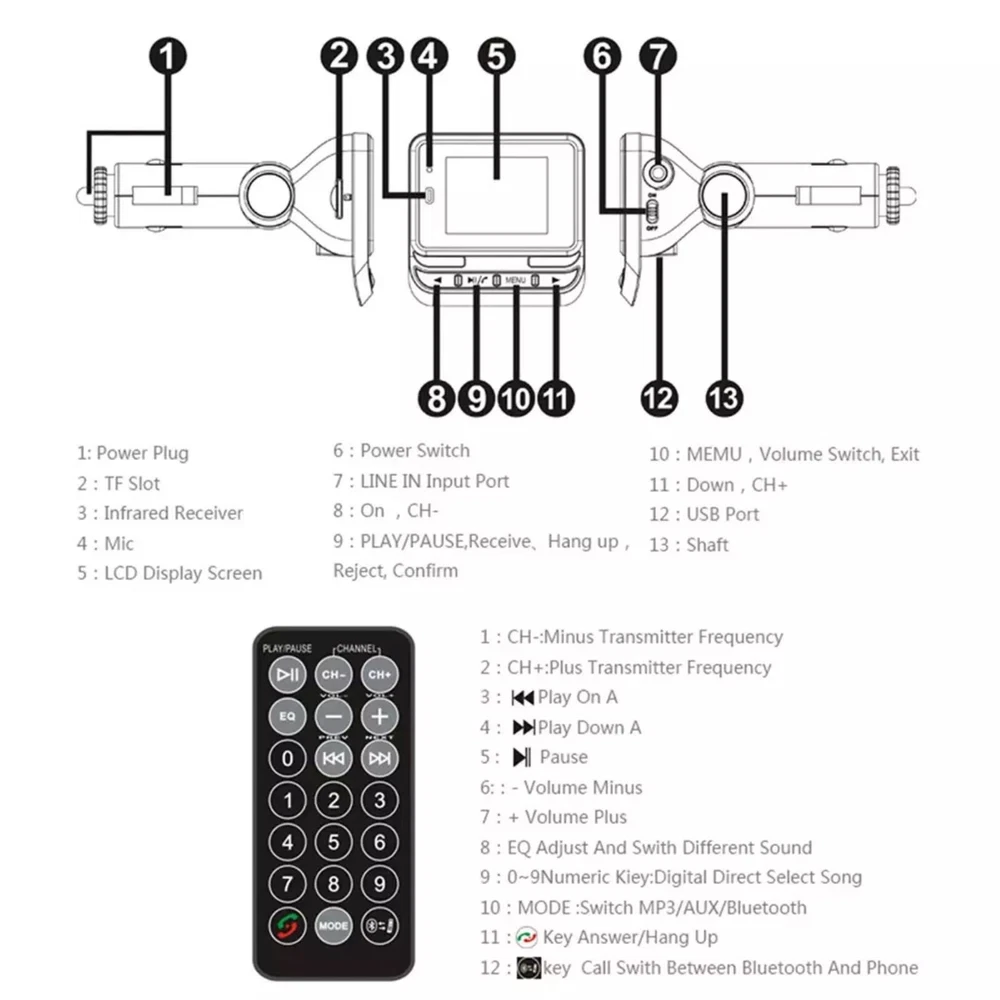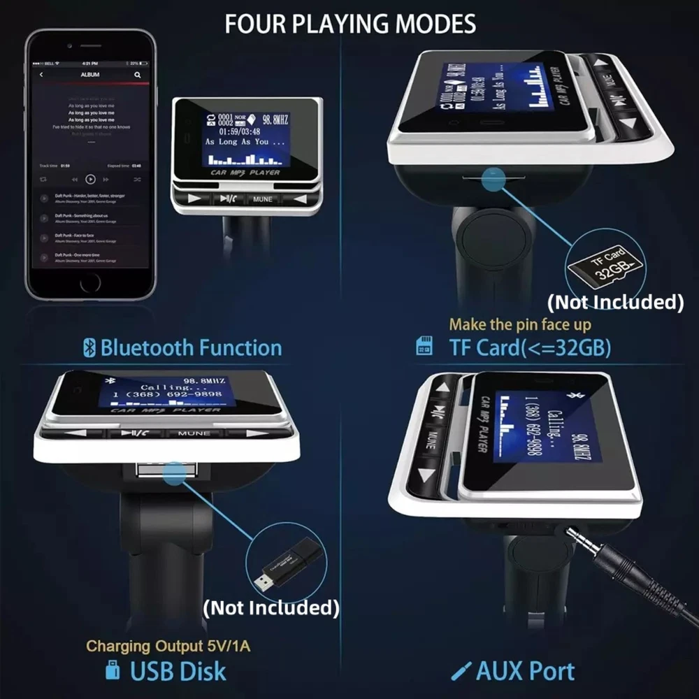 Product Description Features: High Compatibility and Flexible Adjustment: This product can be adjusted to any angle, perfectly fitting various vehicle models, ensuring the best visual and operational experience for drivers regardless of their car type. Advanced Display and Call Technology: Equipped with a 1.4-inch LCD display, it clearly shows incoming calls, playback information, and more; it also supports Bluetooth hands-free calling, utilizing CVC technology to effectively eliminate echo and noise, ensuring clear call quality. Convenient Power Management and Operation: The power toggle switch is designed for simplicity and practicality, with one click to turn the entire device on or off; it supports remote control for answering and making calls, making operation even more convenient. Rich Multimedia Entertainment Features: It supports USB charging for mobile phones and can play music stored on mobile phones through the car audio, offering a high-quality musical experience. Additionally, it supports external TF cards, USB drives, as well as CD, MP3, and other audio source inputs, catering to diverse musical needs. Stereo Bluetooth and FM Transmission Technology: Adopting stereo Bluetooth technology, it enables wireless music transmission; it also supports FM transmission, wirelessly sending music to the car's FM radio for a broader playback range. Smart Memory and Power Supply Design: Featuring automatic power-off memory functionality, it effectively protects device data; it draws power directly from the car's cigarette lighter socket, requiring no additional wiring, ensuring both safety and convenience. Additionally, it supports wav, MP3/WMA, and other music formats, as well as synchronized Chinese and English lyric display, making music playback even more colorful and diverse. Specifications: Material: ABS Size: As picture shows Color: Black Bluetooth Version: 5.0 Bluetooth Audio Processing: With A2DP (Advance Audio Distribution Profile) Function Display: 1.4" LCD Rotation: 180-Degree Rotatable Frequency Range: 87.5-108Mhz Frequency Stability: ±10ppm Output Power: 5V 1A Rated Operating Voltage: 12V Operating Voltage: 9~26V Power Consumption: 1W Supported Playback Formats: MP3, WMA Signal-to-Noise Ratio: >60dB Distortion: <0.1% Frequency Response: 20Hz-15Khz Remote Control: 21-Key (With Battery) Transmitter Distance: 10M Effective Distance of Bluetooth Microphone: 0.5~2M How to Use? Plug the FM Transmitter into Your Car Cigarette Lighter Socket for Power. Turn Your Radio to an Unused Fm Frequency, Then Match This Fm Transmitter to the Same Frequency. Fm Channels 87.5 MHz - 108.0 MHz. Insert a Micro USB Flash Driver or Pair This Bluetooth Fm Transmitter with Your Digital Device to Enjoy Music Playback or Hands-free Conversation. Package Included: 1 x Bluetooth FM Transmitter 1 x Remote Control 1 x 3.5 mm Audio Cable 1 x Fuse 1 x Manual Shipping Returns Contact Us Payment 1. Items sent from US warehouse. 2. Receiving time = Processing time + Shipping time. 3. Processing Time: Around 1-2 business Days. 4. Shipping Time: 3-5 business day. It may have a little delay during some holiday (such as Christmas), any problem, please feel free to contact. Always believe we can figure things out with communication, if it comes to return, the pacakge must be intact and the same as you receive. If you have any questions, please feel free to email our service specialists 24 Hours a Day, 7 Days a Week. We will reply you ASAP. Return/refund is accepted within 30 days after the buyer receives the item. NO exchange will be accepted after 30 days from the date when the item is received. Please contact us first before returning your product!!! If you have any questions, our Customer Service staffs welcome you to email us. We strive to answer all questions and resolve any problems as quickly as possible. We care about our valued customers, and will always try to help you. So if you have any problems, You can contact us 7*24, we will reply at the first time. We accept all verified payments from ebay. Orders will be shipped after receiving cleared payment. Shipping 1. Items sent from US warehouse. 2. Receiving time = Processing time + Shipping time. 3. Processing Time: Around 1-2 business Days. 4. Shipping Time: 3-5 business day. It may have a little delay during some holiday (such as Christmas), any problem, please feel free to contact. Returns Always believe we can figure things out with communication, if it comes to return, the pacakge must be intact and the same as you receive. If you have any questions, please feel free to email our service specialists 24 Hours a Day, 7 Days a Week. We will reply you ASAP. Return/refund is accepted within 30 days after the buyer receives the item. NO exchange will be accepted after 30 days from the date when the item is received. Please contact us first before returning your product!!! Contact Us If you have any questions, our Customer Service staffs welcome you to email us. We strive to answer all questions and resolve any problems as quickly as possible. We care about our valued customers, and will always try to help you. So if you have any problems, You can contact us 7*24, we will reply at the first time. Payment We accept all verified payments from ebay. Orders will be shipped after receiving cleared payment. RH770 144/430MHz Dual Band SMA-Male BNC Telescopic Antenna For Kenwood Part 10.99 USD 19.99 USD 41mm Steel Sapphire Glass Watch Case Replacement For NH35/NH36/4R/7S Movement mm 37.99 USD 19.99 USD Cable Audio Cord Line 3.5mm Jack for HyperX- Cloud/Cloud Alpha Gaming Headset 14.69 USD 19.99 USD Mini ST-838 Power Amplifier 400W 12V 2.1Channel Powerful Stereo Audio HiFi Home 23.99 USD 19.99 USD Silver 20mm Width Watch Band Strap Bracelet Link Solid Watchband Replacement ss 16.69 USD Carburetor Carb Rebuild Kit for Honda GX160 GX200 5.5HP 6.5HP 16010-ZE1-812 i 11.99 USD 19.99 USD LCD Display Screen Replace Parts For Creality Ender 3 / Ender 3 Pro 3D Printer 23.99 U