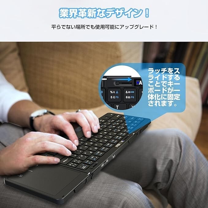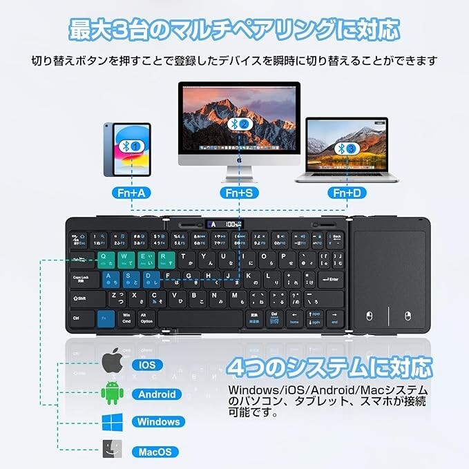 Ewin Keyboard Bluetooth Foldable Wireless Japanese Layout 3 Device Switching New Free Expedited Can switch between 3 devices, compatible with iPad/iPhone, iOS/Windows/Android/Mac/Google, etc., with touchpad, LED battery level indicator, full keyboard, wireless, slim, portable, compact, aluminum alloy, JIS layout, USB-C rechargeable, case included Supported devices: PC, tablet, iOS/Windows/Android/Mac/Google, laptop, smartphone Connection technology: Bluetooth [Industry first! Integrated design] When using the keyboard, simply slide the latch to quickly integrate and securely fix it. Even if you place it in an unstable place, you can operate it without any problems. The full-size key arrangement provides the same operation feeling as a desktop keyboard. 🏆 [LED battery display] The keyboard has an LED indicator, so you can check the connection status and battery level at a glance, and you won't miss the timing of charging. 🏆 [Supports 4 systems & switching between 3 Bluetooth devices] The key arrangement can be switched between Windows / Android / macOS arrangement and iOS arrangement with a button. You can enter the keys as printed on the keyboard on any OS, so you can use it without stress. Supports multi-pairing that allows you to easily switch between 3 Bluetooth-connected devices, greatly improving work efficiency. Even beginners can use it with confidence. 🏆 [Made of high-quality aluminum] The main body of the keyboard is made of durable aluminum material, combining a luxurious design with long-lasting quality. The stylish and luxurious appearance makes a good impression in work and private scenes. 🏆【Type-C rechargeable】Uses low power consumption Bluetooth 5.1, allowing for approximately 70 hours of continuous use. The standby time is approximately 90 days. You can use it with confidence even when you are out and about. 🏆【Energy-saving design】Automatically enters sleep mode when not in use to save battery. 🏆【Multifunctional protective case】Comes with a multifunctional case that not only protects the keyboard but also functions as a stand. 🏆【Comfortable typing】The key layout and feel provide comfortable typing, and the Bluetooth connection is stable, allowing you to work smoothly without delay. 🏆【Quiet design】The quiet design of the keyboard allows you to type comfortably without worrying about your surroundings. It is especially ideal for use in quiet environments.
