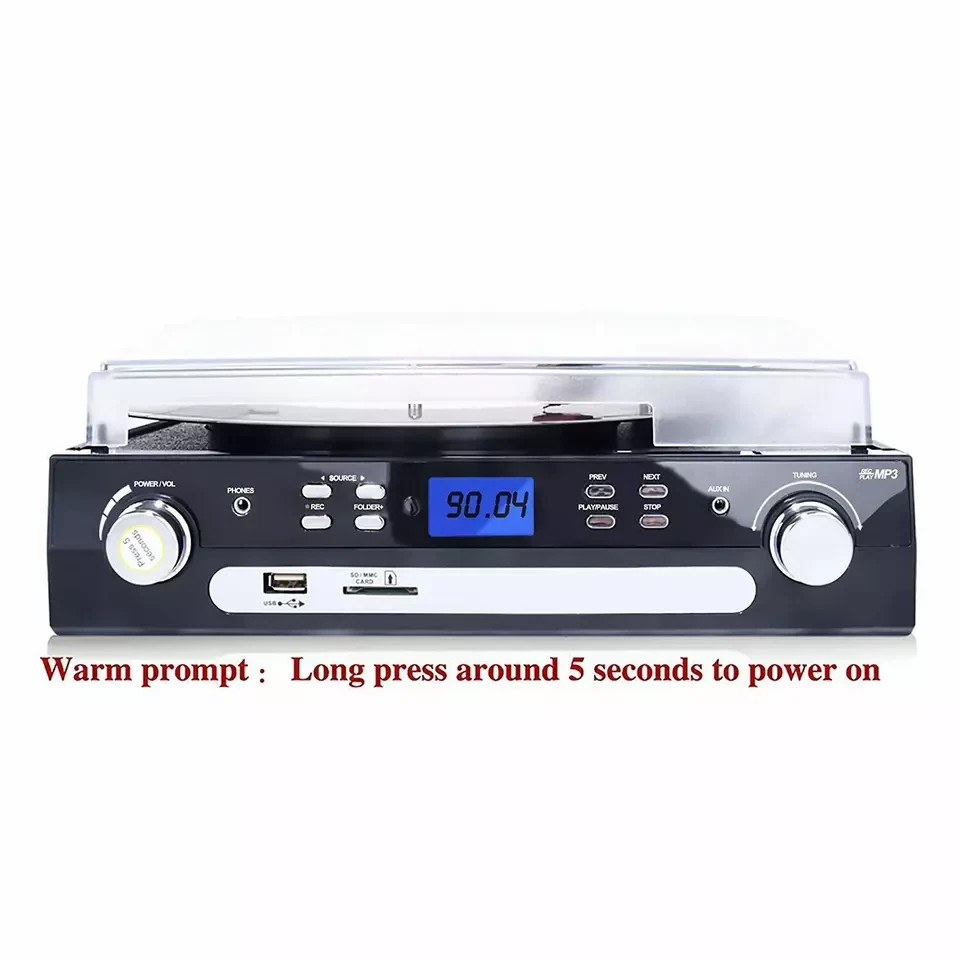 Bluetooth Connection - Turntable with Bluetooth function. Playing music from external device wireless, such as moblie phone, laptop and other bluetooth device USB/SD Encoding - Converts vinyl to USB flash drive/SD card directly in MP3 format. No PC or laptop required Traditional Music Playing - Cassette Player with eject and fast forward function. Aux in for connecting of other devices(CD,Ipod,Iphone etc) Three-Speed Record Player - Belt-driven turntable fits for vinyl records at different speeds. 33 , 45, 78 RPM selectable. (Please note:Long press around 5 seconds to power on) More Fuction - Built-in stereo speakers. Analog AM/FM stereo radio, LCD Screen with backlight, Earphone jack. With Dust Cover and 45RPM Adaptor