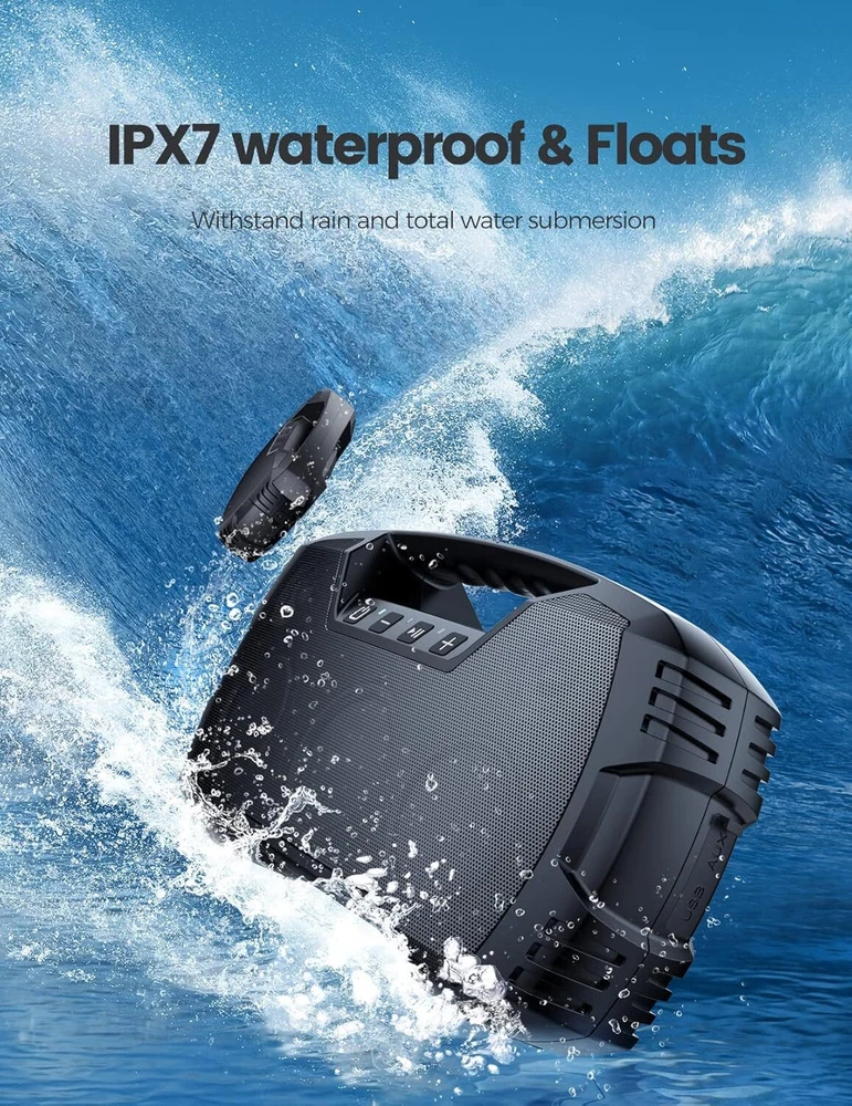 IPX7 Waterproof Bluetooth Speaker, 40W(60 Peak) Portable Wireless Speaker with Subwoofer, 32H Playtime, Stereo Loud Sound, Deep Bass, Bluetooth 5.0 Outdoor Speakers Powerful Stereo Speaker - Featuring 4 dedicated drivers with 2 15W full-range drivers and 2 5W tweeters, along with 2 passive radiators on the front and rear, this loud Bluetooth speaker delivers 40W surround sound (peak 60W) and pumps out well-balanced midrange, crisp treble, and punchy bass with virtually no distortion, letting you enjoy the music to the utmost. Pair 2 speakers together for 80 watt stereo sound Epic 32-Hour Playtime- Houl Zallee outdoor Bluetooth speaker delivers up to 32 hours of playtime on a single charge (Actual playtime may vary by the music content and sound volume). Enjoy loud sound with powerful bass and clear vocals at home, in the garage, or outside on the road. Its built-in large-capacity rechargeable batteries can charge phones or other devices, making it a great camping gift IPX7 Waterproof Speakers - The Houl Zallee outdoor speaker is rugged enough for outdoor adventures and rigorously tested to meet IPX7 waterproof standards. It's fully water proof and can even float on water and survive being fully submerged in 3.3 feet of water for up to 30 minutes. So there is no need to worry when using it by the sea, the pool, on a boat, or in a shower room.The idea for outdoor adventures Bluetooth 5.0 Wireless Speaker: Built with the newest Bluetooth 5.0 chip with EDR technology, this wireless Bluetooth speaker ensures a faster and more stable connection than Bluetooth 4.0. Houl Zallee bass Bluetooth speaker livening up your tailgate party, birthday party, pool/beach party, backyard barbecues, or camping/hiking trips made easier Durable Portable Speaker with Handle: Crafted from ultra-durable ABS and metal, this portable outdoor speaker is very durable and impact-resistant. With a built-in handle, it's so convenient to carry the speaker anywhere for outdoor sports or other activities, bringing big fun with us. This big speaker is a great choice as a gift for men, women, teenagers, and seniors everyone who loves music