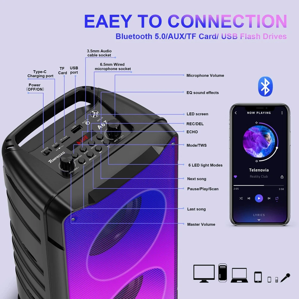 A67 Bluetooth Speaker is a Powerful Party Speaker with Booming Bass, Crystal Clear Treble, and flowing flame Light Effects. 60W Rich Bass Party Speaker -- two high-quality full range speakers for vocal clarity and a rear heavy bass guide tube enchance powerful bass. 6 Colors Party Light -- Colorful light show beating with the rhythm of the music Microphone Slot -- Just plug in your Microphone to sing Karaoke 10000mAh Battery -- Up to 6-24 hours playtimes, bring the party anywhere(Depends on the volume played and the type of song) 120W Super Stereo Pairing -- Connect two A67 wirelessly with the TWS feature Bluetooth 5.0 -- A fast and stable signal transmission 6 EQ Modes -- Switch mode according to different environment (Pop Music, Rock Music, Jazz Music, Classical Music, Country Music and Normal Music) Support FM radio -- FM channel automatic or manual control Support Digital Display+Intelligent Remote Control Support USB Flash Drive music playback Support TF Card / 3.5mm Aux TRUE WIRELESS STEREO SYSTEM -- 120W POWERFUL BLUETOOTH SPEAKERS Do you want to create a true surround stereo system in your living room, bedroom, office, Valentine's Day party, christmas party, birthday party and various parties? Pairing two A67 Bluetooth speakers together, creating Left and Right channels and upgrading 120W stereo surround sound immediately. open your favorite hit songs, movies or games, you will be in an immersive stereo. Package list 1 x A67 Bluetooth party speaker 1 x Remote control (needs2*AAA batteries, No included) 1 x AUX cable 1 x USB TYPE-C cable 1 x User manual More Features 1: Bluetooth speakers with lights 2: Karaoke machine - Karaoke machine for kids boys girls adults, Bluetooth speaker with microphone(no include Mic) 3: PA system 4: Bluetooth speaker with FM radio 5: Support Bluetooth, AUX, USB, TF card four ways to play Bluetooth Wireless speakers Loud - Great Sound Quality: A67 Party Bluetooth Speaker is designed for the ultimate in-music sound, The wireless boombox bluetooth speaker is equipped dual 4'' full range speakers and a rear heavy bass guide tube. 60W Big blueooth speaker can provide very powerful stereo and amazing bass sound. It has the ultimate sound ,6 EQ modes and the colorful LED light show will bring you an unprecedented audio-visual feast, which will make the party atmosphere extraordinary. Bluetooth speakers poratble wireless - TWS Function & Colorful Light Show :The pairing of two A67 loud big bluetooth speakers are crazy, the 120W stereo surround sound immediately invades your hearing. A67 can display 6 kinds of lighting effects jumping with the rhythm .The lights like flames and water can be switched back and forth, the colorful lights occupy your field of vision, and your heart beats wildly with the music. It's awesome Light Show! Multifunctional portable bluetooth speaker - Large capacity battery & Bluetooth 5.0: The powerful long-life 10000mAh battery technology Supports long play time and colorful light show.Bluetooth 5.0 technology can freely and easily connect your Bluetooth speaker to your smart phone(connection range of 100 feet), including other Bluetooth-enabled devices compatible. The 3.5mm audio aux cable is wired to smartphone, MP3, MP4, Computer, PC, TV and other non-Bluetooth devices with 3.5mm audio jack. karaoke machine for kids adults - Karaoke Machine & PA System: A67 bluetooth speaker is equipped with karaoke system and PA system. It is recommended to use it with a microphone, so that the passionate singing can provide the best musical atmosphere and effect for your party. It can make your kids, family members and friends enjoy more happiness in life; It can also make the work of teachers, tour guides, dancers, etc. easier and more convenient. (The product does not include a microphone) Bluetooth speakers for home - Worry Free Service & Ideal Gift Choice: We will provide a 12-month warranty and free consulting services , if you have any questions about the product, please feel free to contact us. We will provide you with the best customer service. Ideal as a holiday gift for Birthday, Christmas, for your kids or friends. The party speaker is suitable for listening to music, watching movies, parties and even singing karaoke, weddings, block events, conferences, etc